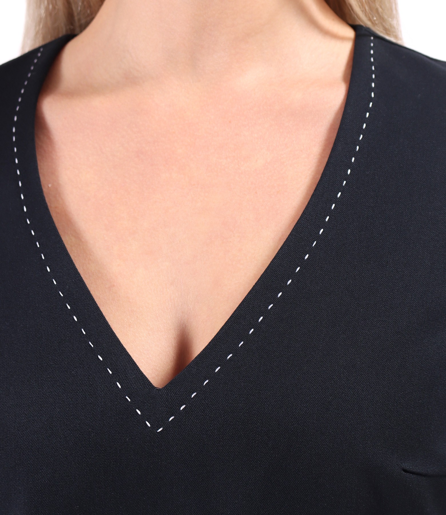 Rochie office din stofa elastica cu viscoza, captusita, cu maneci 3/4, decolteu in V, buzunare laterale si cusatura decorativa in contrast la decolteu si terminatie maneci. Rochia are slit pe mijloc spate. Se inchide cu fermoar ascuns pe mijloc spate.