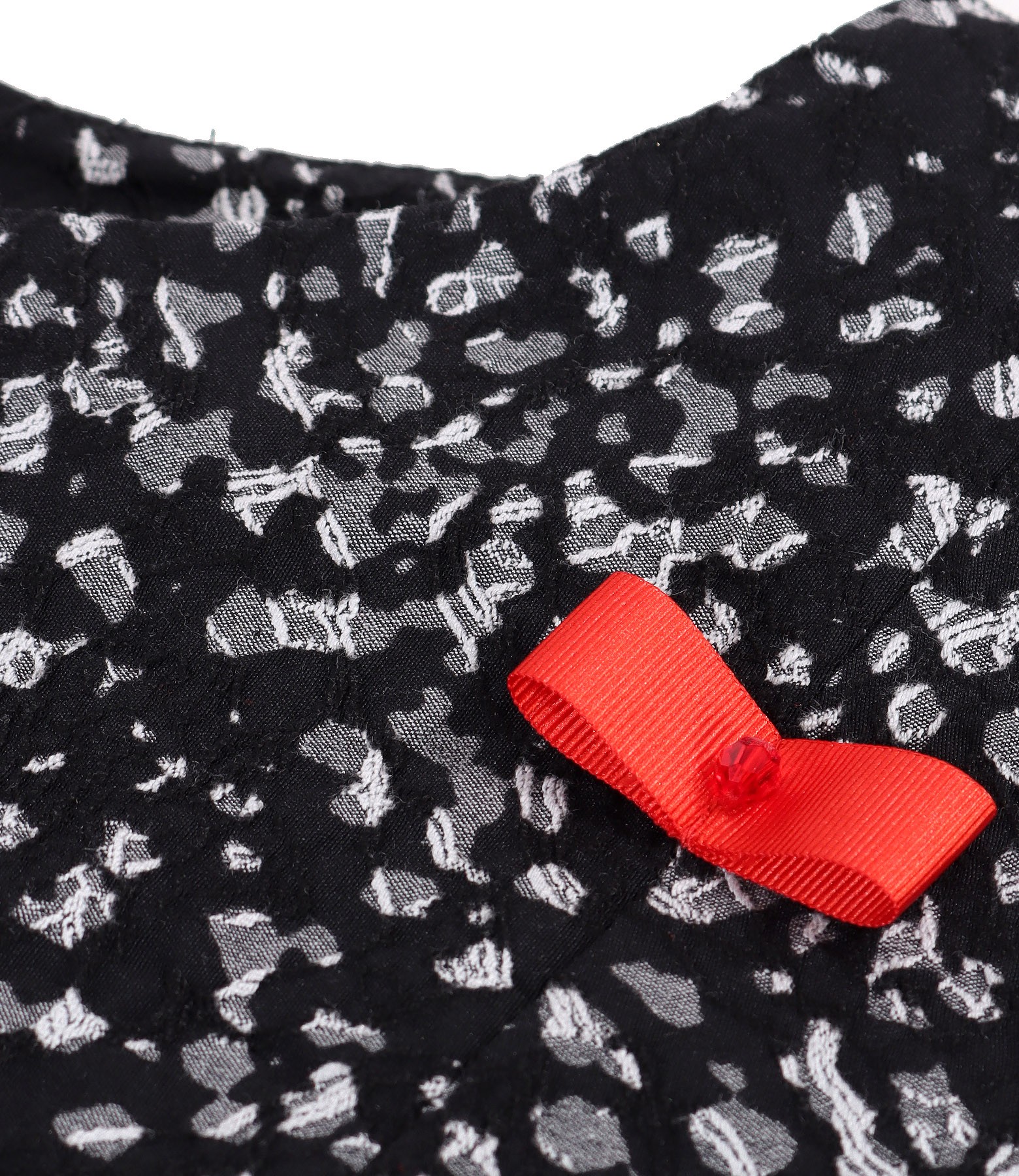 Rochie office usor evazata din stofa plina brocata, cu viscoza si elastan, necaptusita, cu maneci midi si decolteu rotund decorat cu funda din rips si cristal. Se inchide cu fermoar ascuns pe mijloc spate.
