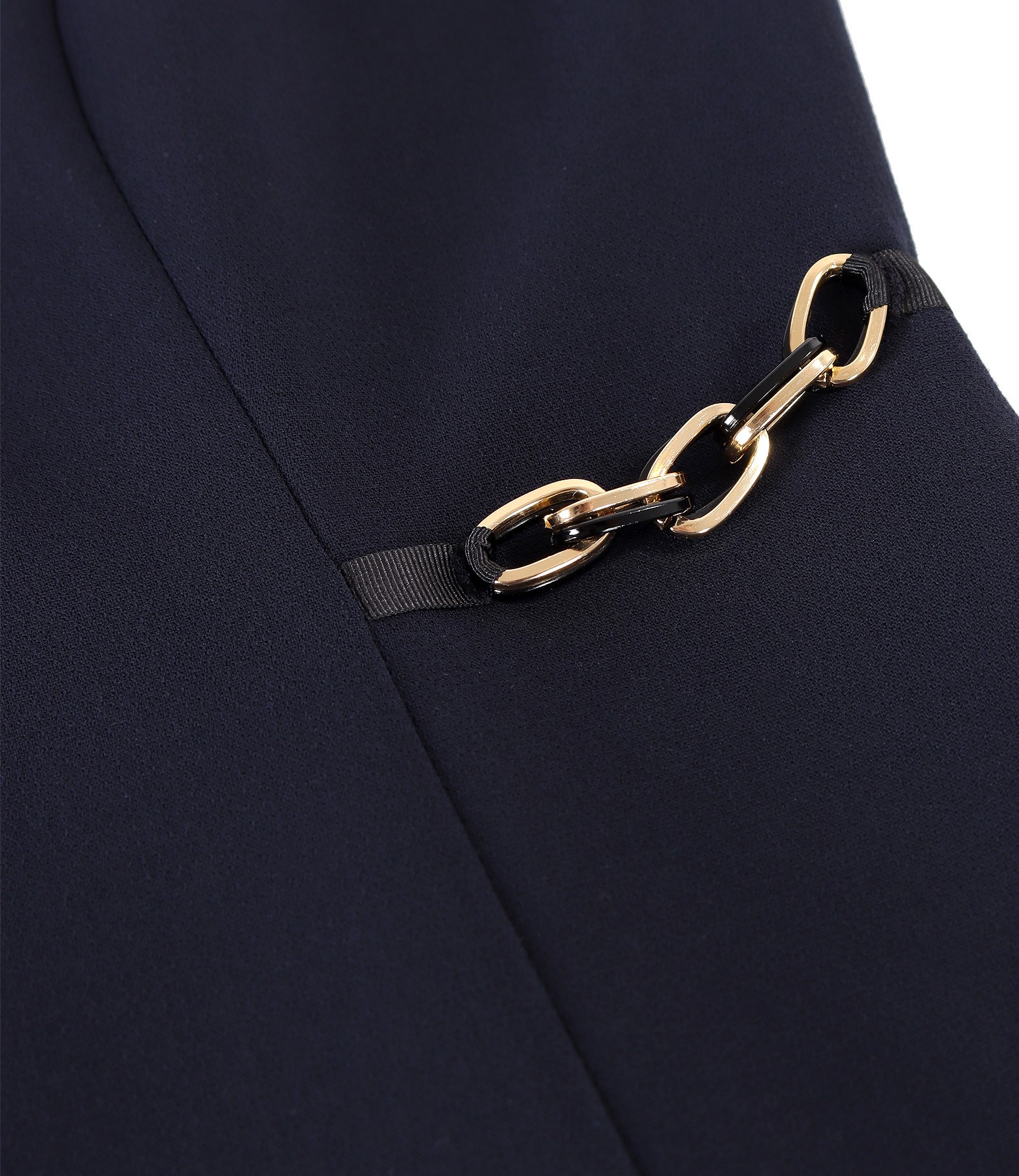 Rochie office evazata din stofa elastica, captusita, cu maneci 3/4, decolteu rotund si lant decorativ in talie. Se inchide cu fermoar ascuns pe mijloc spate.