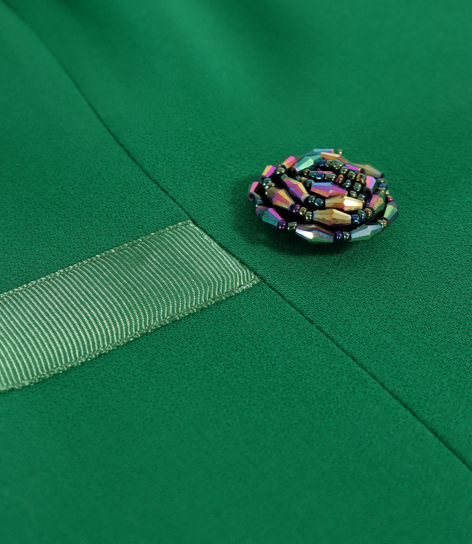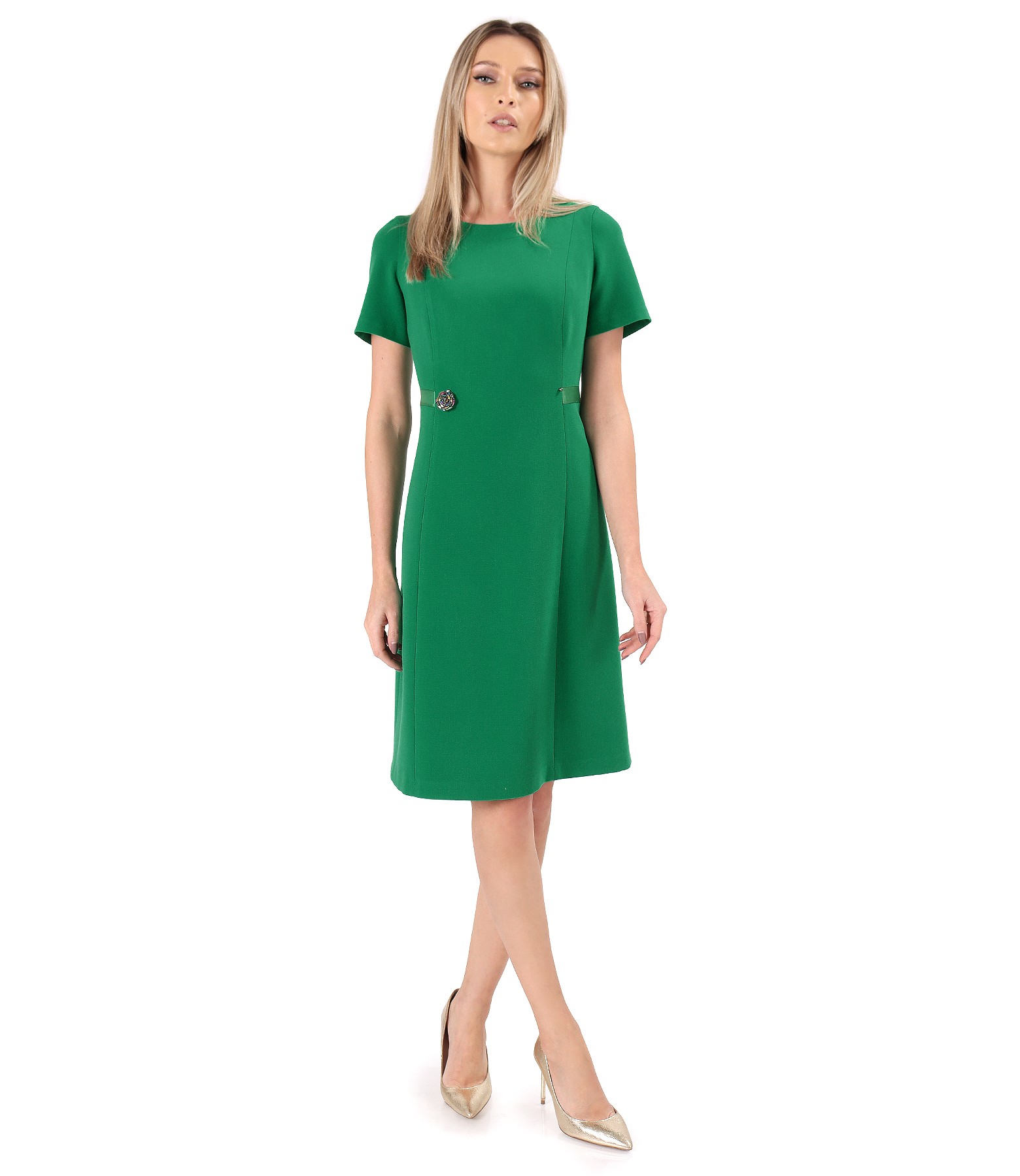 Rochie office evazata din stofa elastica cu viscoza, captusita, cu maneci scurte, decolteu rotund si ornament decorativ cu rips in talie. Se inchide cu fermoar ascuns pe mijloc spate.