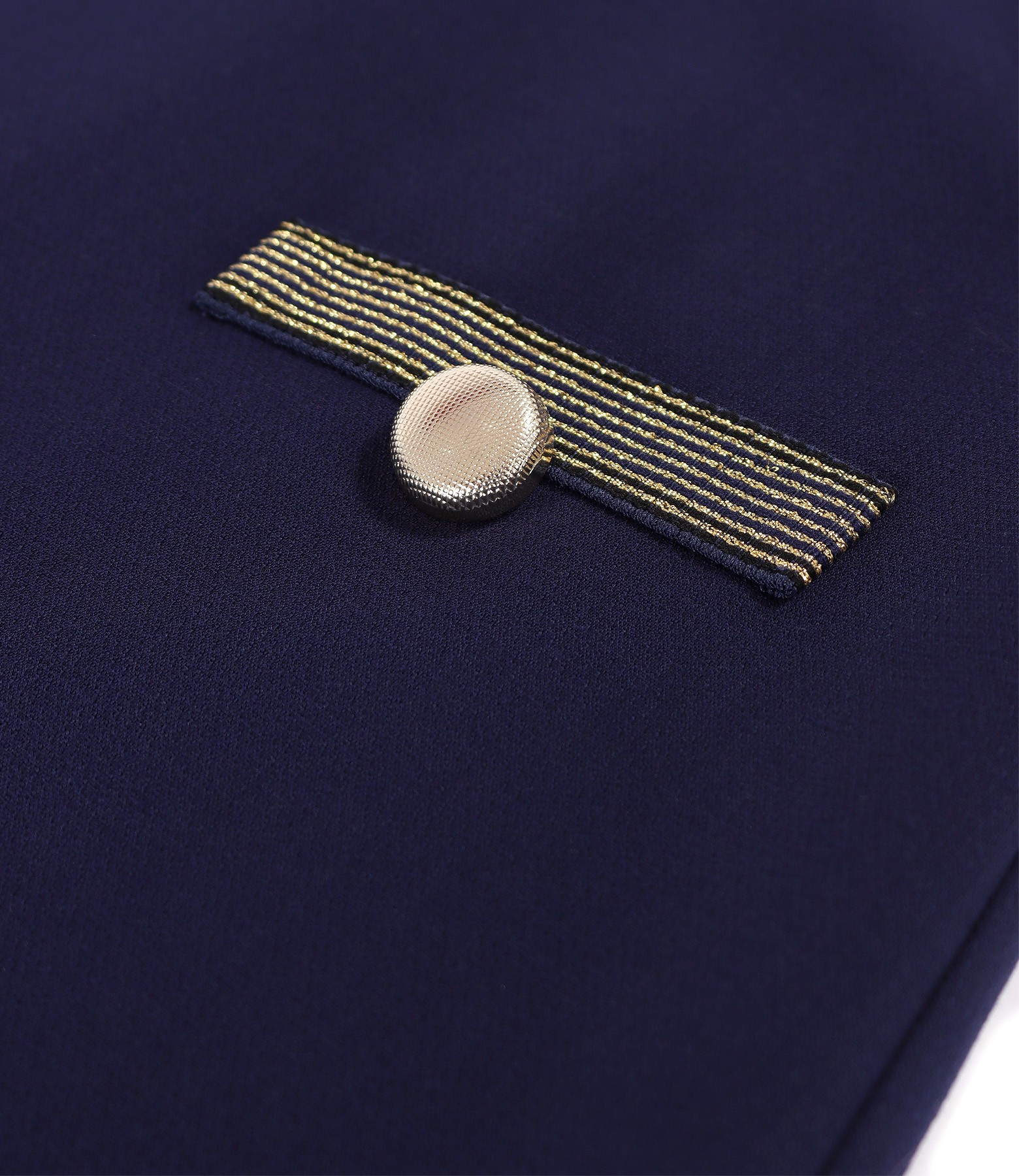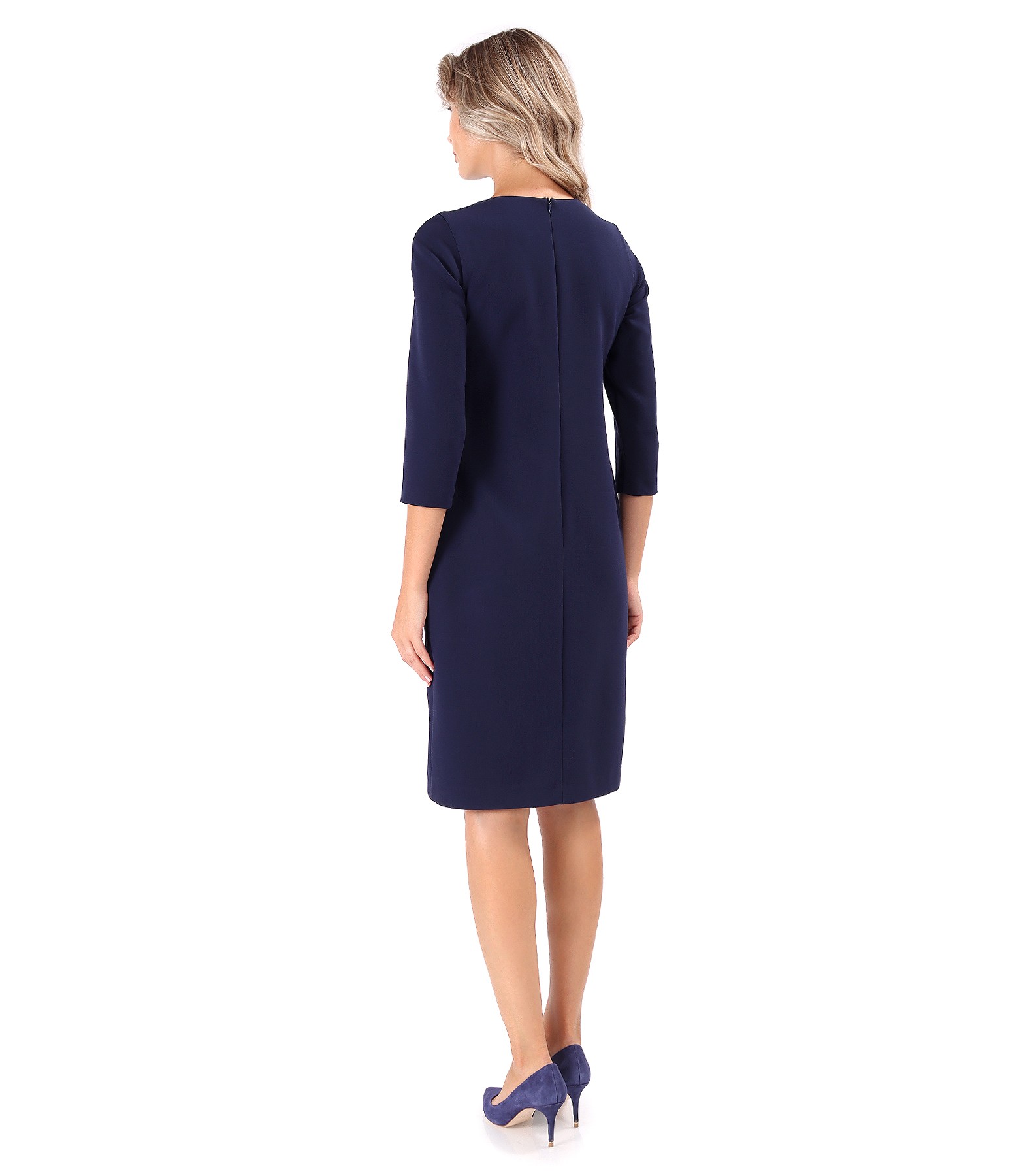 Rochie office evazata din stofa elastica cu viscoza, captusita, cu maneci 3/4, decolteu rotund si nasture decorativ cu rips in talie. Se inchide cu fermoar ascuns pe mijloc spate.