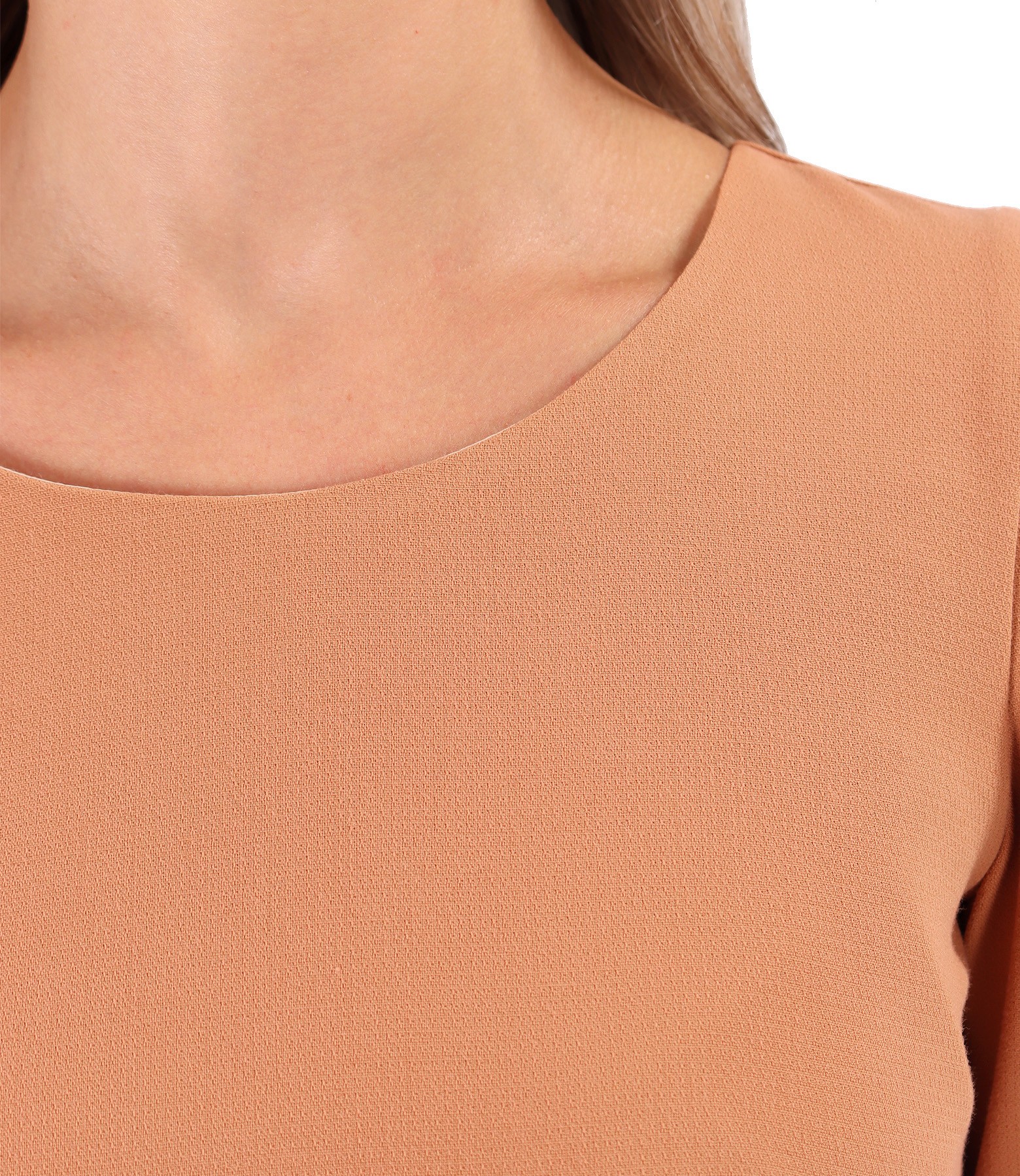 Rochie office evazata din stofa elastica cu viscoza, captusita, cu maneci 3/4, decolteu rotund si nasture decorativ cu rips in talie. Se inchide cu fermoar ascuns pe mijloc spate.
