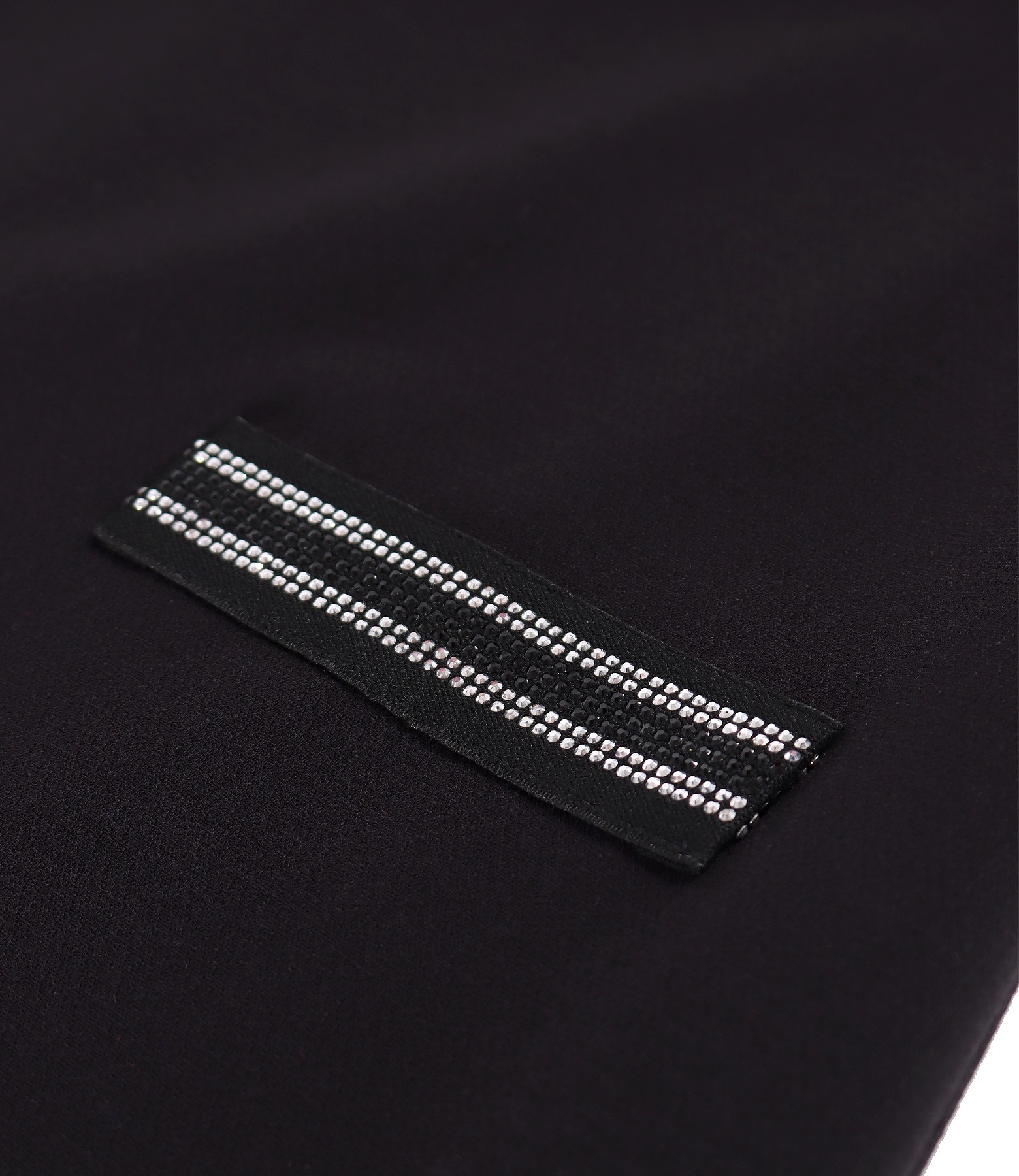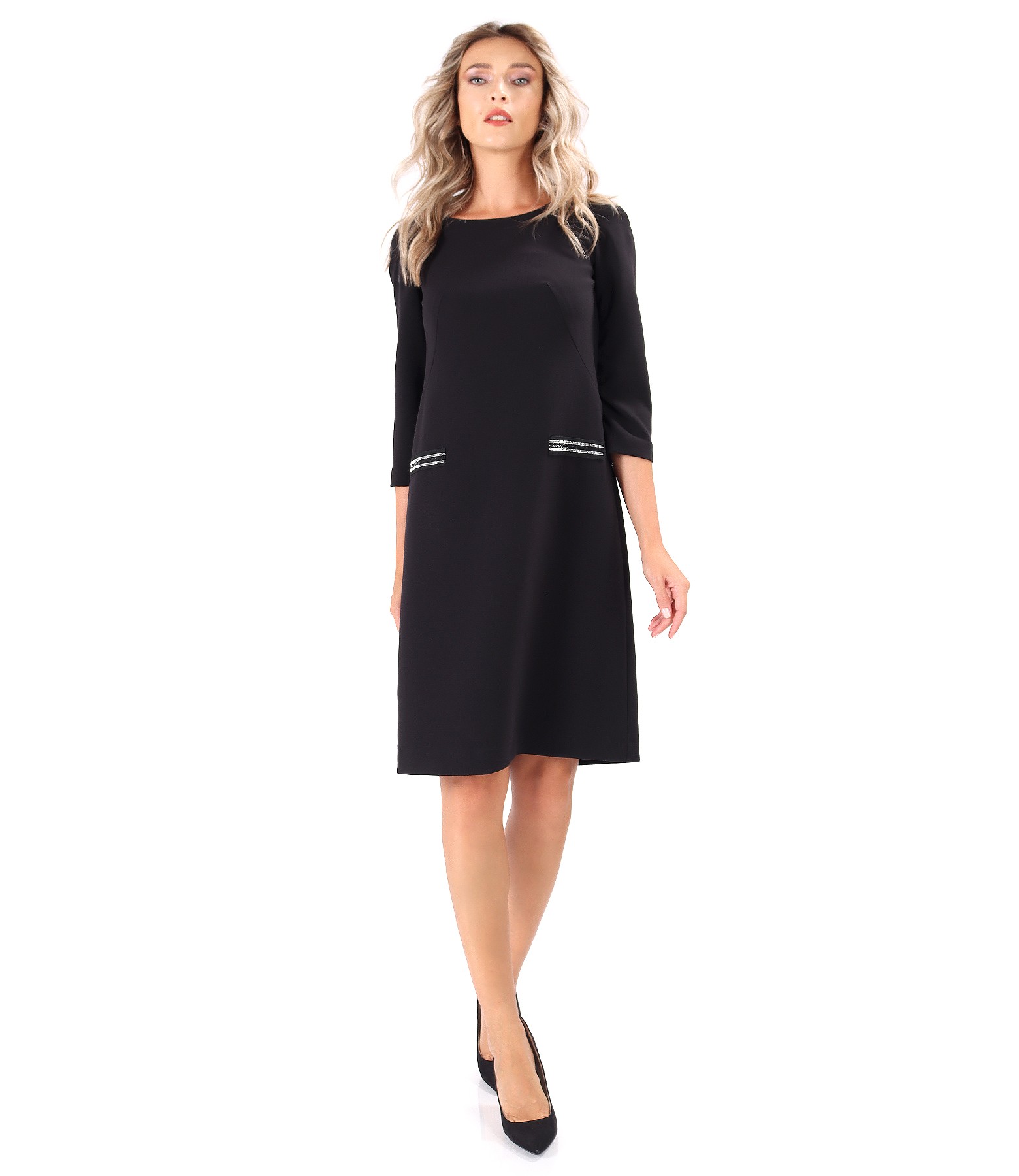 Rochie office evazata din stofa elastica cu viscoza, captusita, cu maneci 3/4, decolteu rotund si elastic cu cristale in talie. Se inchide cu fermoar ascuns pe mijloc spate.