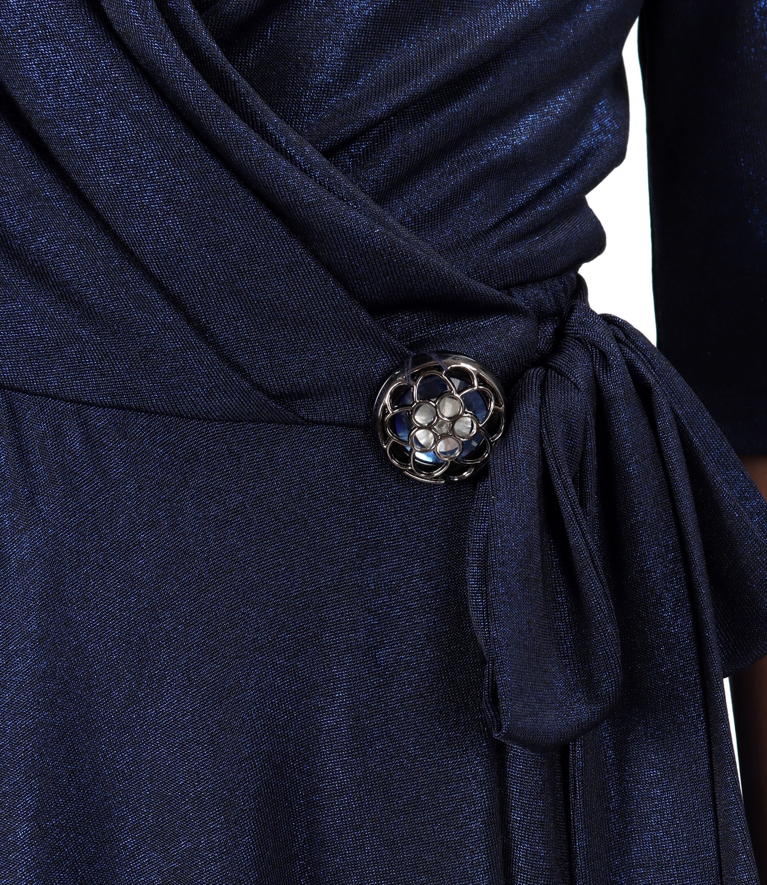 Rochie midi petrecuta, din jerse elastic cu efect lucios, dublata in partea de sus cu jerse elastic, cu maneci 3/4 si cu cordon in talie si brosa. Se inchide cu un cordon in talie.