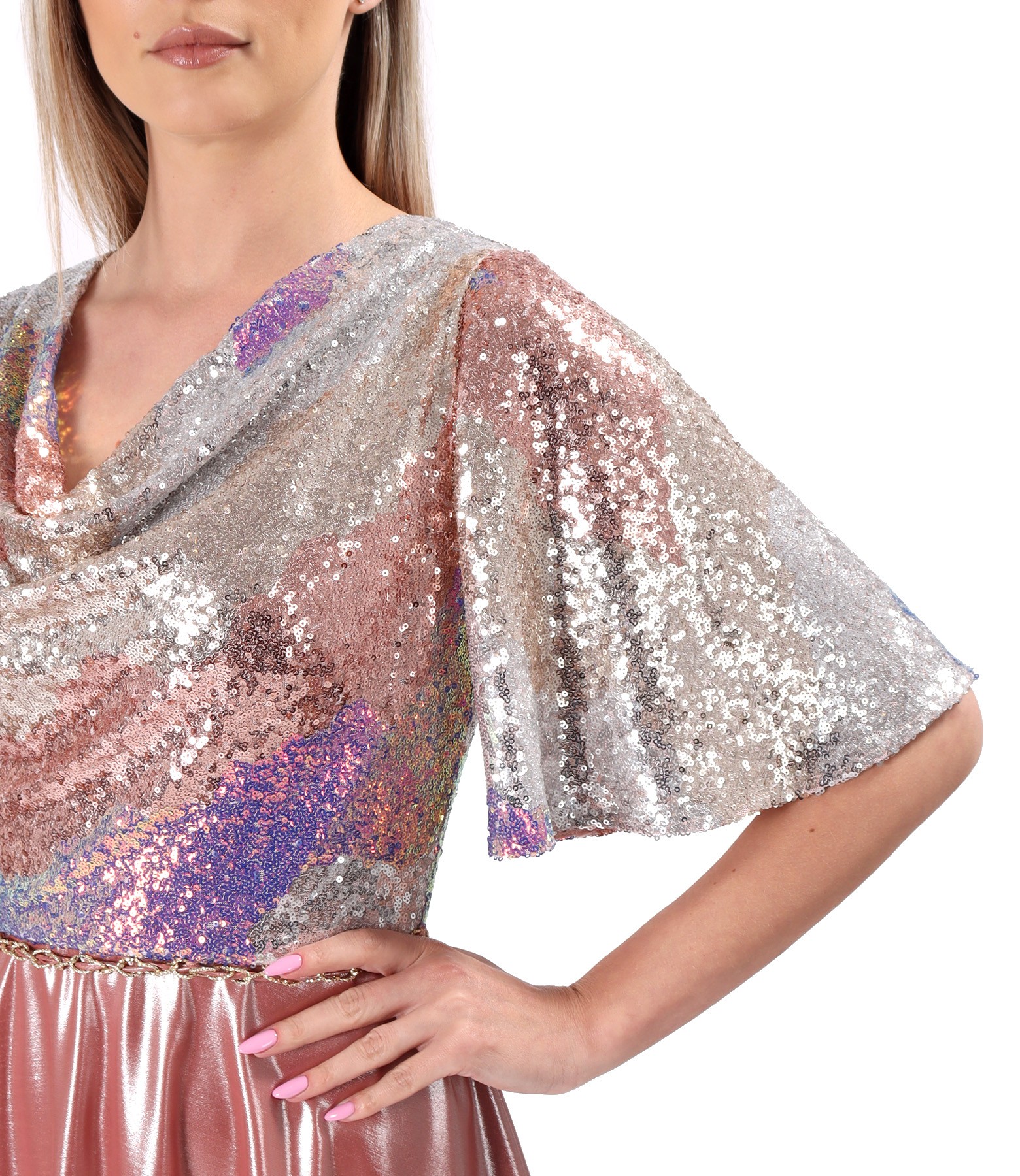 Rochie scurta de ocazie cu bust si maneci ample cu paiete, cu fusta din voal sidefat, captusita cu saten elastic si cu falduri la decolteu. Are lant decorativ auriu in talie. Se inchide cu fermoar ascuns pe mijloc spate.