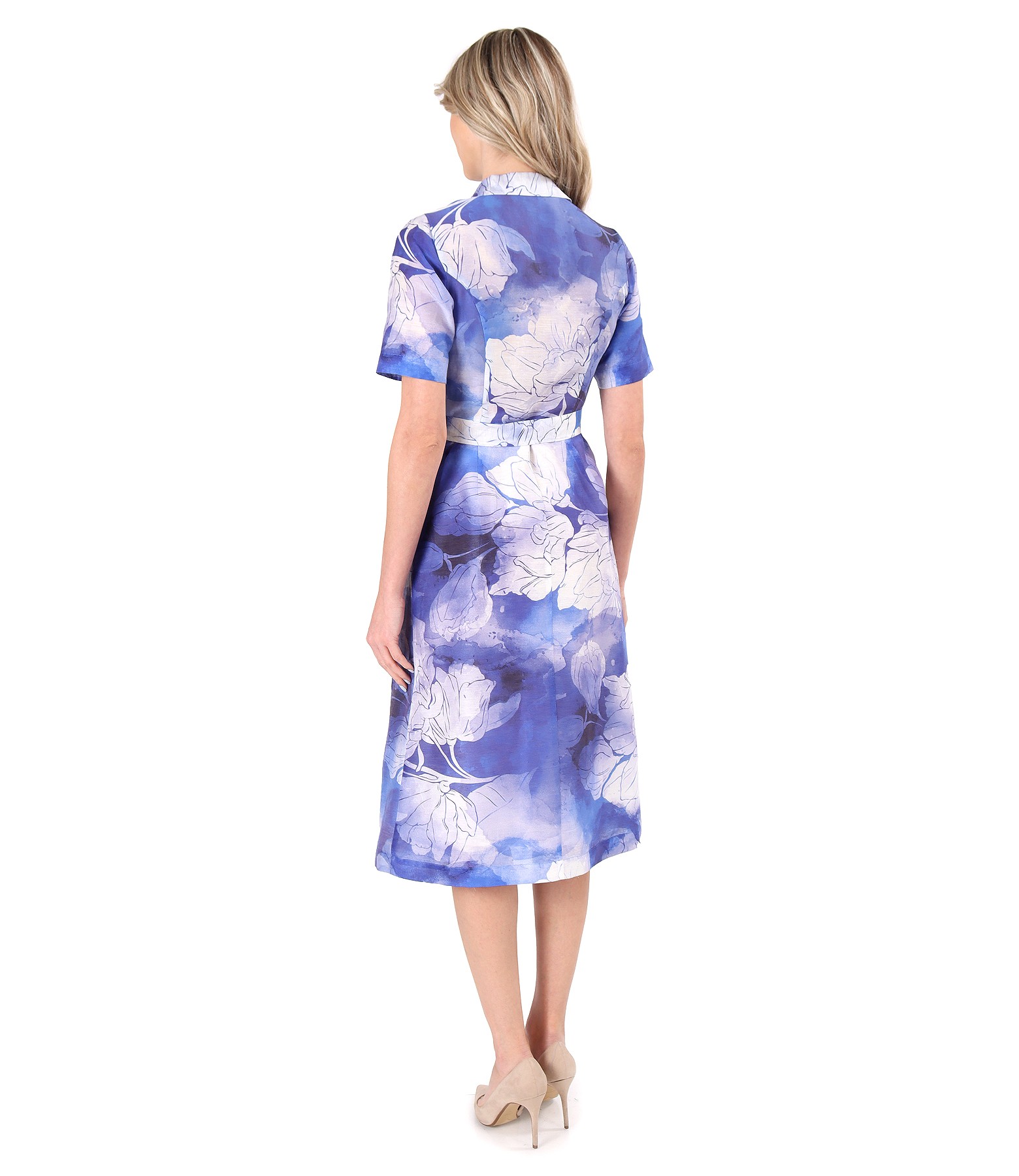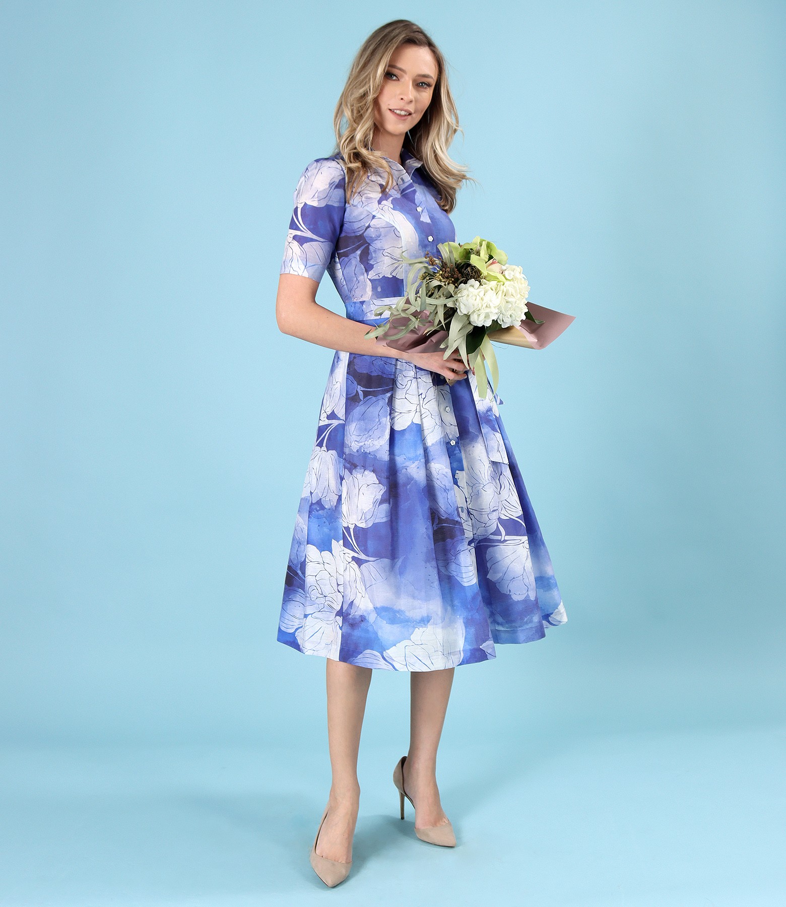 Rochie tip camasa din bumbac cu in imprimat digital cu motive florale, dublata cu viscoza doar in partea de jos, cu pliuri pe fata, maneci scurte, cordon in talie si buzunare laterale. Se inchide cu 12 nasturi pe mijloc fata.