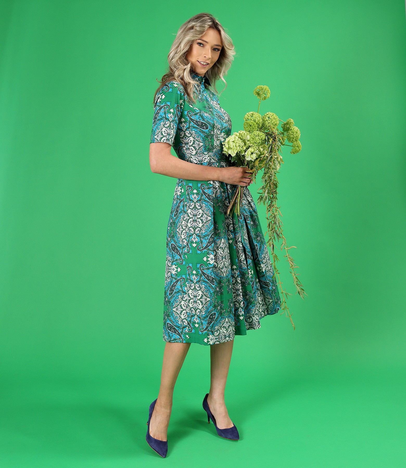 Rochie tip camasa din bumbac elastic imprimat cu lire (Verde), marimea