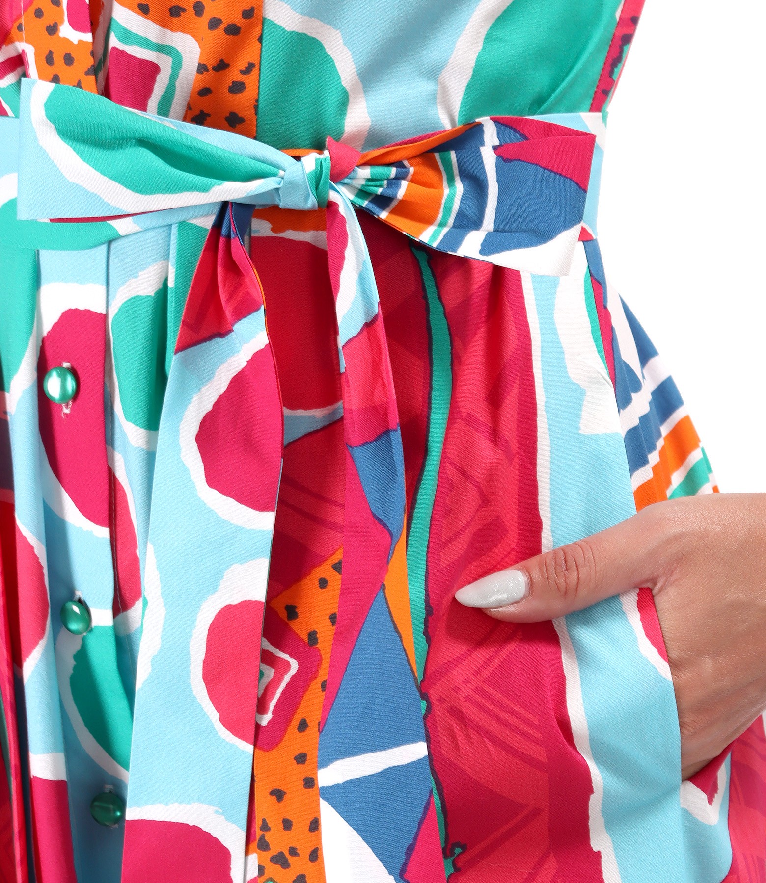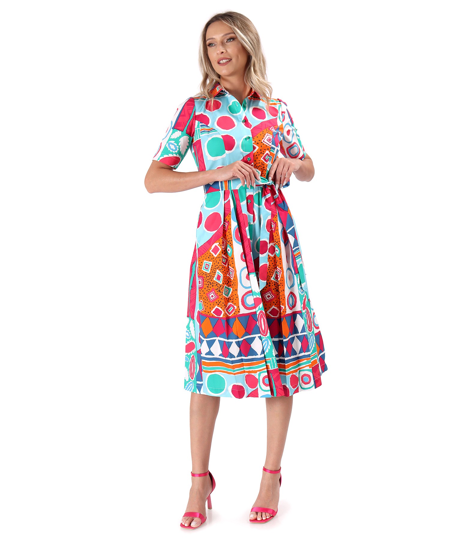 Rochie tip camasa din bumbac elastic imprimat digital cu motive geometrice, decupata, cu pliuri laterale pe fata si pe spate, maneci scurte si cordon in talie. Rochia are buzunare laterale. Se inchide cu 12 nasturi pe mijloc fata. Pozitia imprimeului variaza per produs.