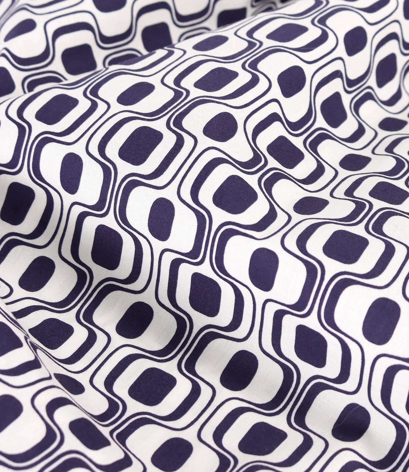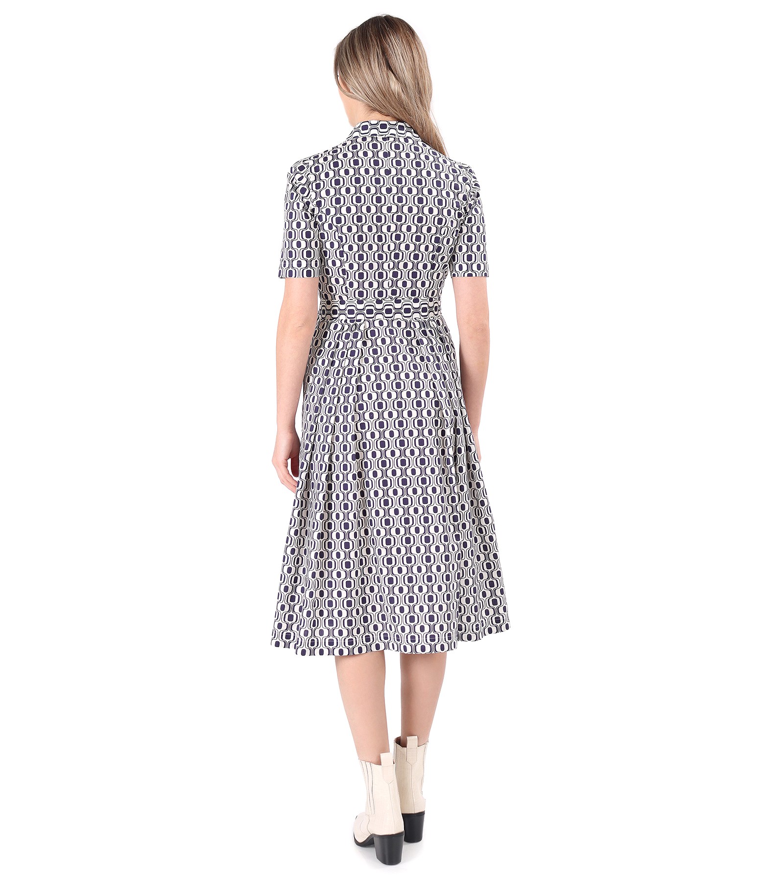 Rochie tip camasa din bumbac elastic imprimat digital cu motive geometrice, necaptusita, cu pliuri pe fata si pe spate, maneci scurte si cordon in talie. Se inchide cu 12 nasturi pe mijloc fata.
