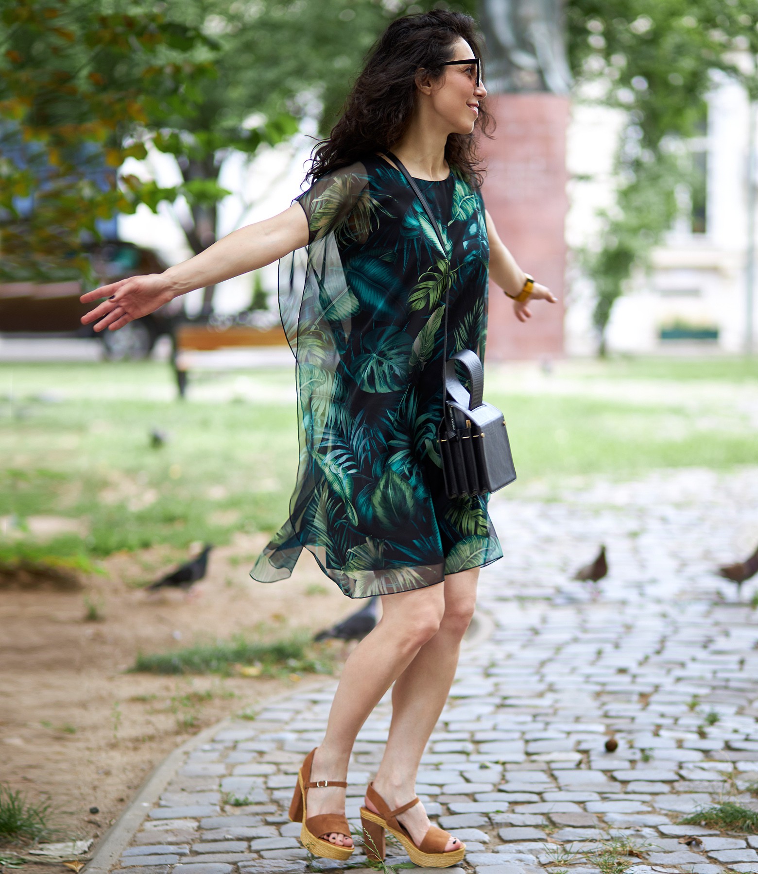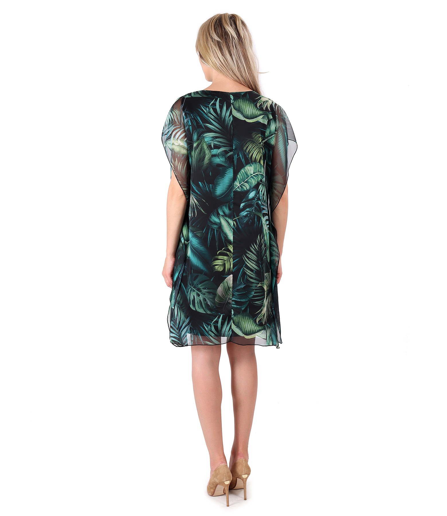 Rochie tip fluture din voal imprimat cu motive florale, dublata cu viscoza, fara maneci si cu decolteu rotund. Nu are sistem de inchidere.