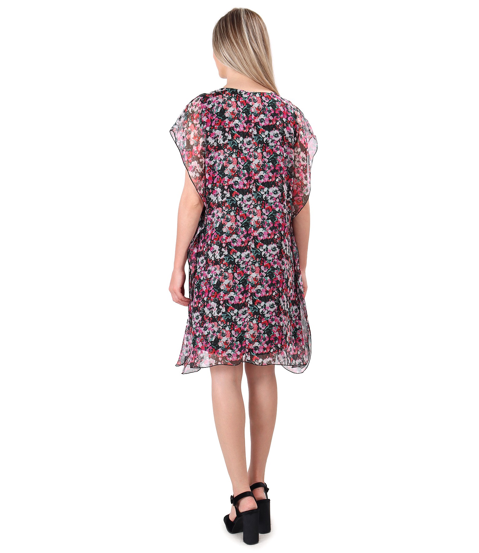 Rochie tip fluture din voal imprimat cu motive florale, dublata cu viscoza, fara maneci si cu decolteu rotund. Nu are sistem de inchidere.