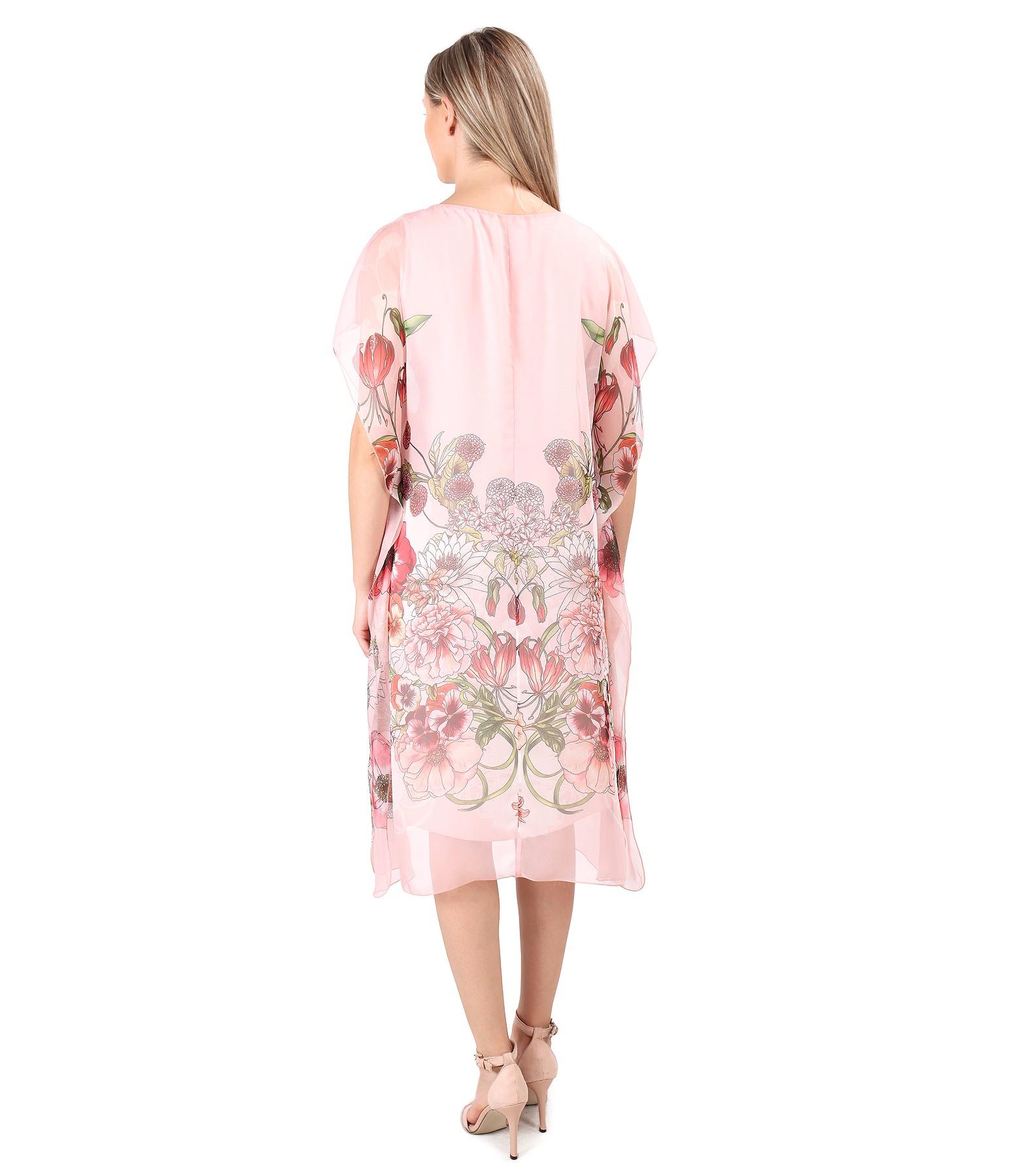 Rochie tip fluture din voal imprimat cu motive florale, dublata cu viscoza, fara maneci si cu decolteu rotund. Nu are sistem de inchidere. Pozitia imprimeului variaza per produs.