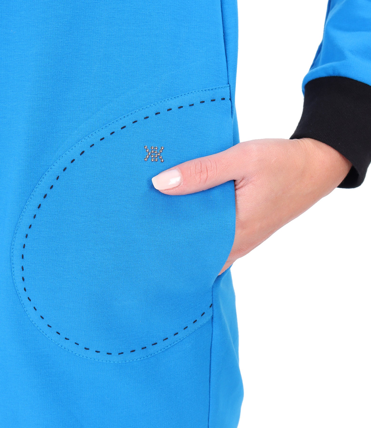 Rochie tip hanorac din bumbac elastic uni, necaptusita, cu buzunare laterale cu cusatura in contrast, cu maneci lungi, decolteu rotund, cu garnitura la decolteu si terminatii maneci si elastic la terminatie produs.