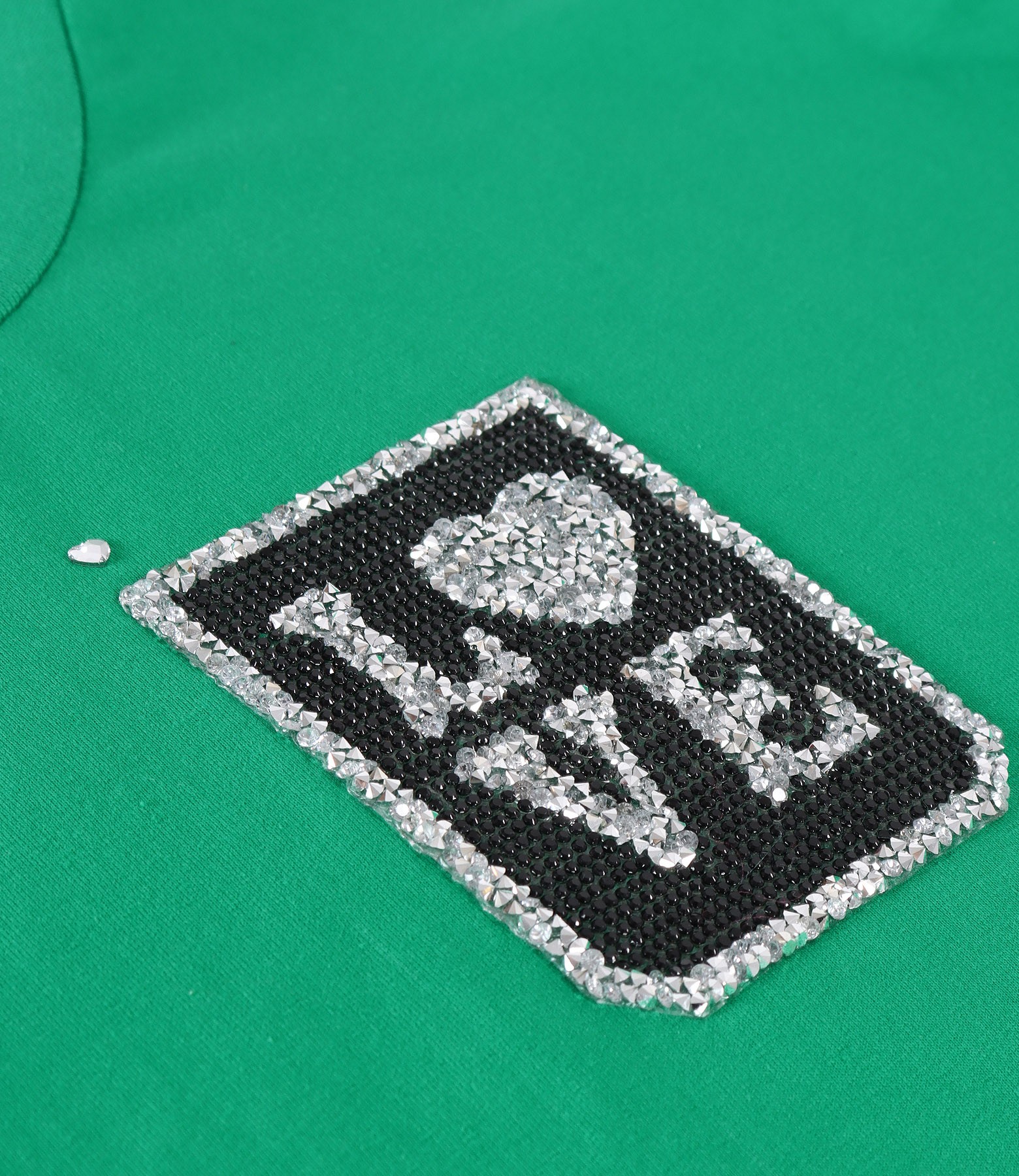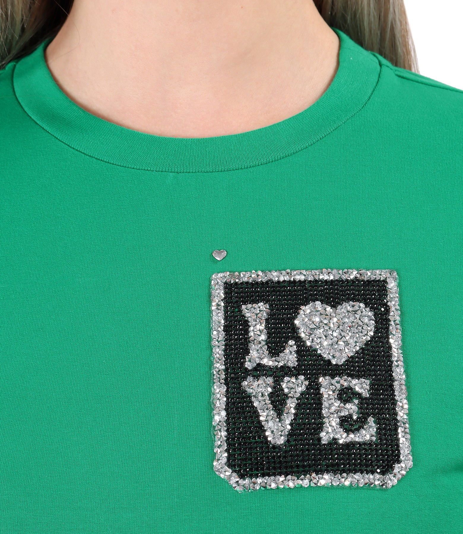 Rochie tip hanorac, din bumbac uni, cu maneci lungi, decolteu rotund si aplicatie decorativa cu cristale pe fata.