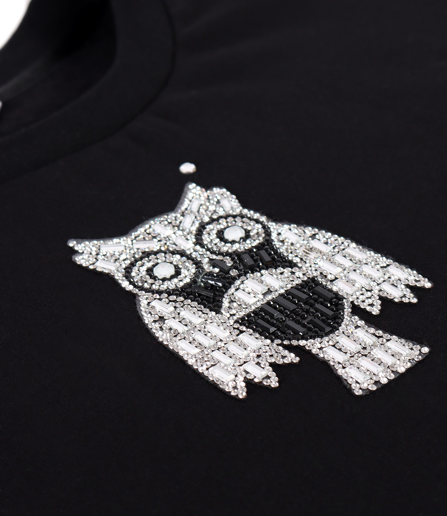 Rochie tip hanorac, din bumbac uni, cu maneci lungi, decolteu rotund si aplicatie decorativa cu cristale pe fata.