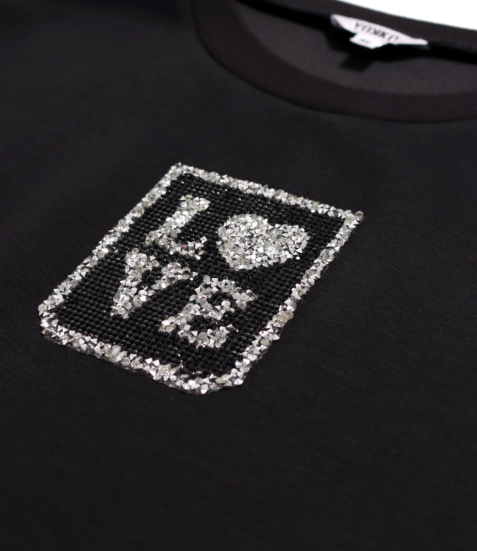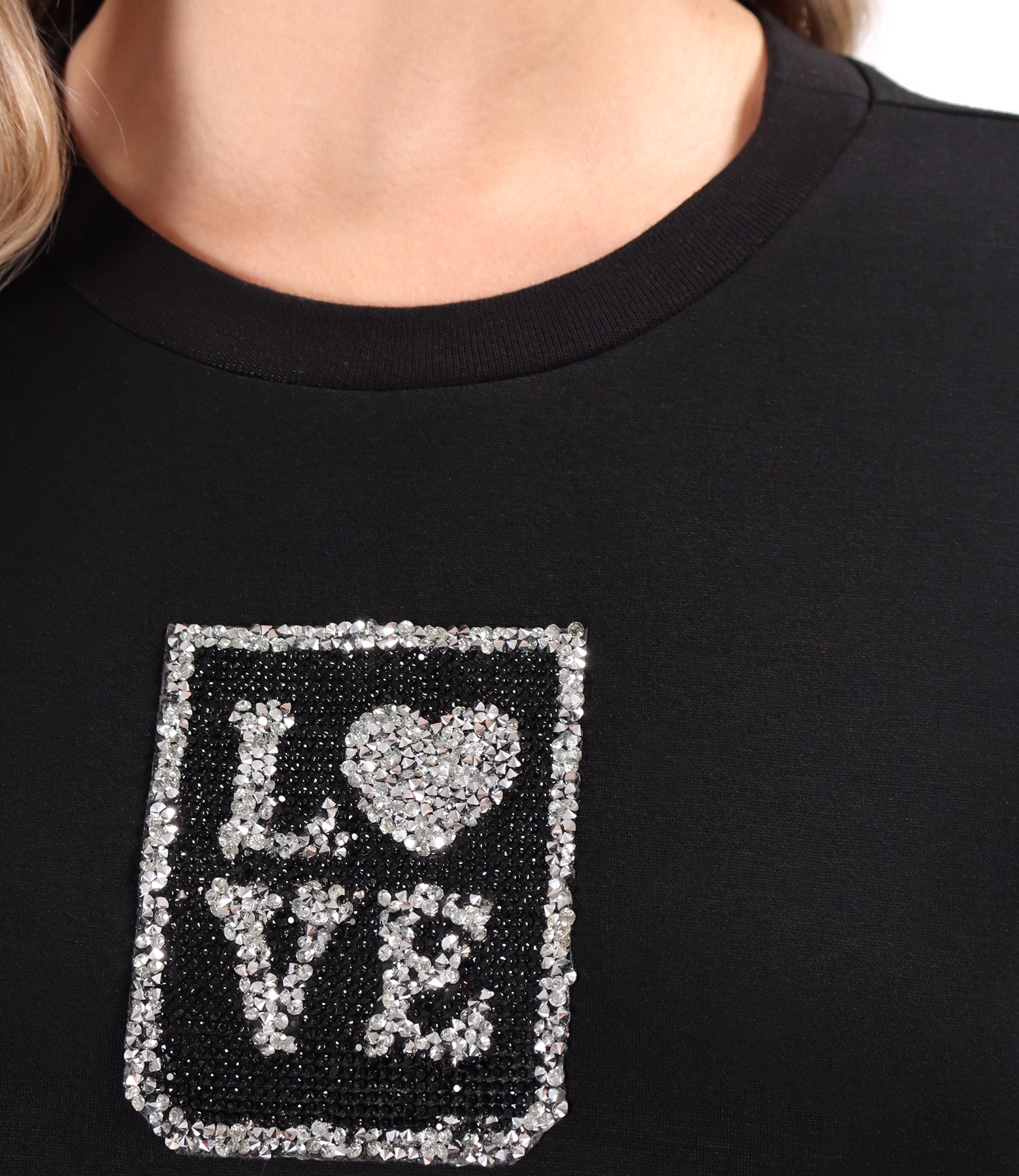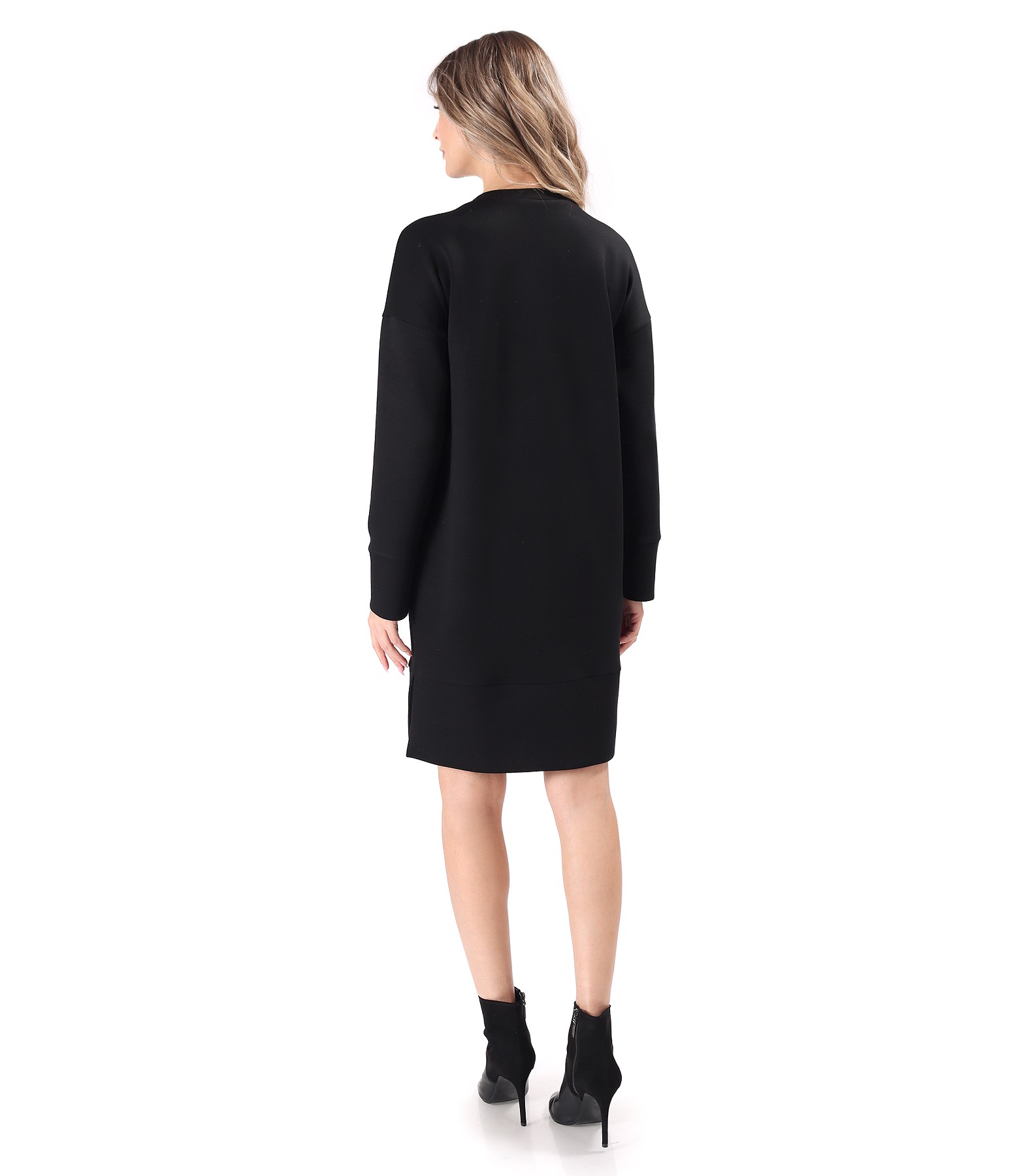 Rochie tip hanorac din scuba cu viscoza cu buzunar pe fata, cu maneci lungi si decolteu rotund cu aplicatie de cristale si cu slituri pe lateral.