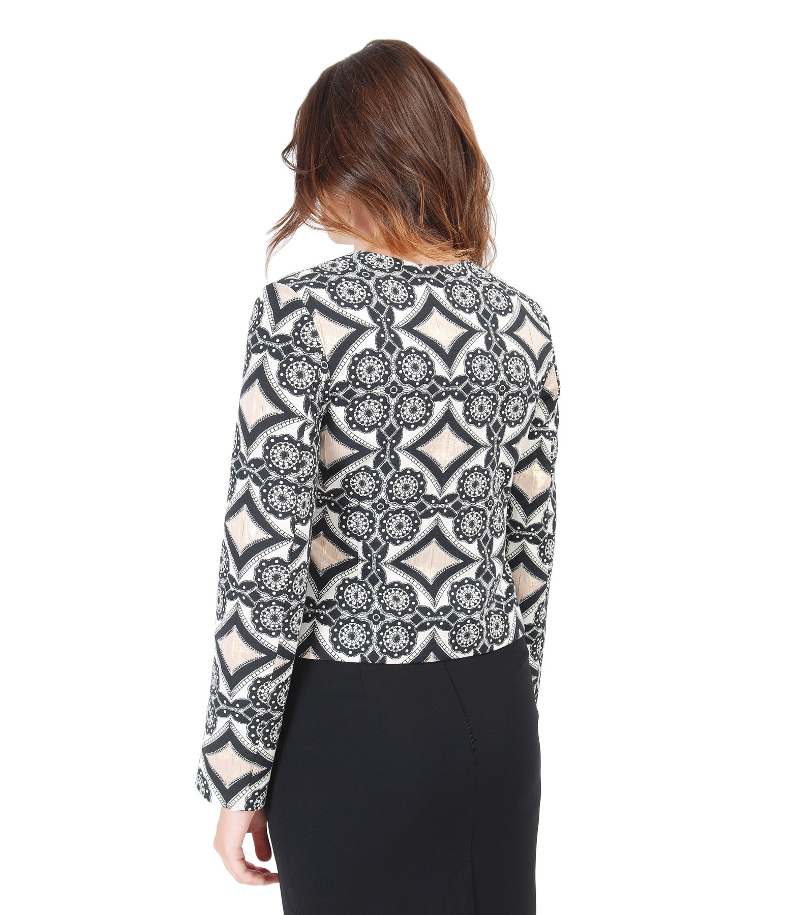 Sacou elegant din brocart de bumbac cu fir metalic, fara guler, cu clini laterali fata si spate. Se inchide cu 4 capse mos-baba pe fata, pana la nivelul bustului. Pozitia imprimeului difera per produs.