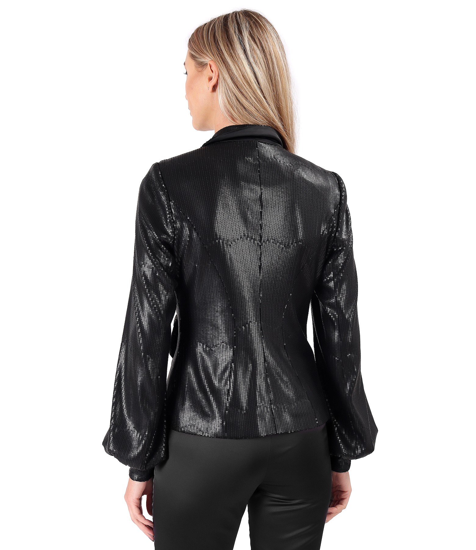 Sacou de ocazie din paiete cu brosa detasabila lucrata manual,captusit, cu maneci lungi ample cu mansete si cu decolteu adanc. Se inchide cu doua capse pe fata.