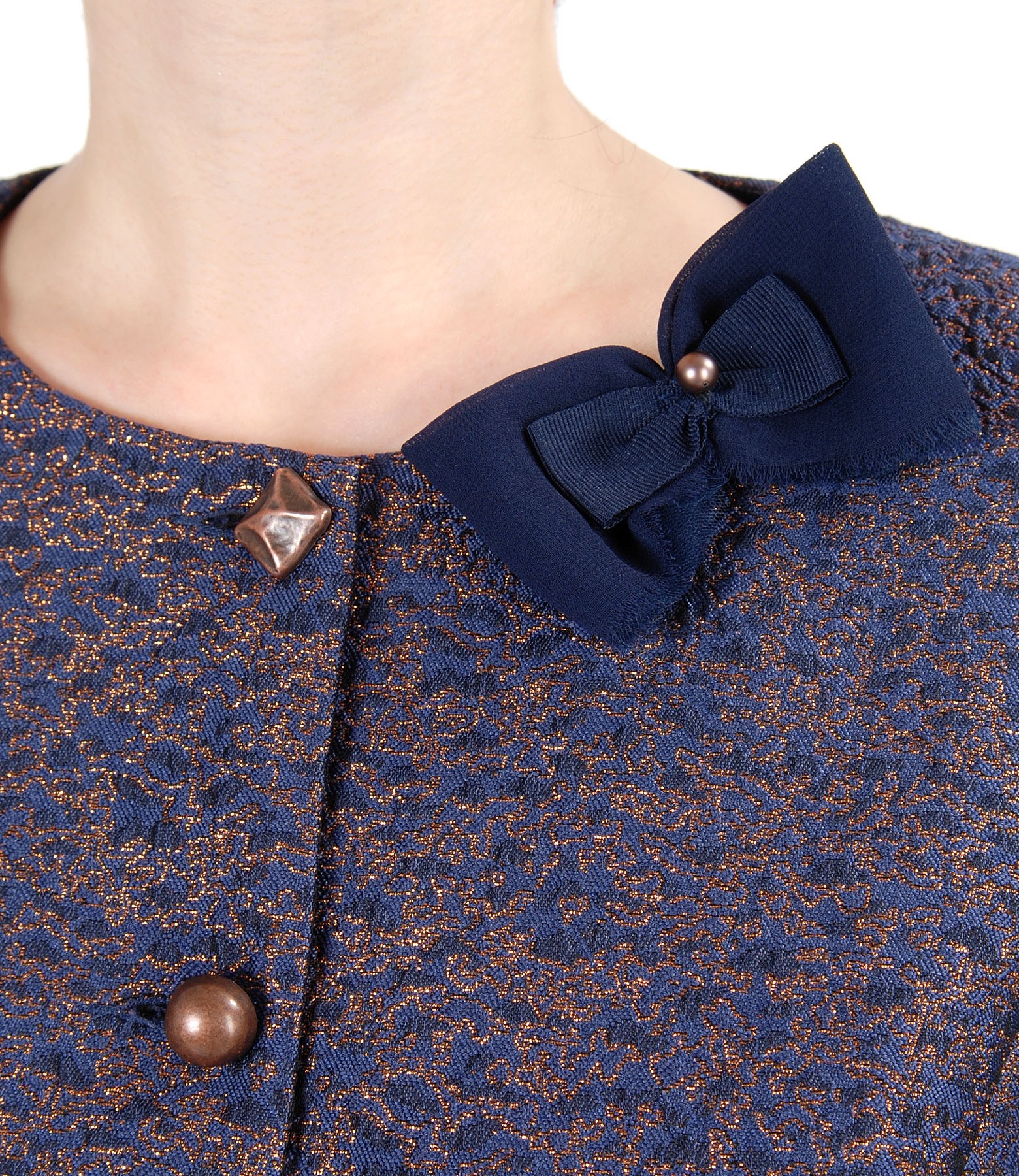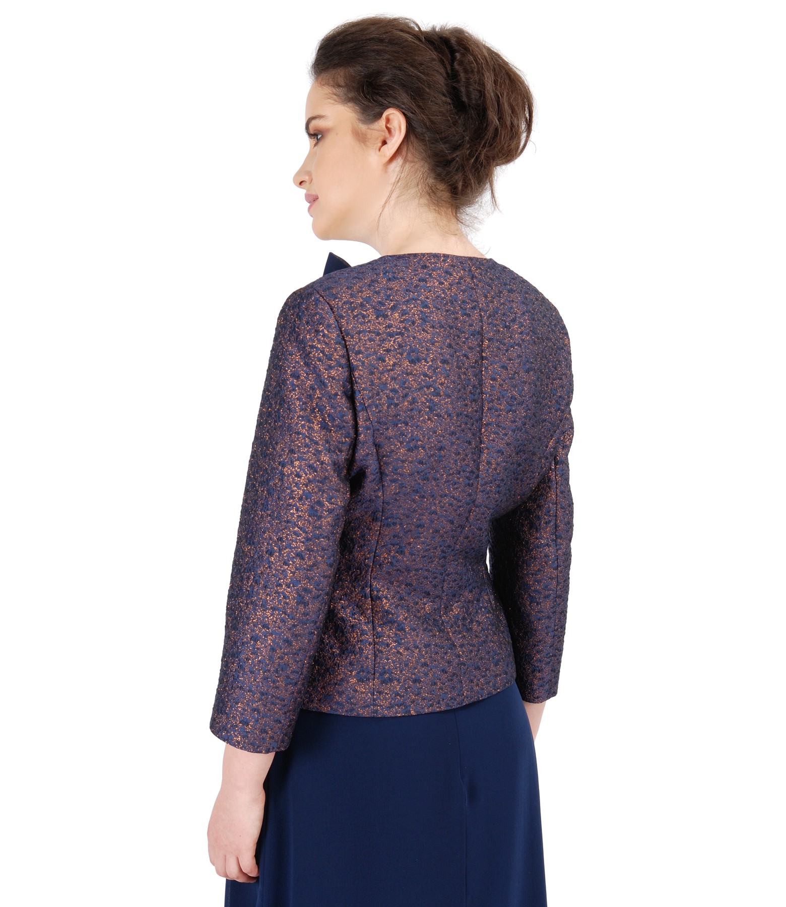 Sacou de ocazie din stofa brocata cu fir aramiu, captusit, fara guler si revere, cu maneci 3/4 si funda din voal detasabila. Se inchide pe fata cu 5 nasturi metalici.