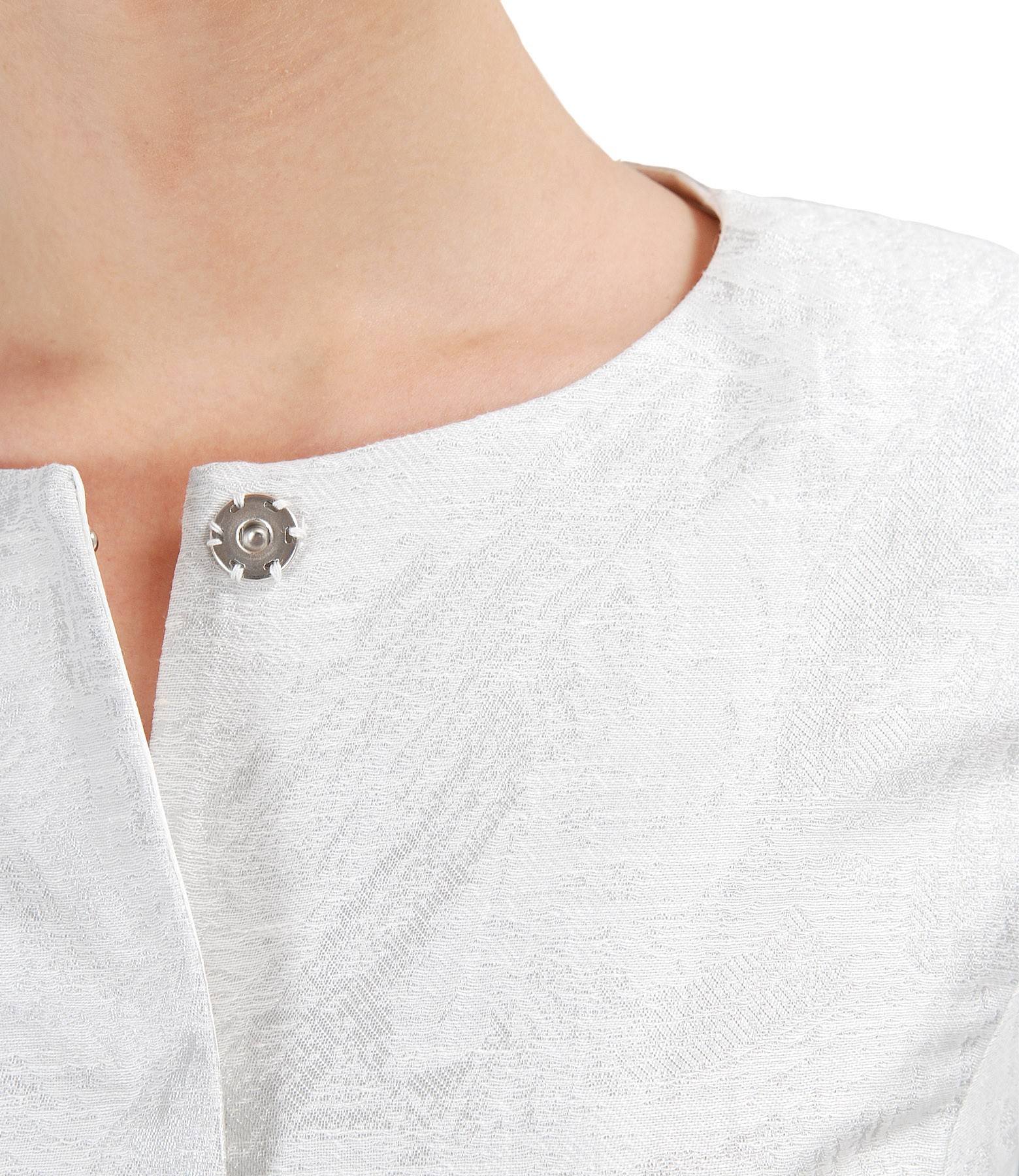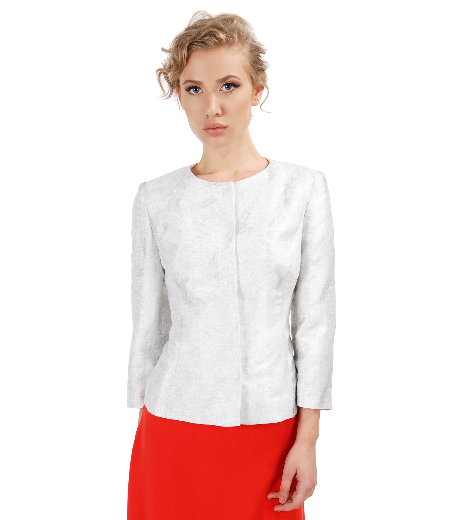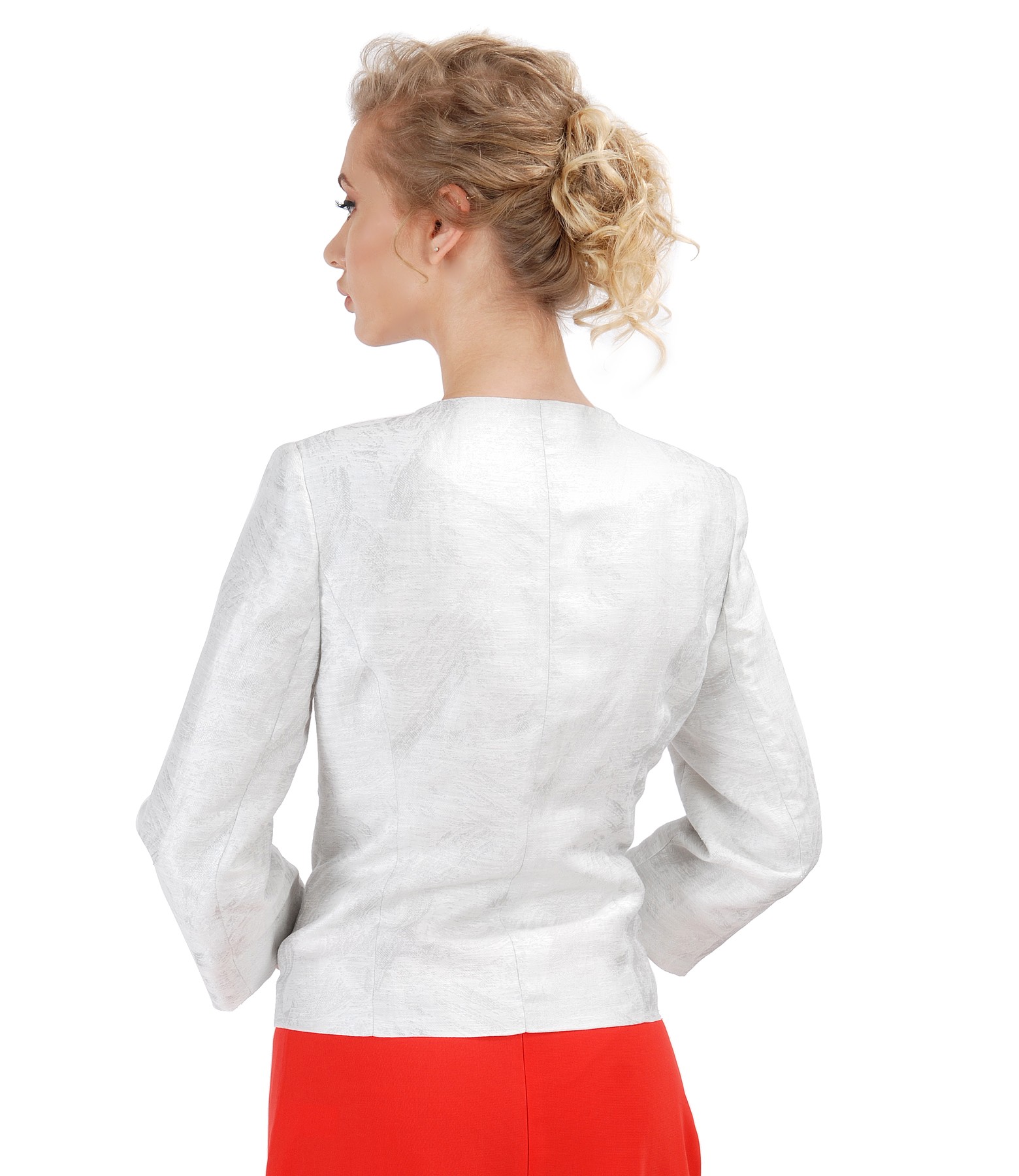 Sacou de ocazie din stofa brocata cu in, captusit, fara guler si revere, si cu maneci 3/4. Se inchide pe fata cu 5 capse mos-baba.