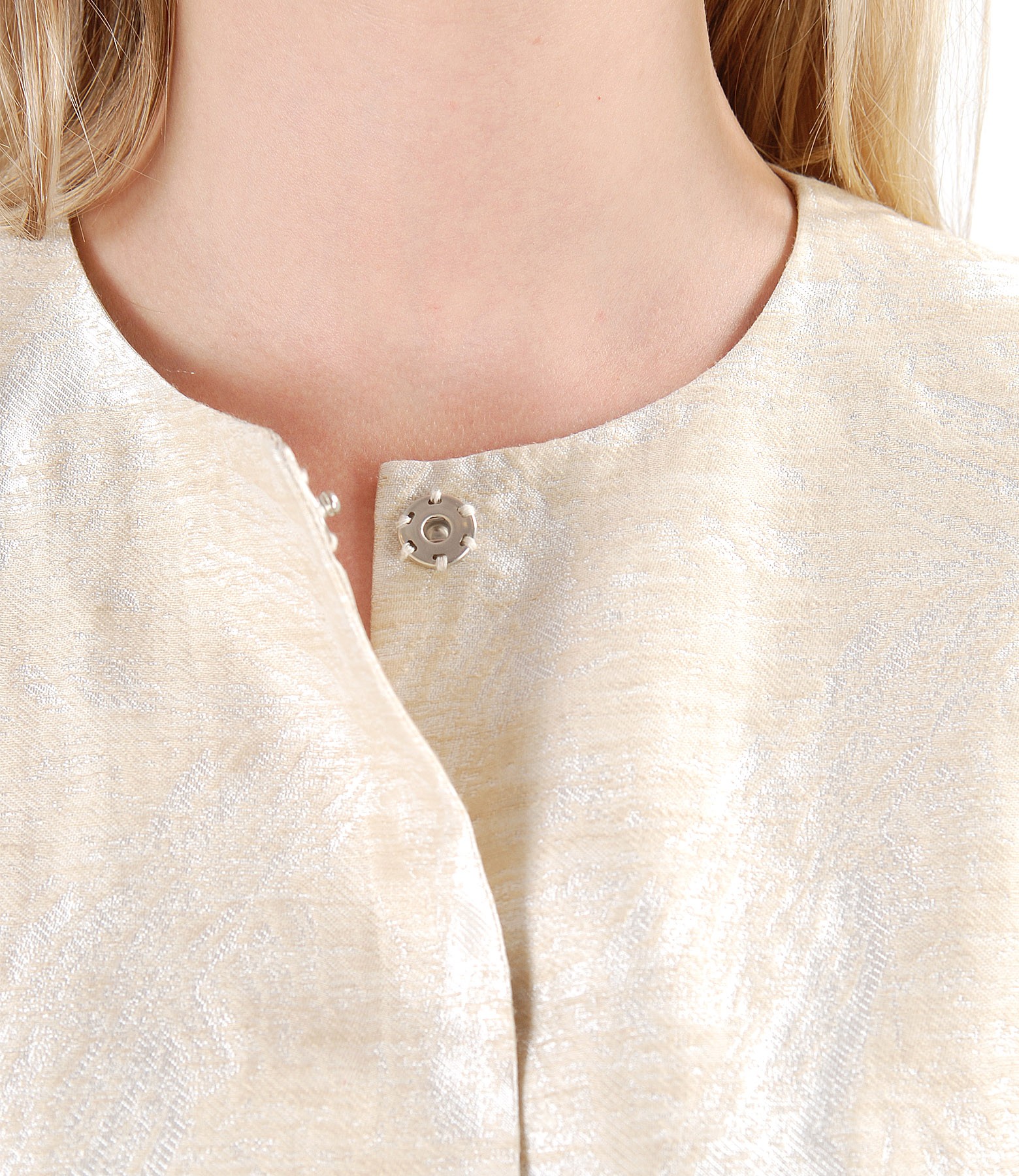 Sacou de ocazie din stofa brocata cu in, captusit, fara guler si revere, si cu maneci 3/4. Se inchide pe fata cu 5 capse mos-baba.