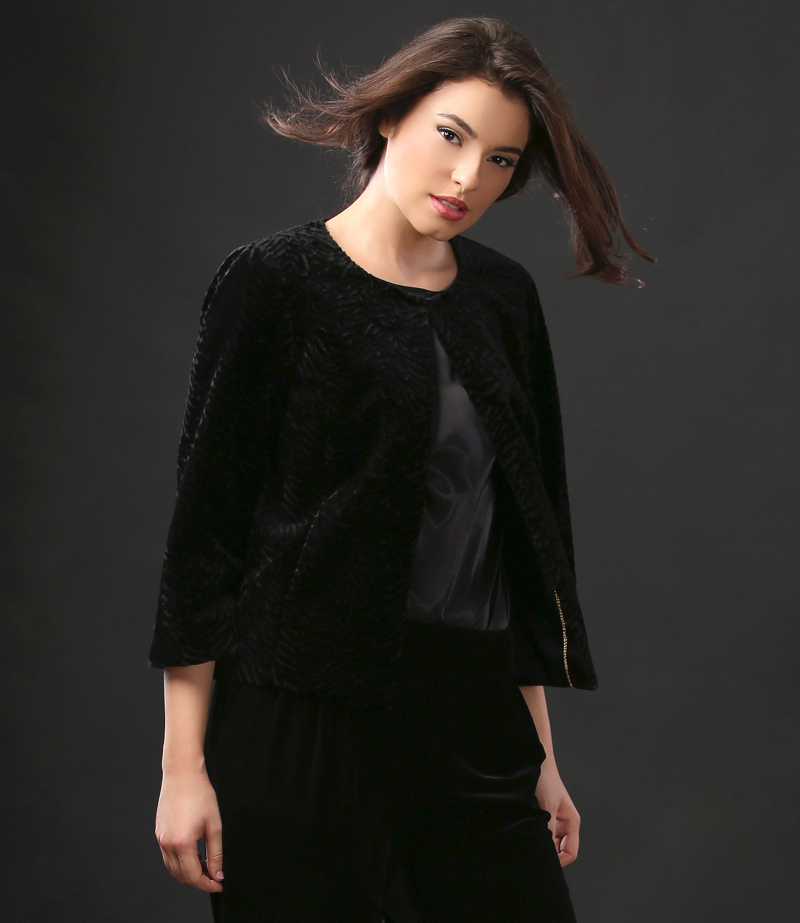 Sacou din blana ecologica cu structura tip astrahan, captusit, fara guler si revere, cu buzunare laterale si maneci 3/4. Se inchide pe fata cu 5 anouri mos-baba.