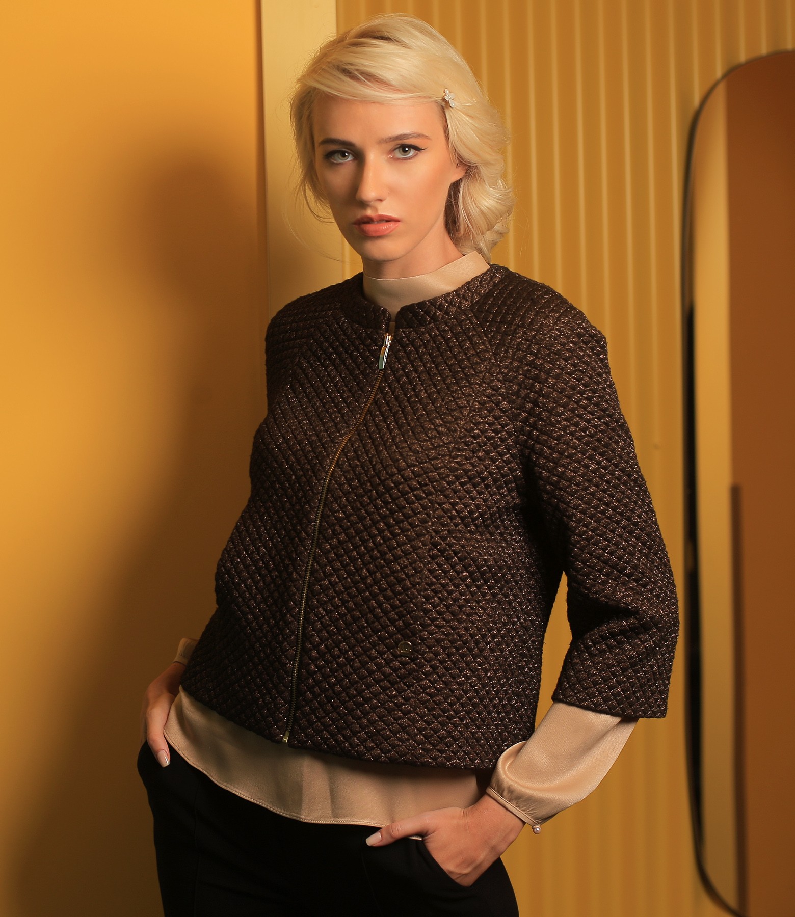 Bolero din brocart elastic cu motive geometrice si cu fir de efect aramiu, captusit, cu guler gen tunica, maneci 3/4 si buzunare ascunse verticale. Se inchide cu un fermoar metalic pe fata.