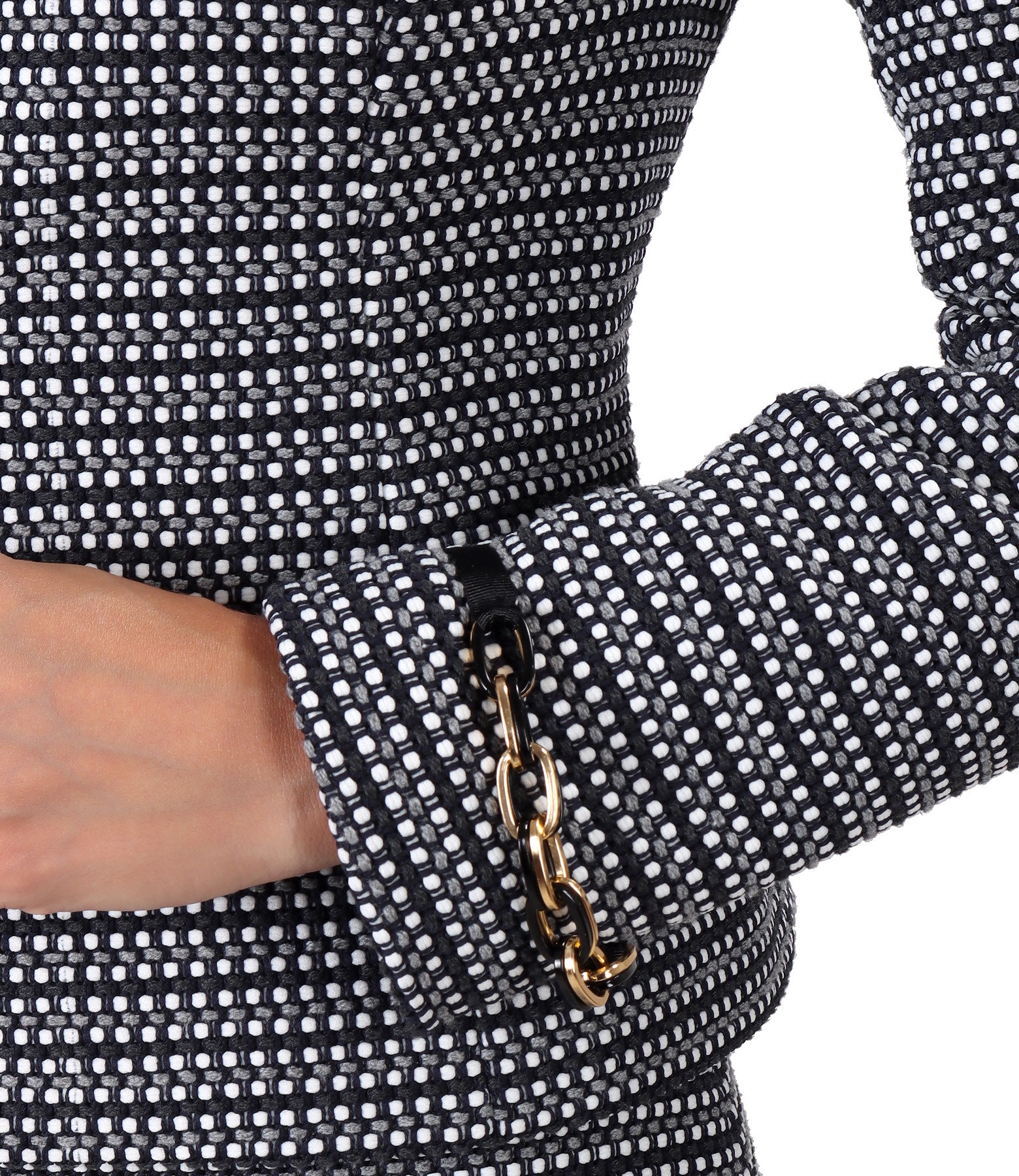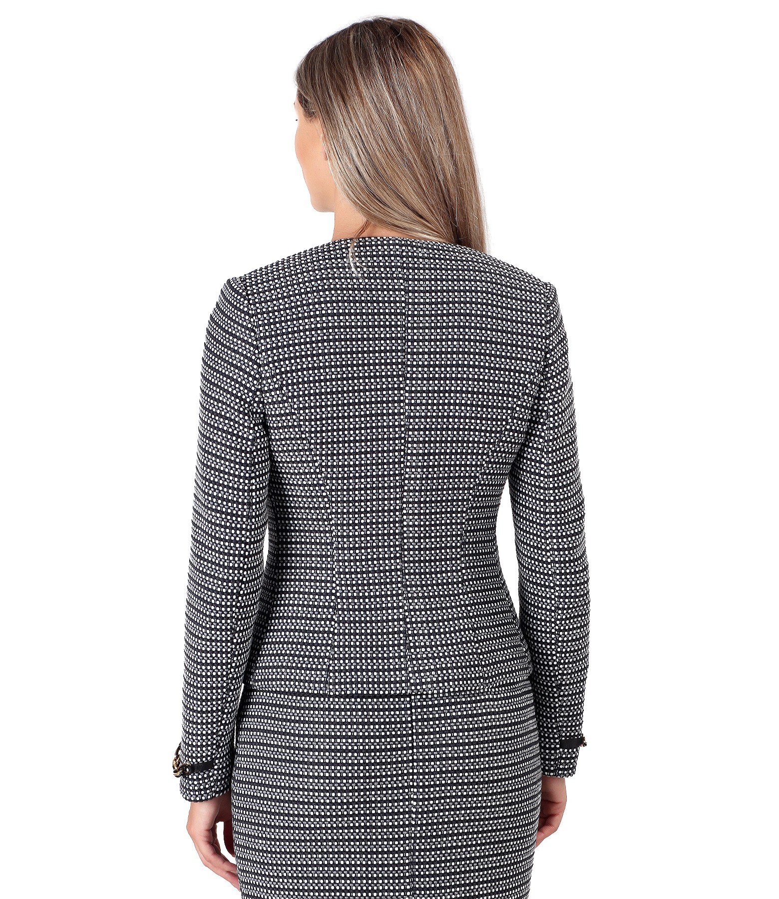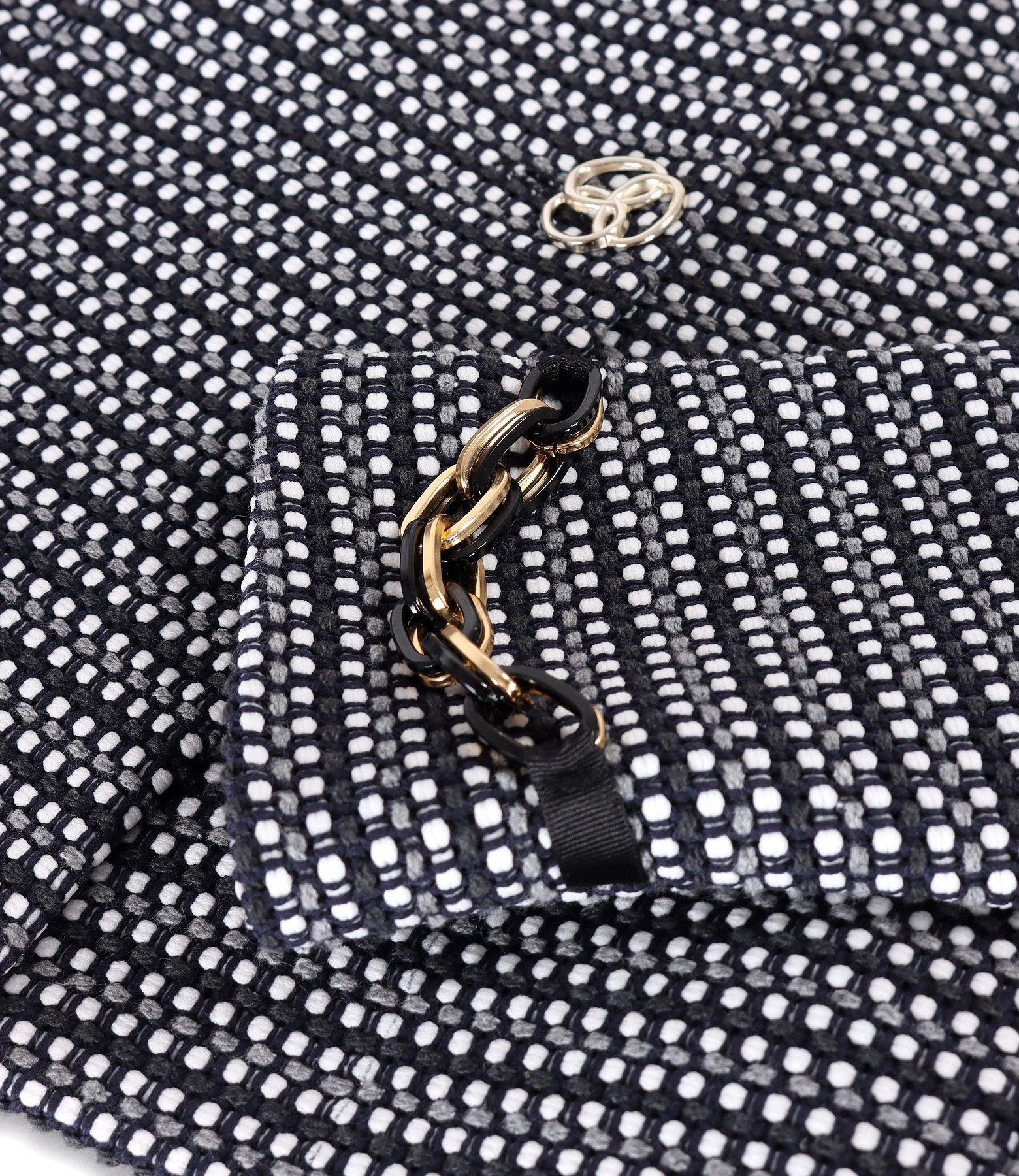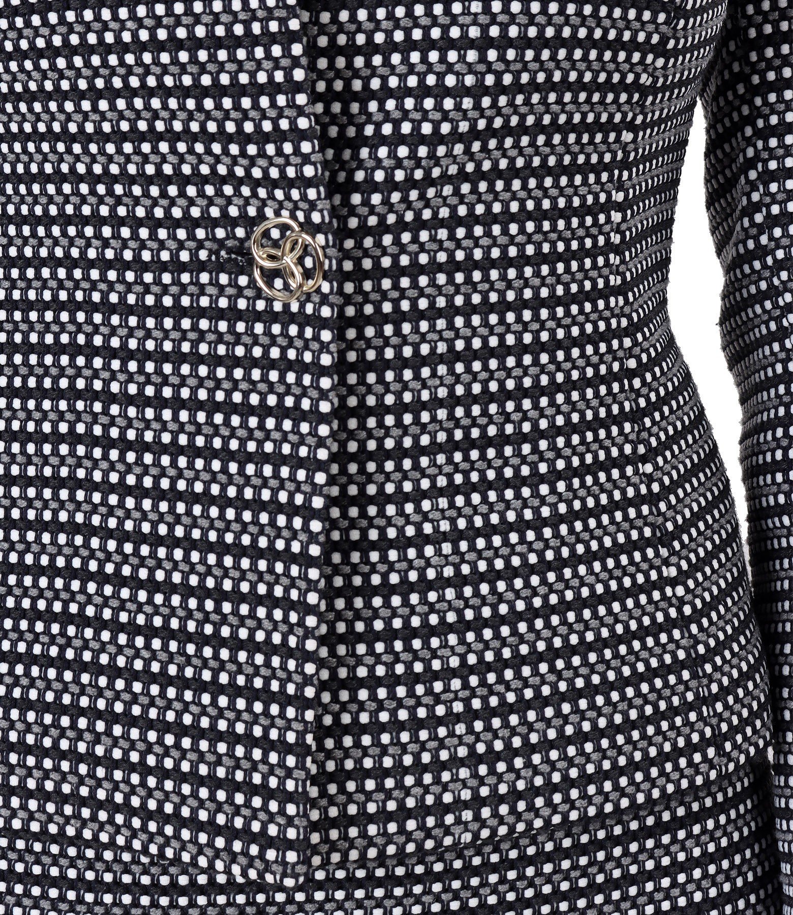 Sacou din bucle cu bumbac, cu decolteu pe langa gat, cu lant si rips la terminatie maneci. Se inchide pe fata cu 1 nasture.