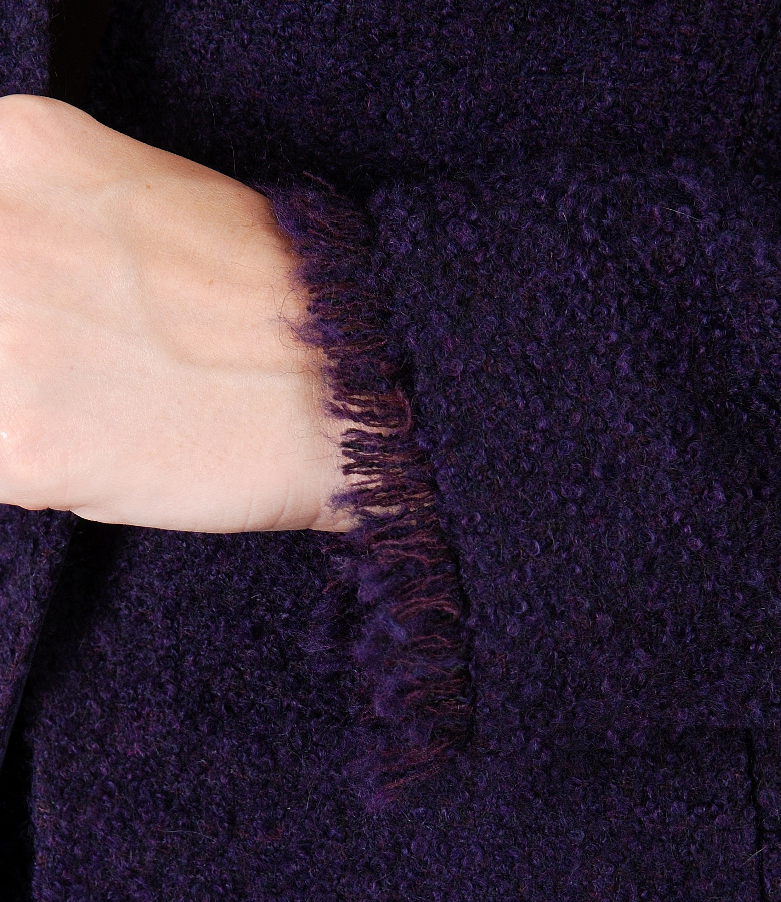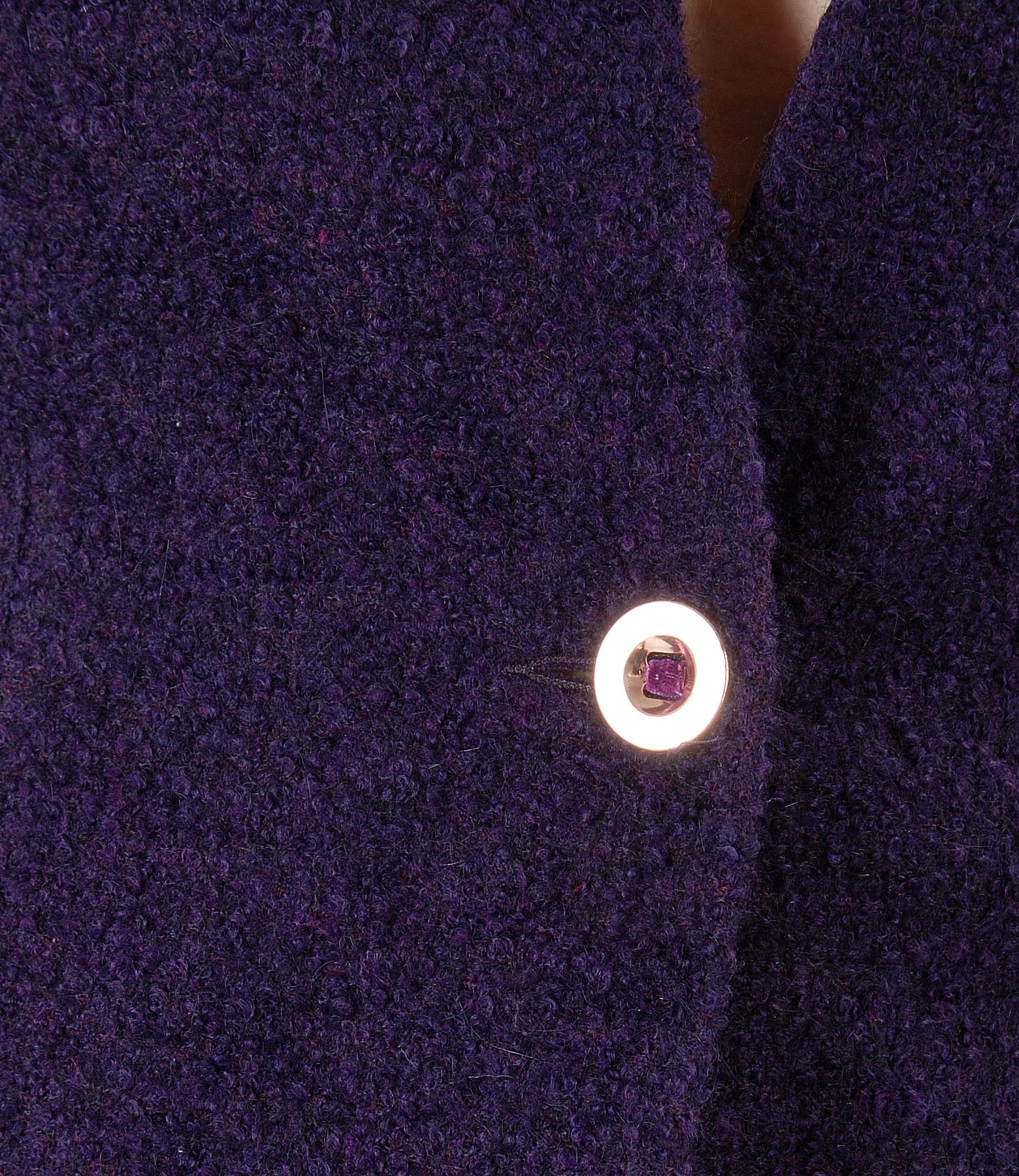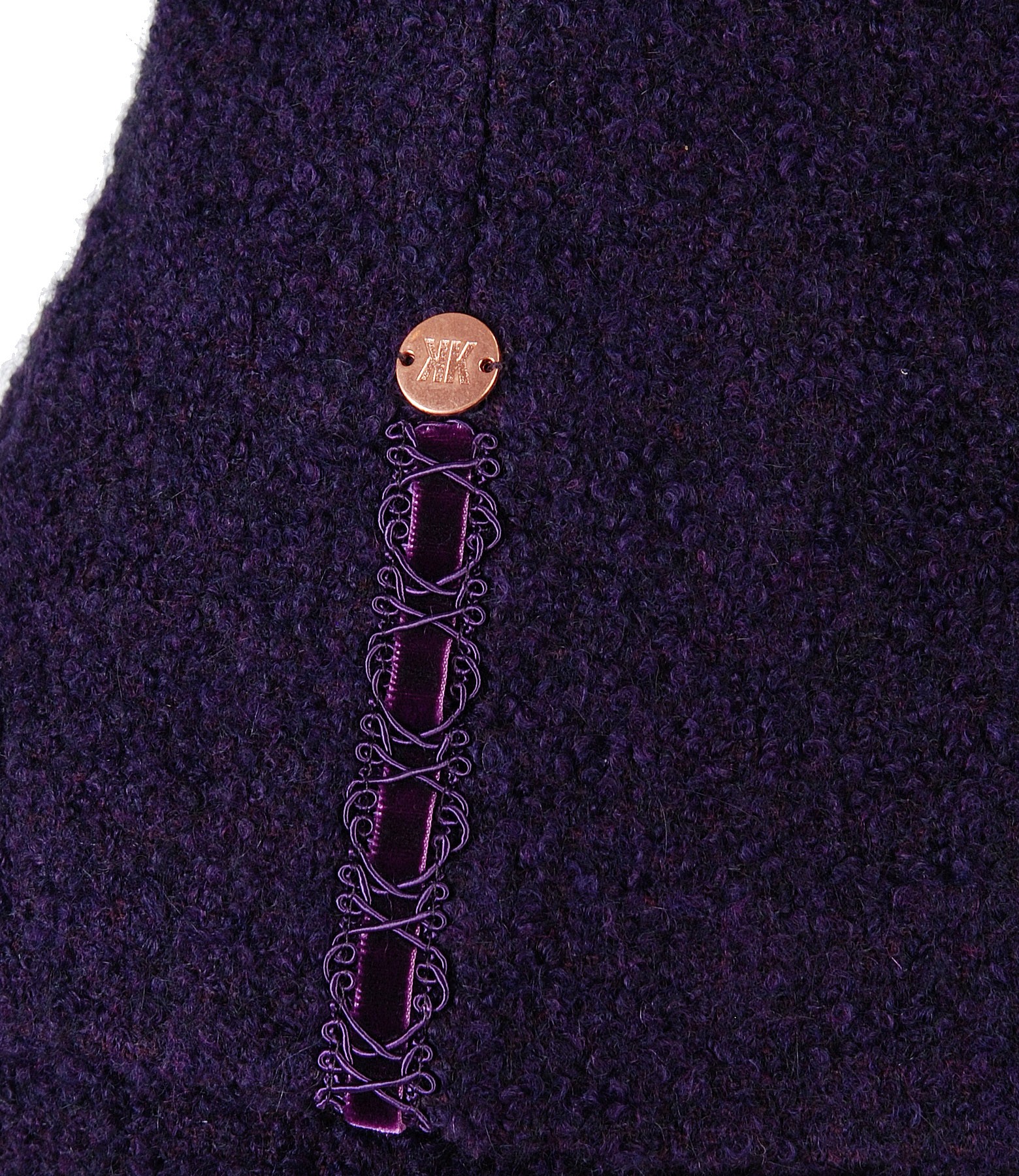 Sacou din bucle cu lana si alpaca, captusit, cu banda din catifea pe fata, guler gen tunica, decolteu adanc si franjuri la terminatie maneci. Se inchide cu un nasture metalic pe fata.