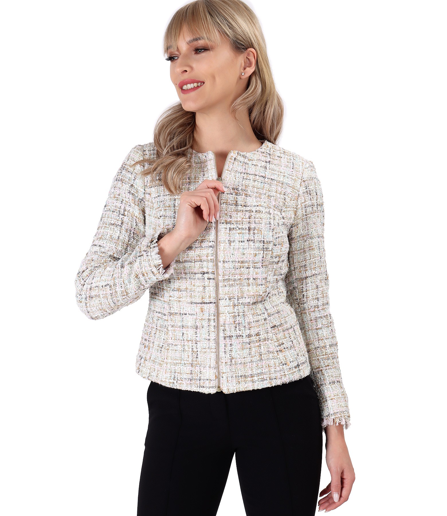 Sacou fara guler din bucle multicolor cu paiete si fir de efect, captusit, cu decolteu pe langa gat si franjuri la terminatie maneci. Se inchide cu fermoar pe mijloc fata.