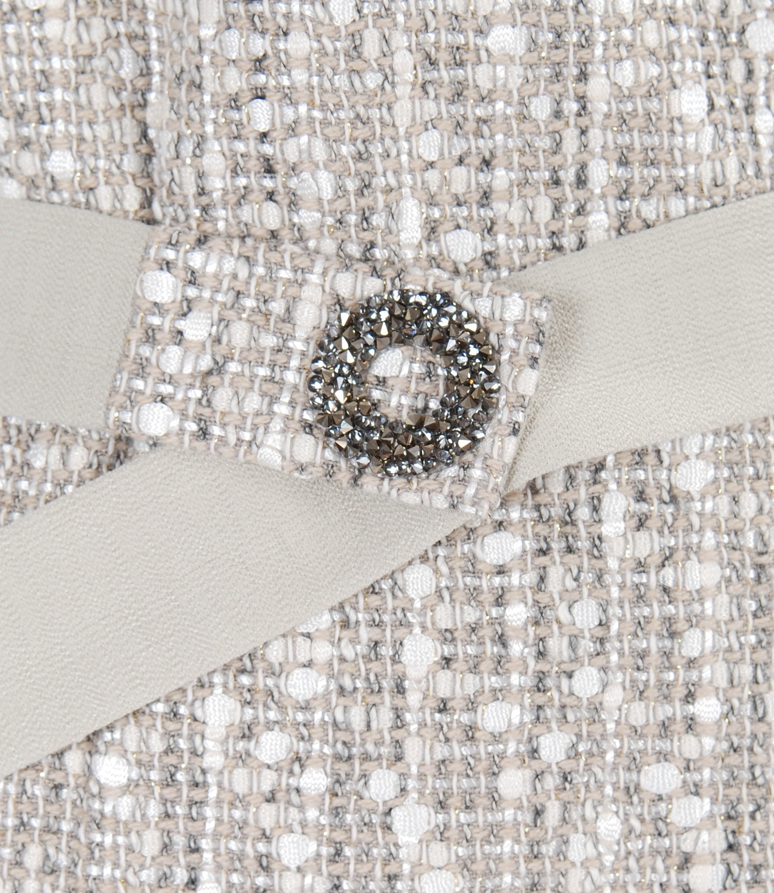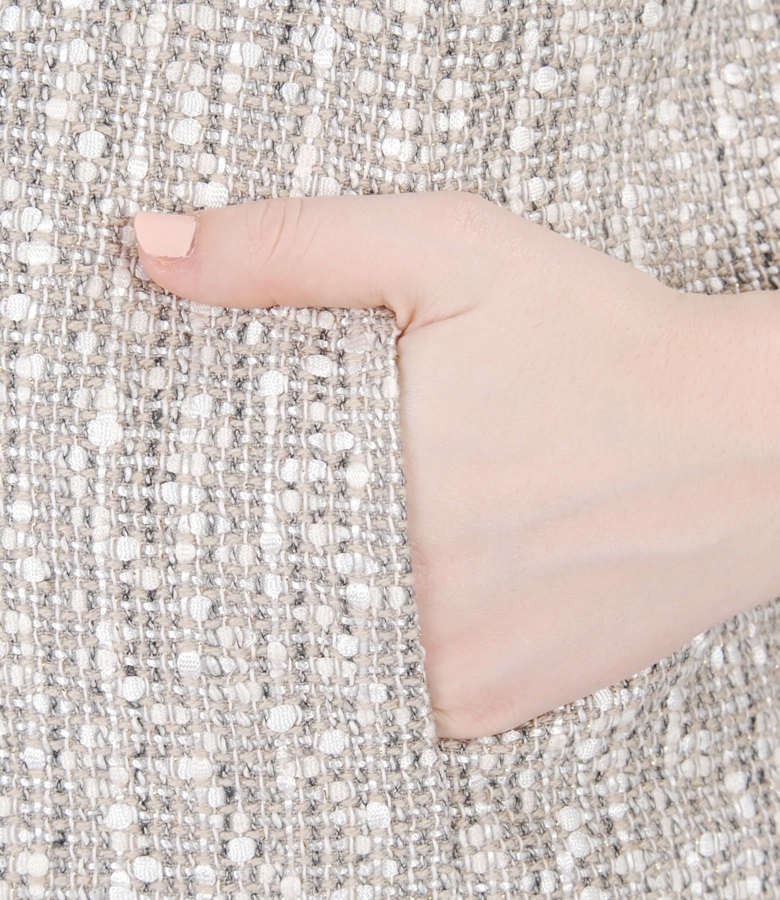 Sacou din bucle elastic de bumbac multicolor, cu maneci 3/4, guler tip tunica si buzunare laterale verticale. Se strange in talie cu un cordon detasabil cu cristale. Se inchide cu 5 capse mos-baba pana la baza decolteului.
