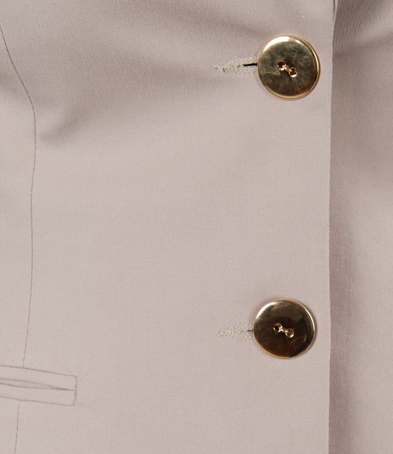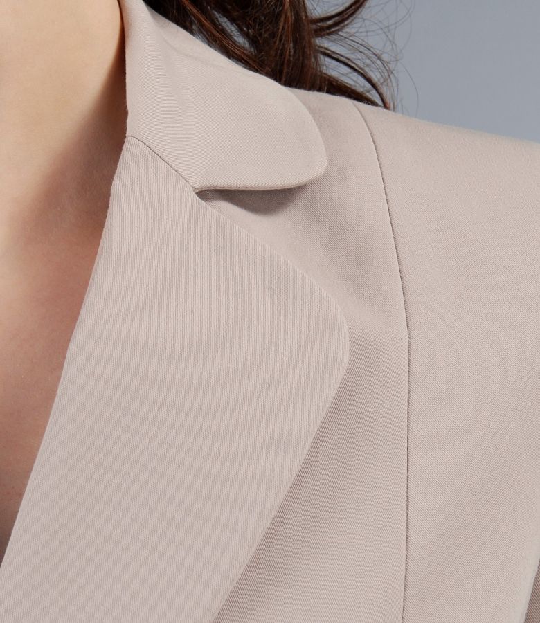 Sacou lejer din bumbac elasticizat, cu guler si revere rotunjite si buzunare laterale cu refileti. Maneci cu slit inchis cu fermoar metalic auriu, slit petrecut pe mijloc spate. Se inchide cu 2 nasturi aurii pe fata.