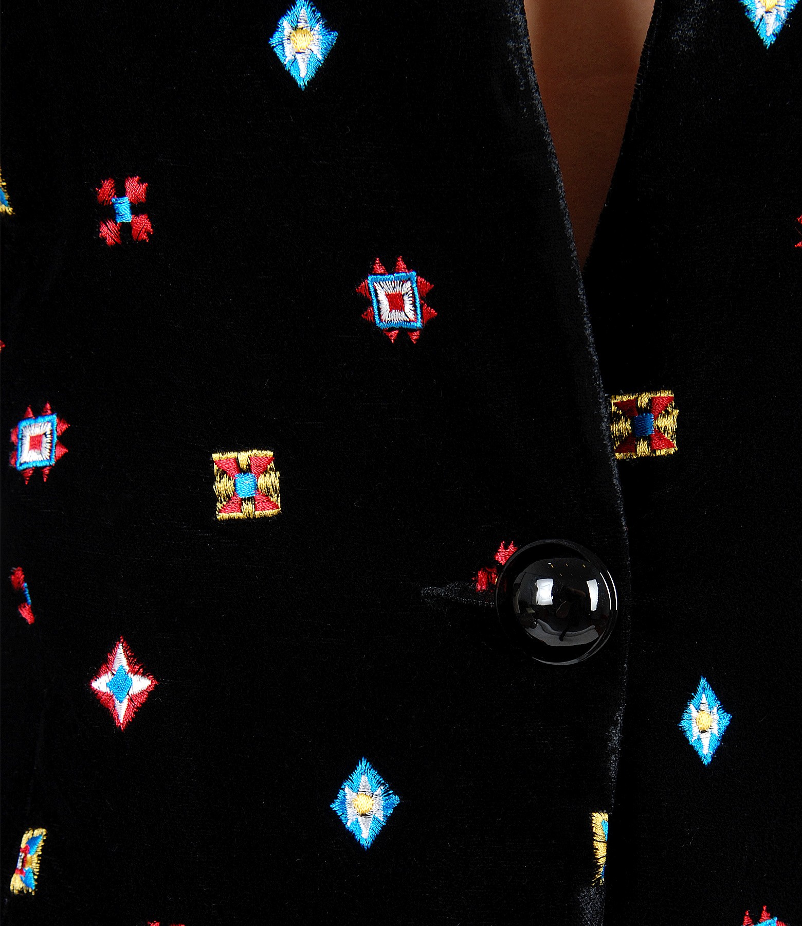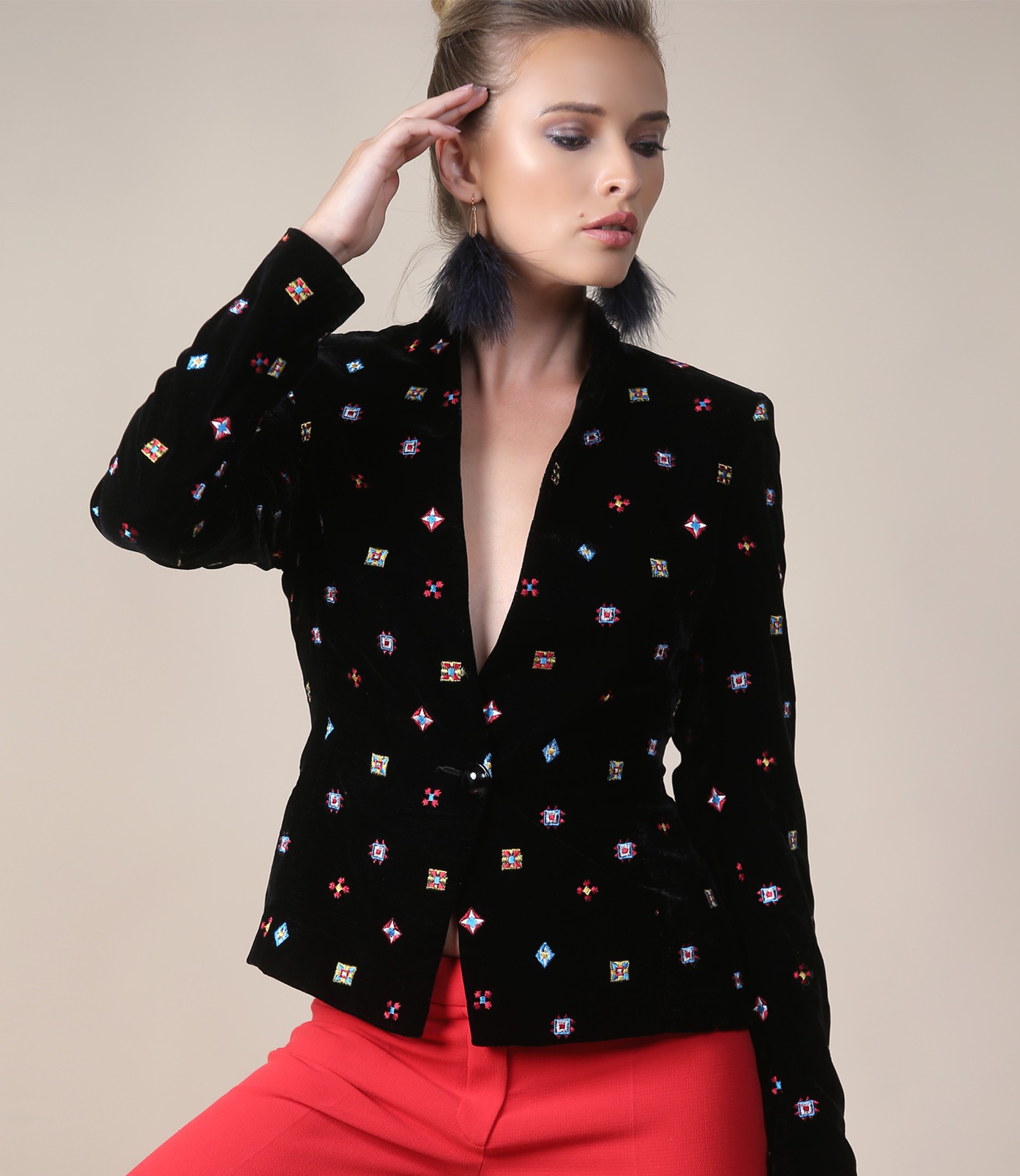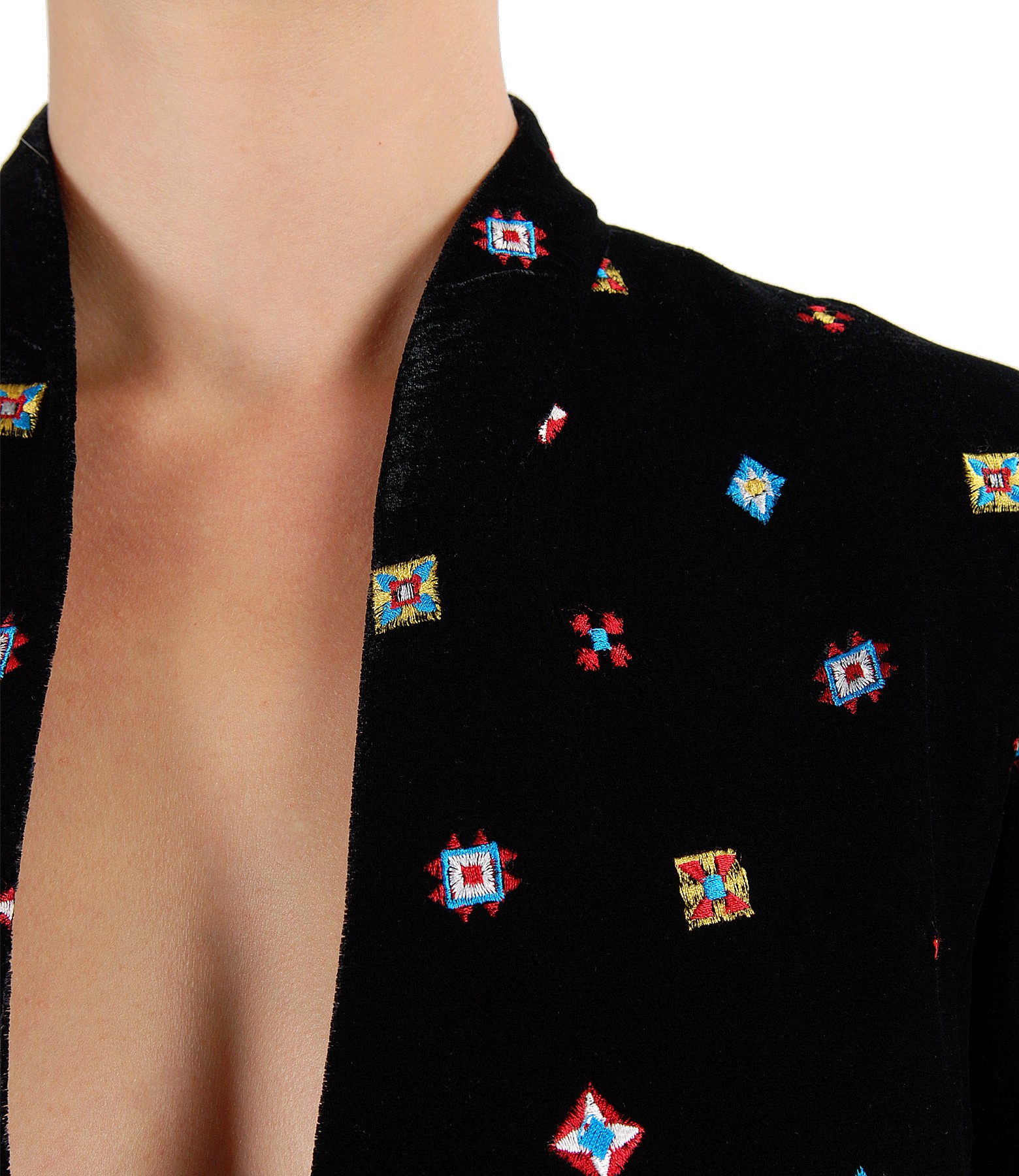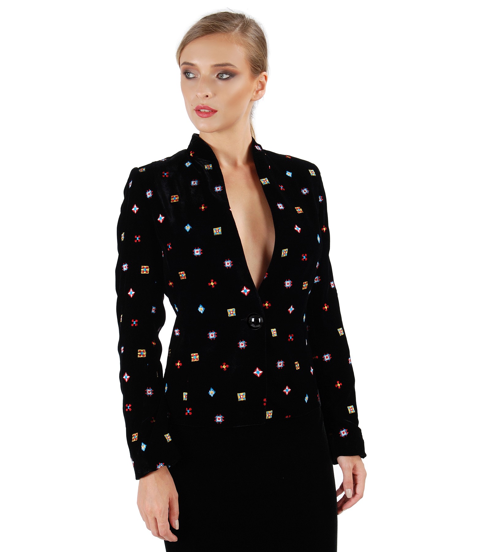 Sacou din catifea brodata, captusit, cu guler gen tunica si decolteu adanc. Se inchide cu un nasture pe fata.