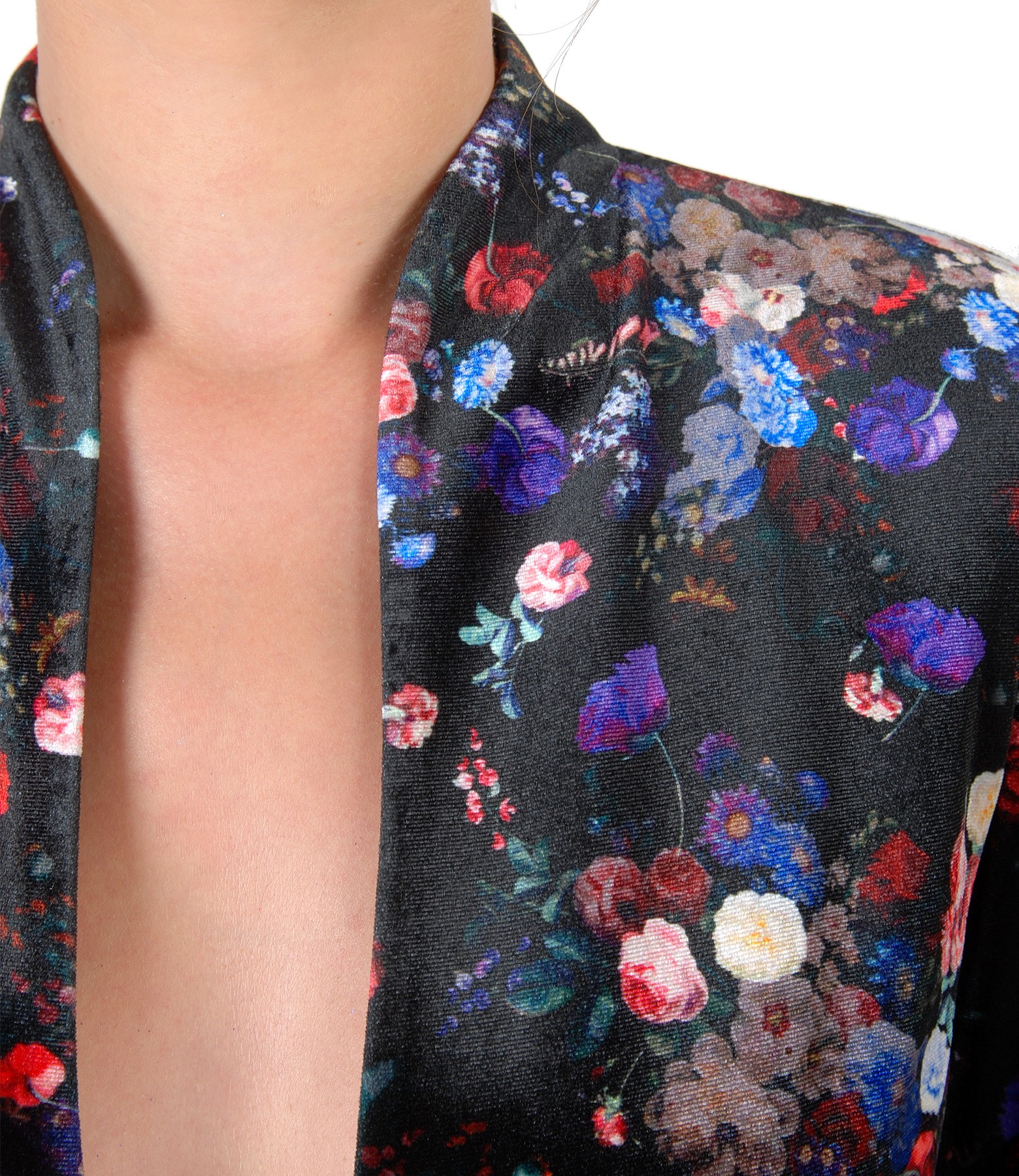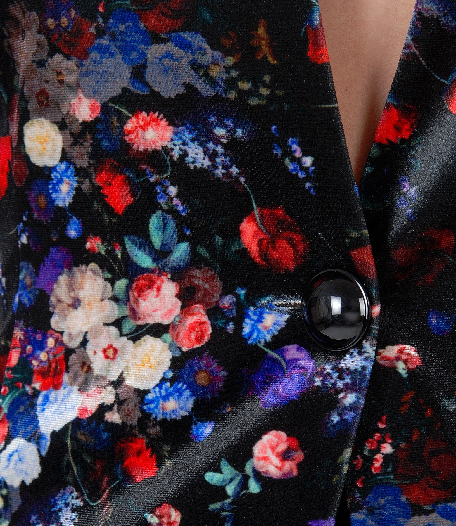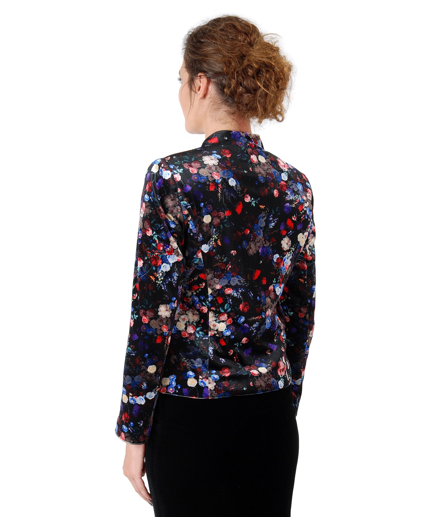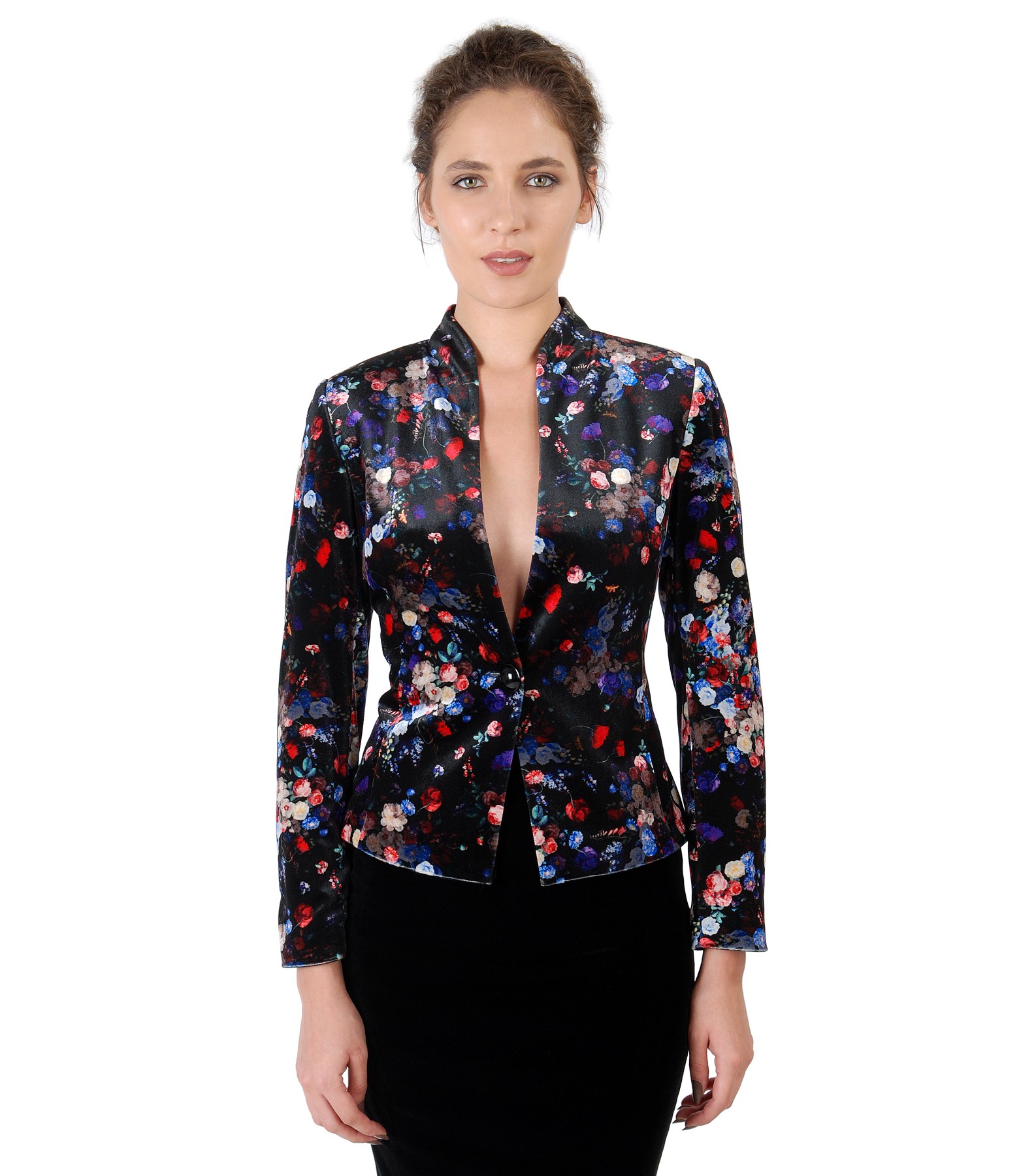 Sacou din catifea elastica cu moive florale, captusit, cu guler gen tunica si decolteu adanc. Se inchide cu un nasture pe fata.