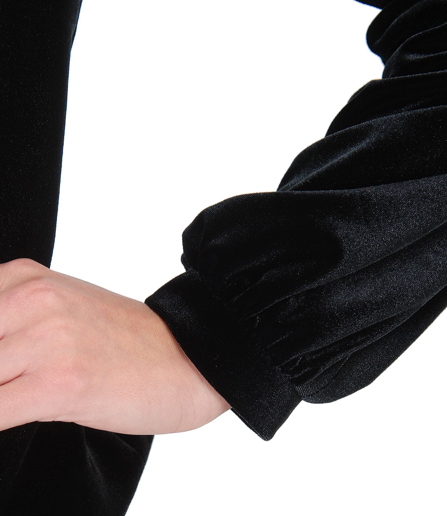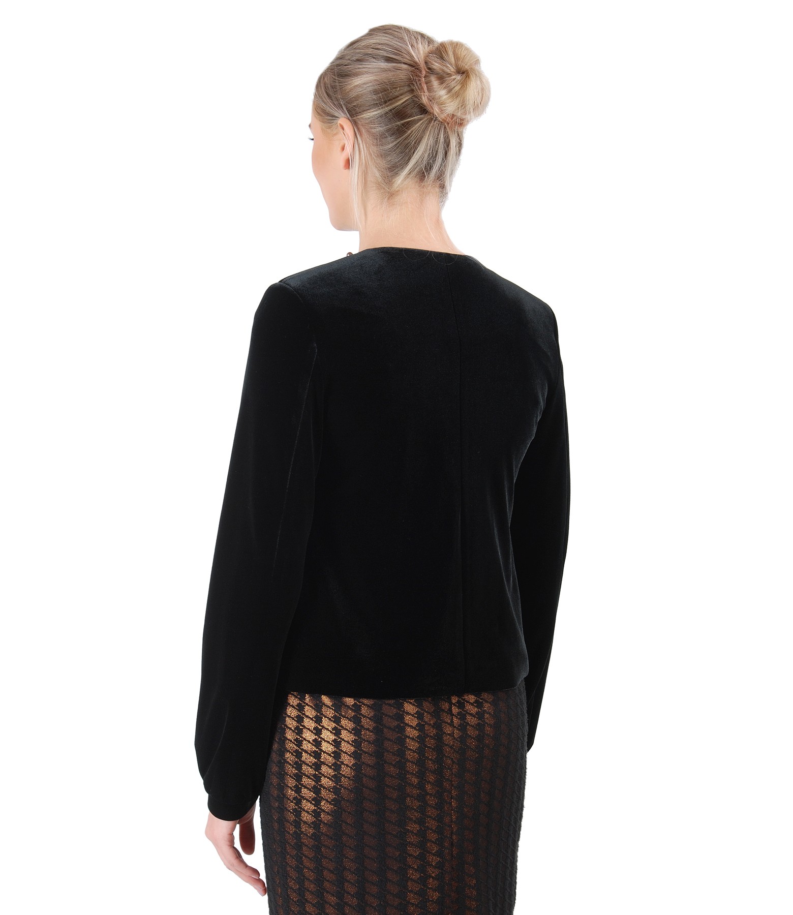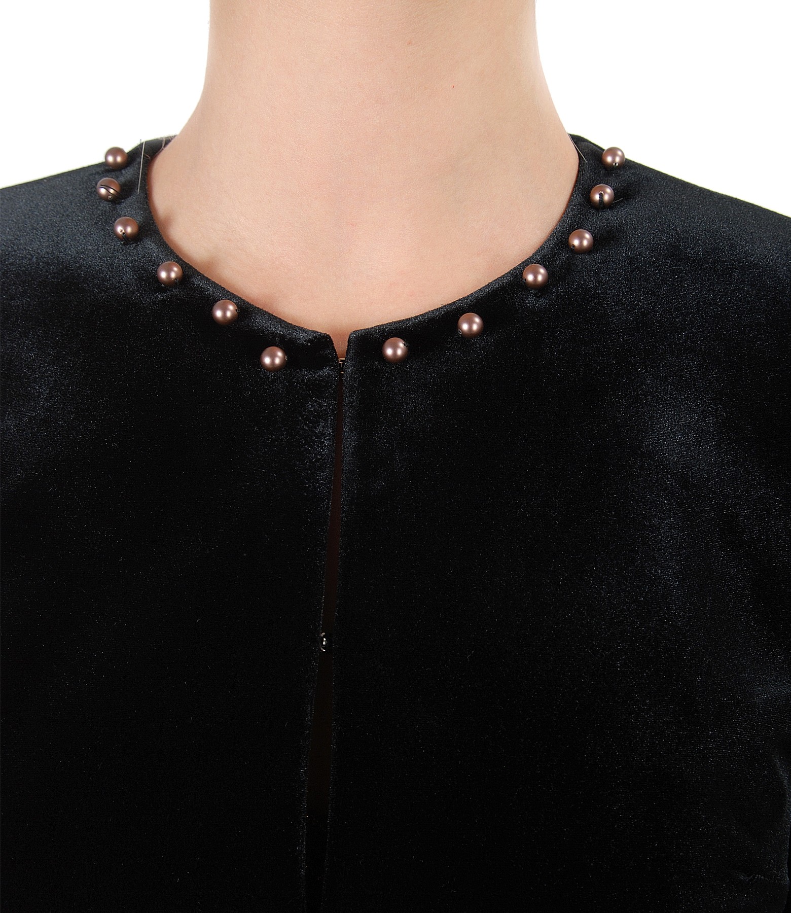 Sacou elegant din catifea elastica neagra, captusit, fara guler, cu decolteu pe langa gat, cu maneci lungi si incretite la terminatie, si 12 perle aplicate pe decolteu. Se inchide cu 5 capse mos-baba pe mijloc fata.