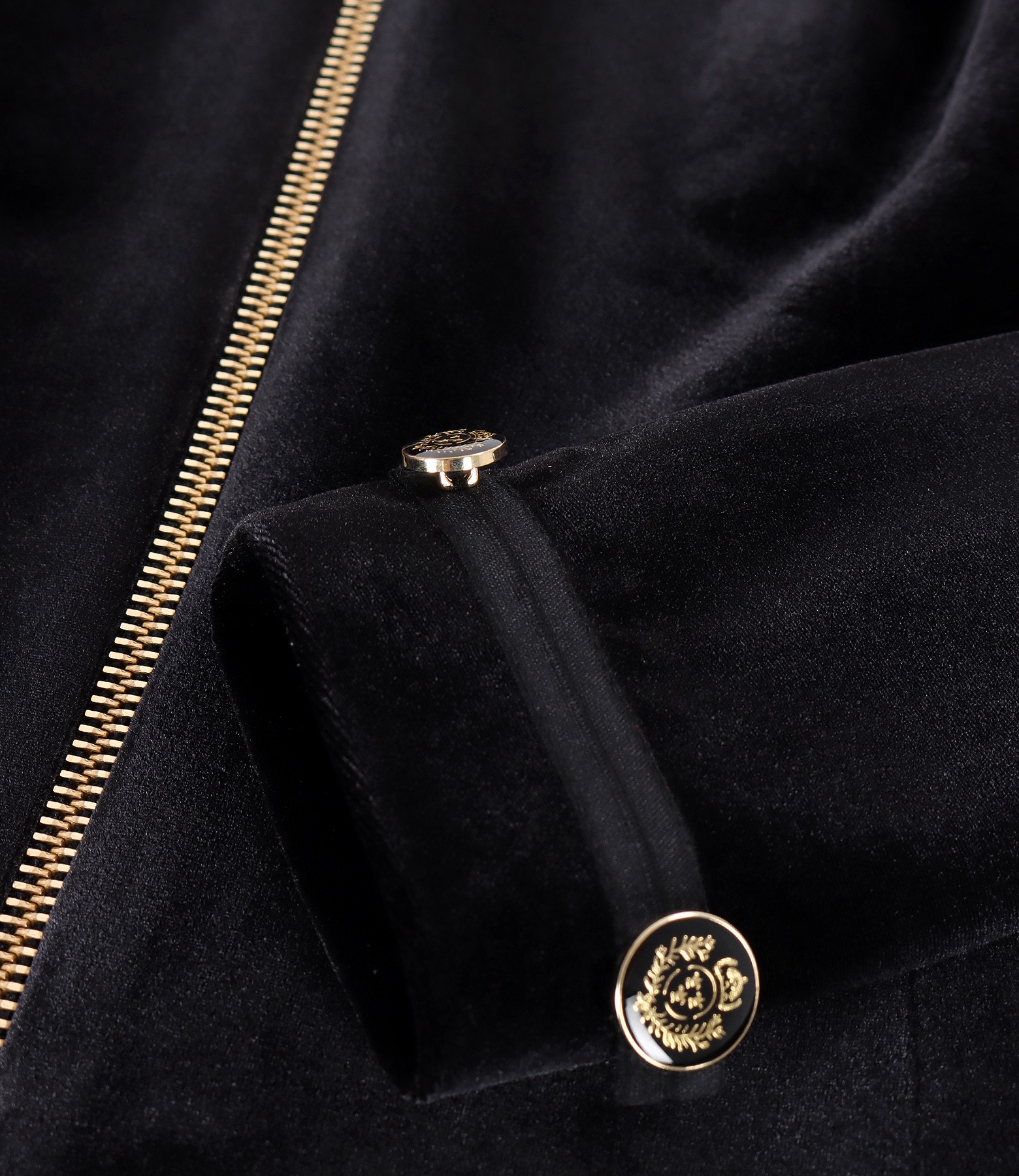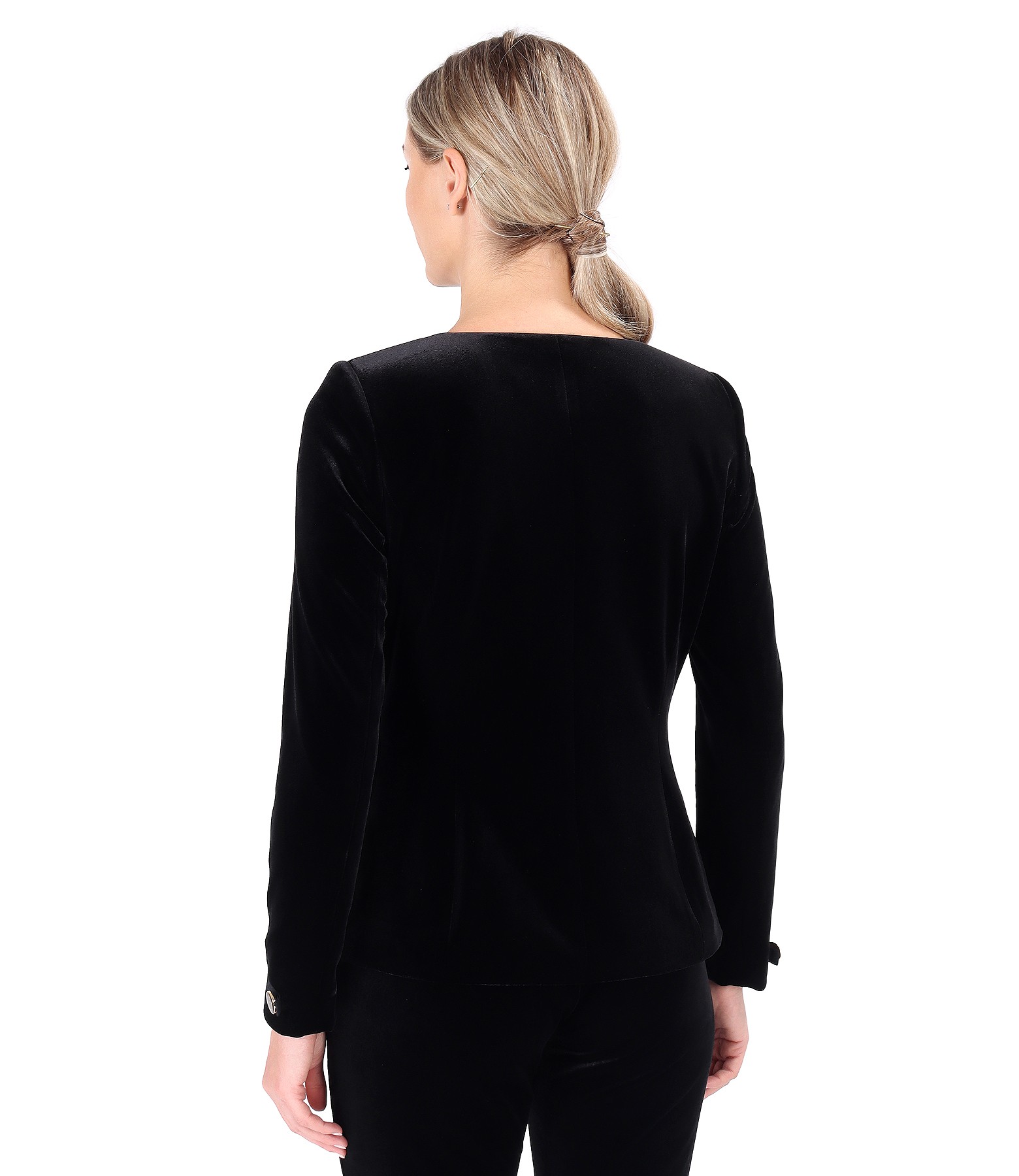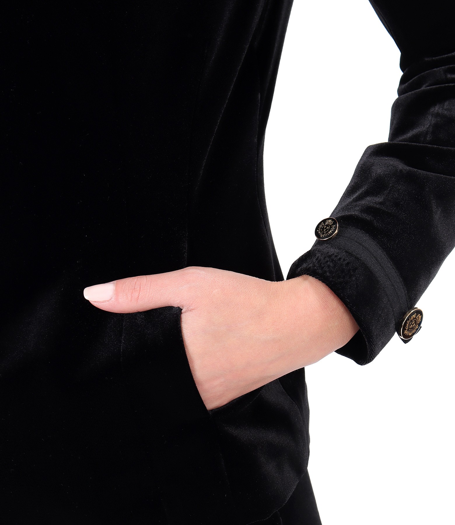 Sacou din catifea elastica neagra, captusit, cu buzunare laterale si nasturi cu elastic satinat la terminatia manecii. Se inchide cu fermoar pe mijloc fata.