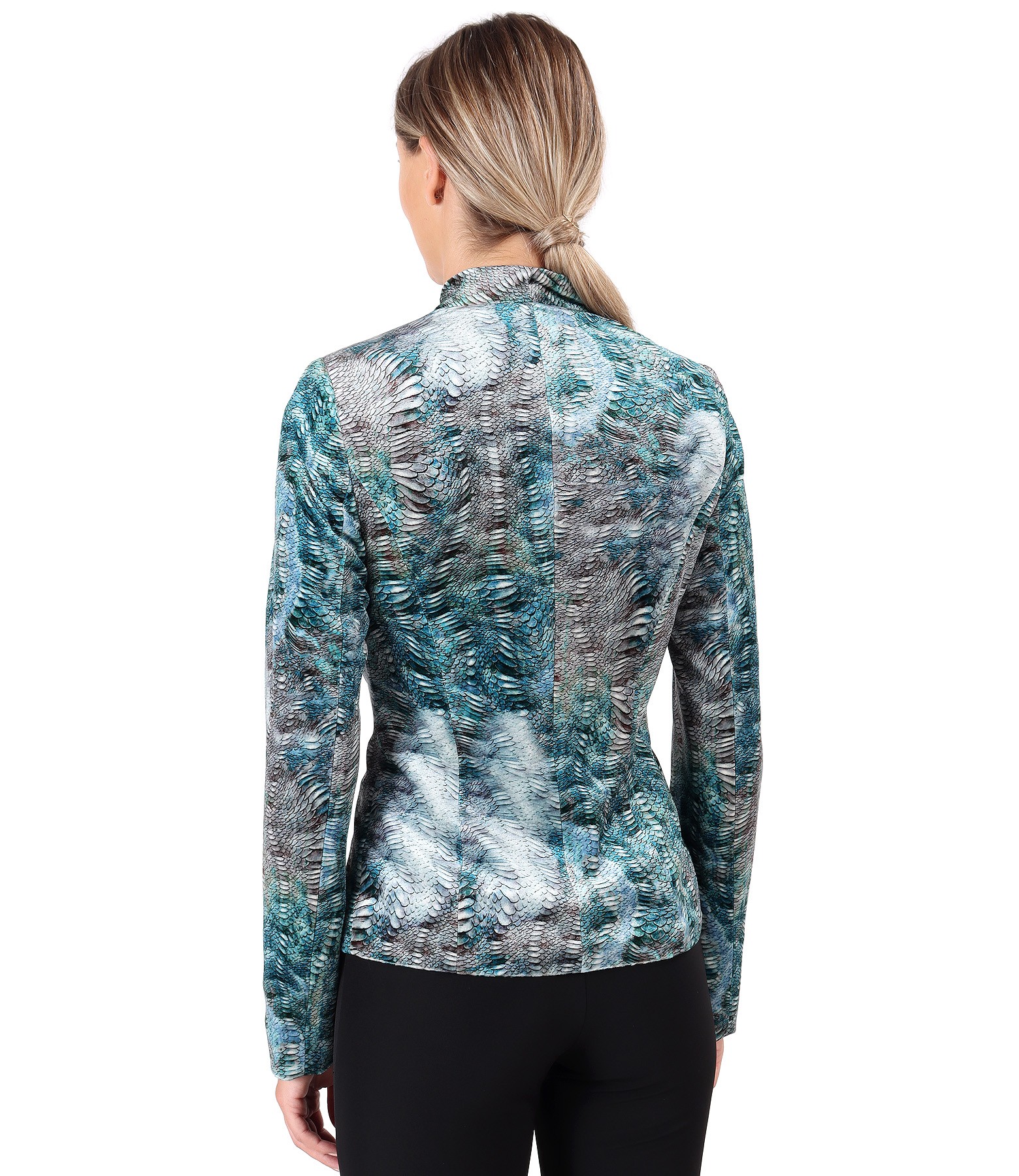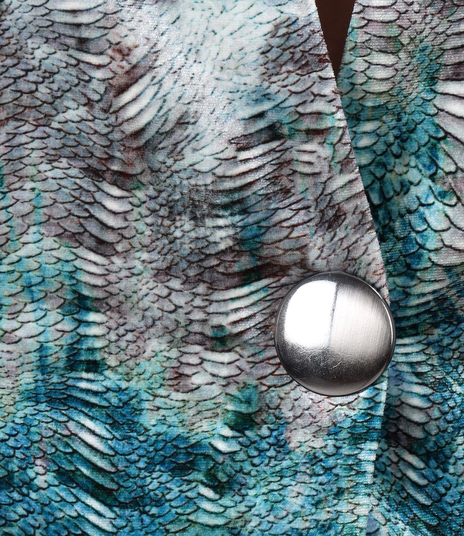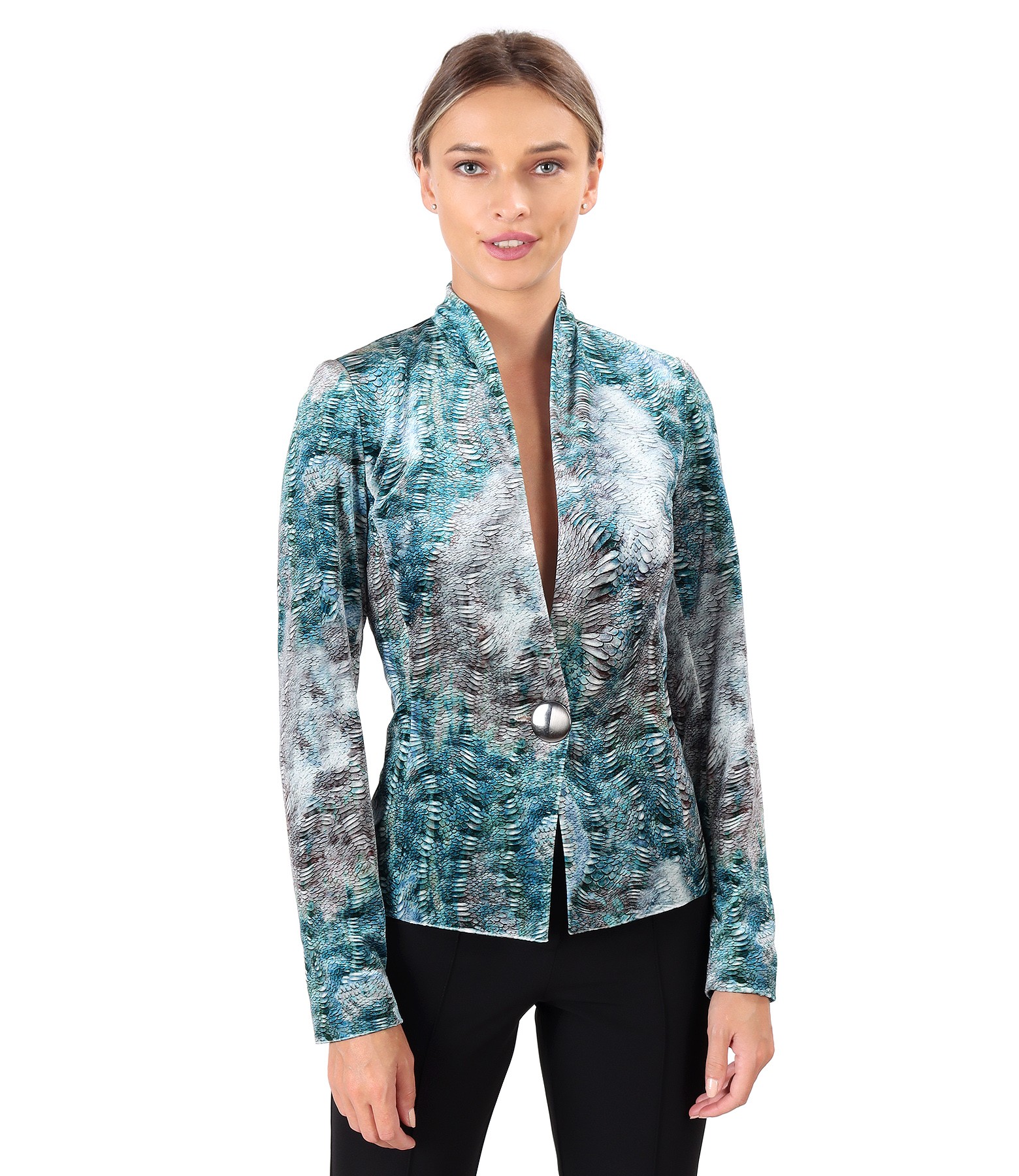 Sacou din catifea elastica imprimata, captusit, cu guler gen tunica si decolteu adanc. Se inchide cu un nasture pe fata.