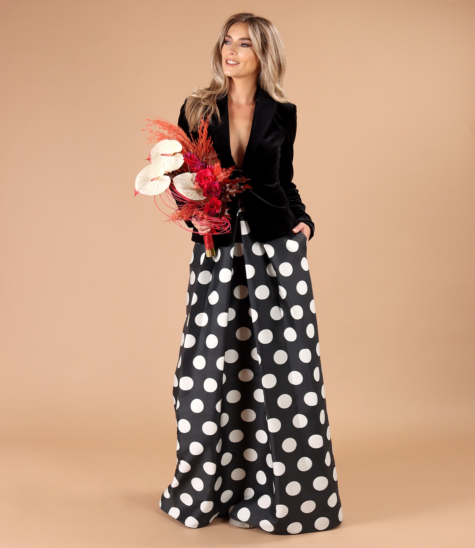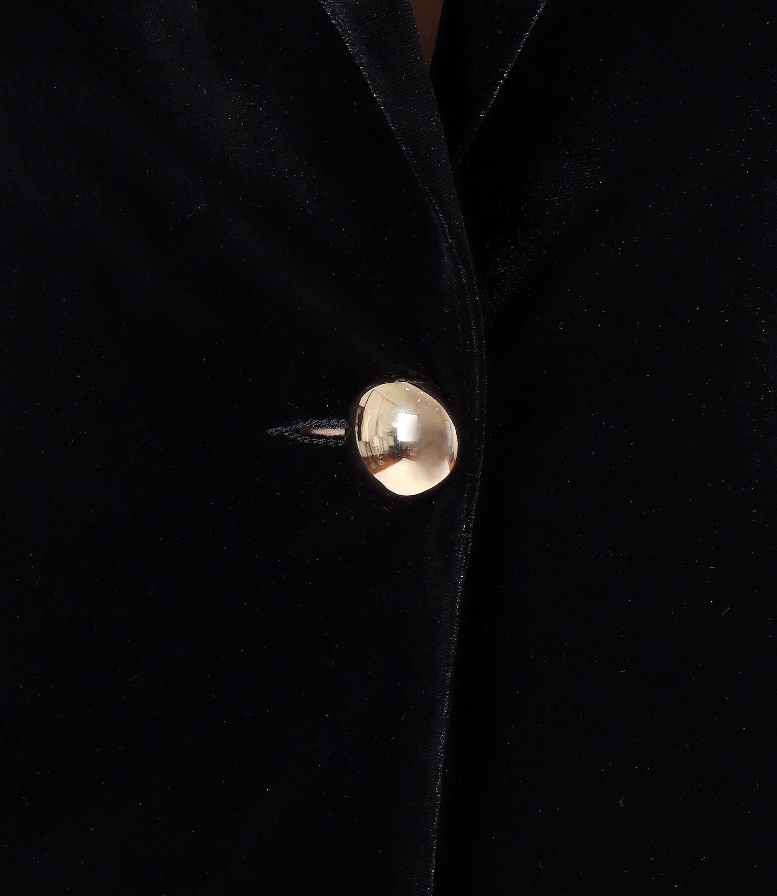 Sacou din catifea elastica neagra, cu decolteu adanc, in V si doua clape decorative pe fata. Guler si revere ascutite. Se inchide cu un nasture pe mijloc fata.