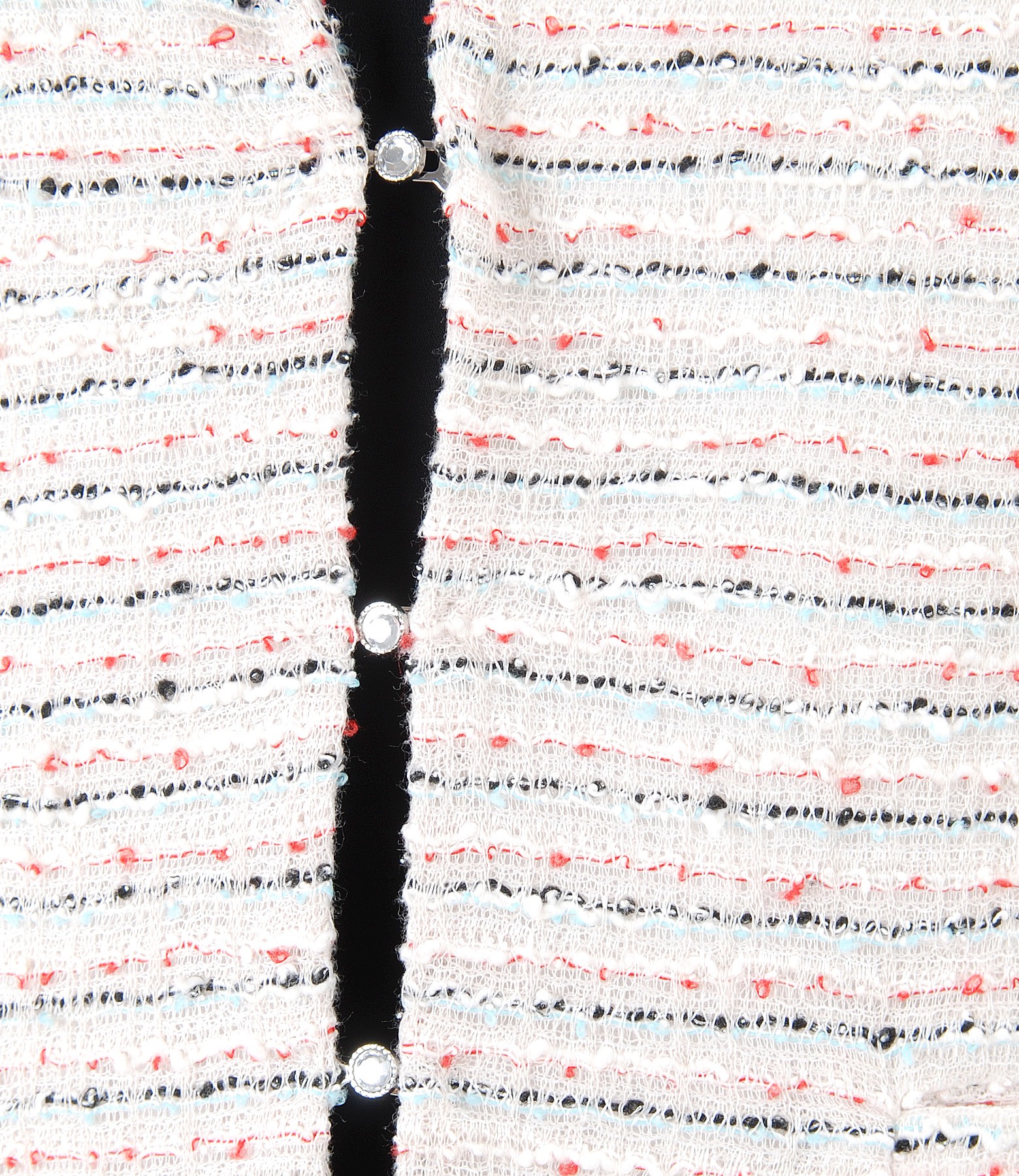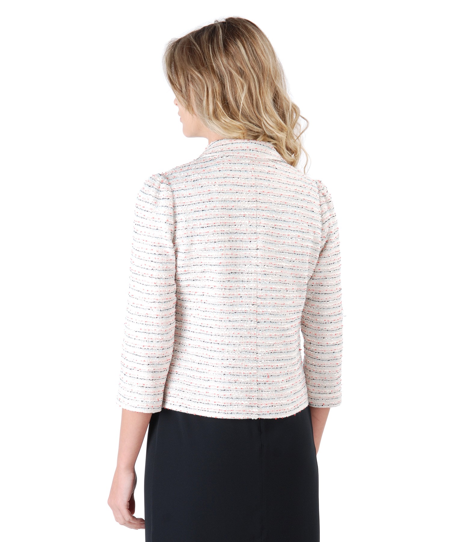 Sacou din dantela cu bumbac si fir de efect, dublat cu viscoza, cu maneci 3/4 si buzunare pe fata. Se inchide cu 3 capse mos-baba pe fata.