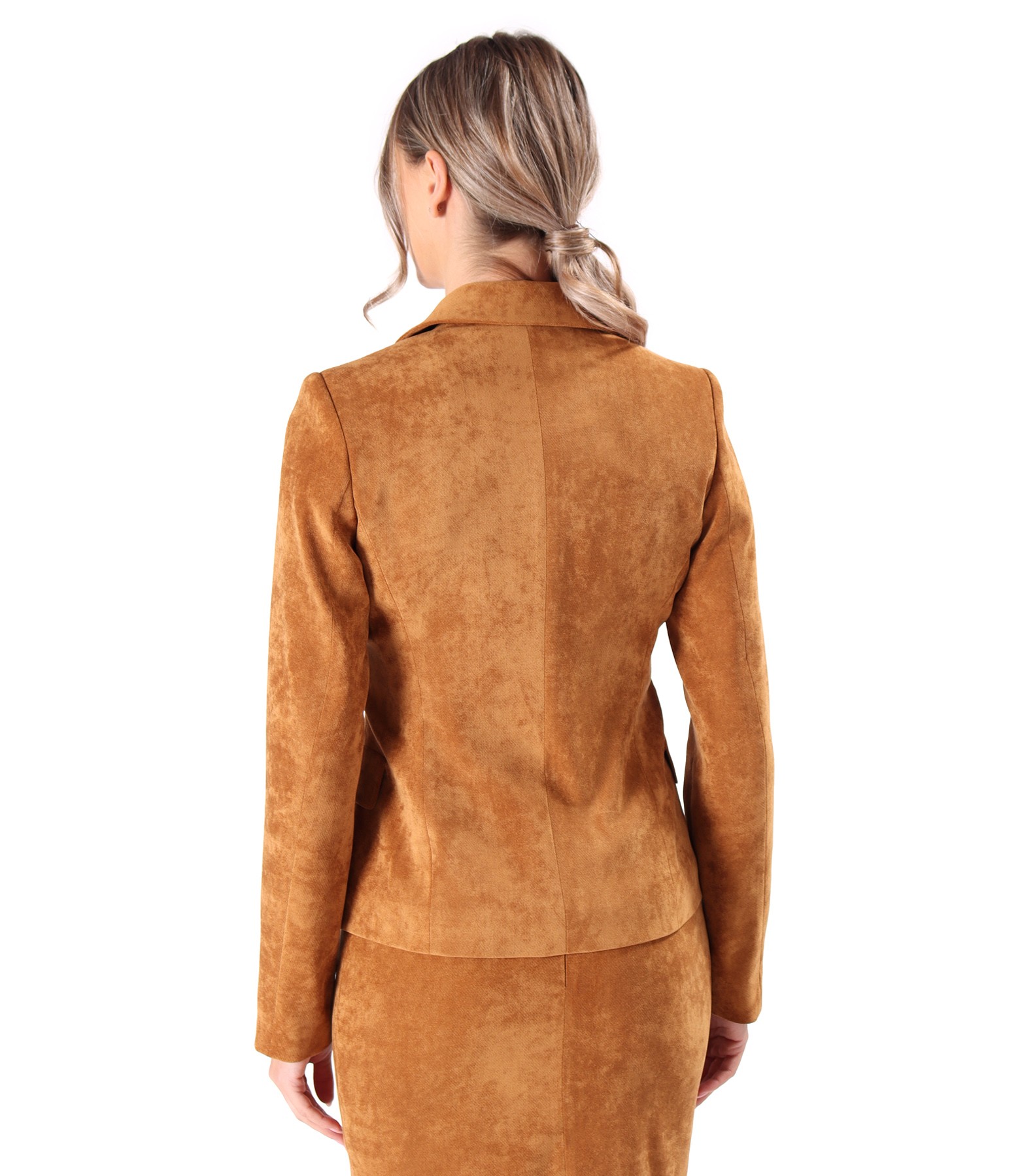 Sacou din stofa elastica cu aspect catifelat, cu decolteu adanc, in V si doua clape decorative aplicate pe fata. Guler si revere ascutite. Se inchide cu un nasture pe mijloc fata.