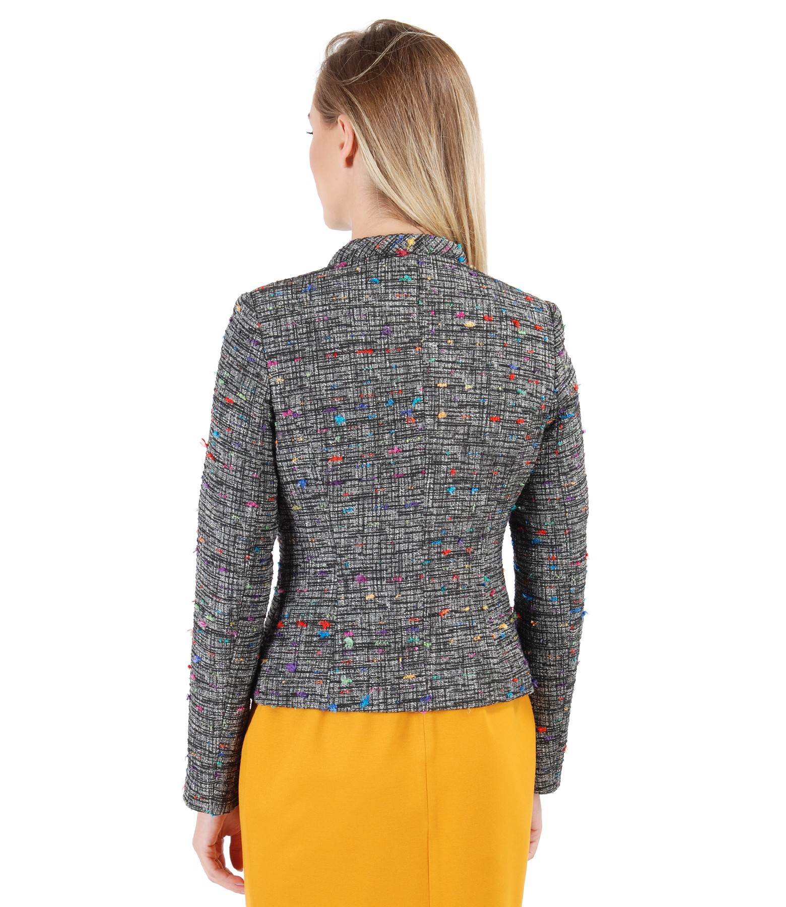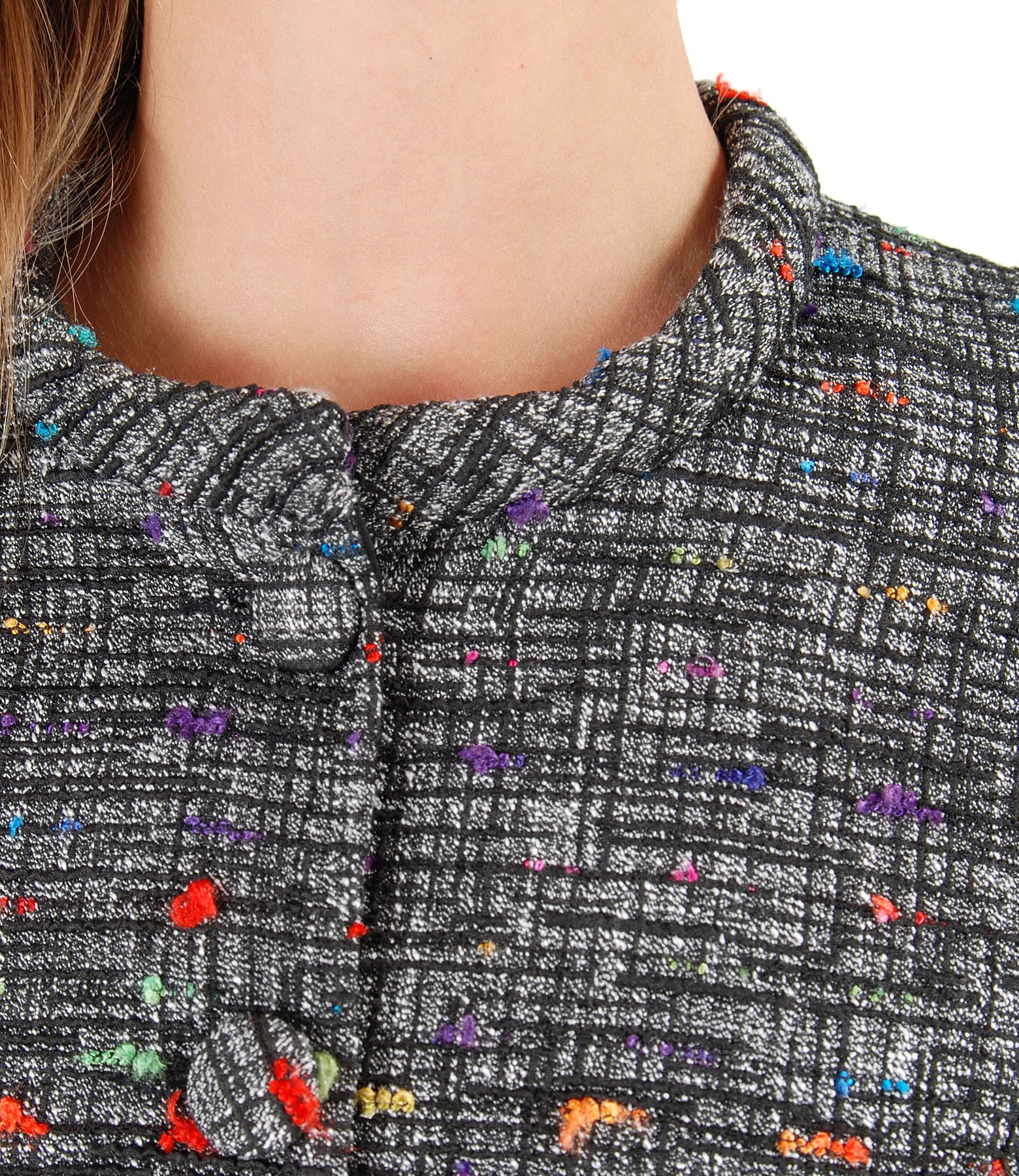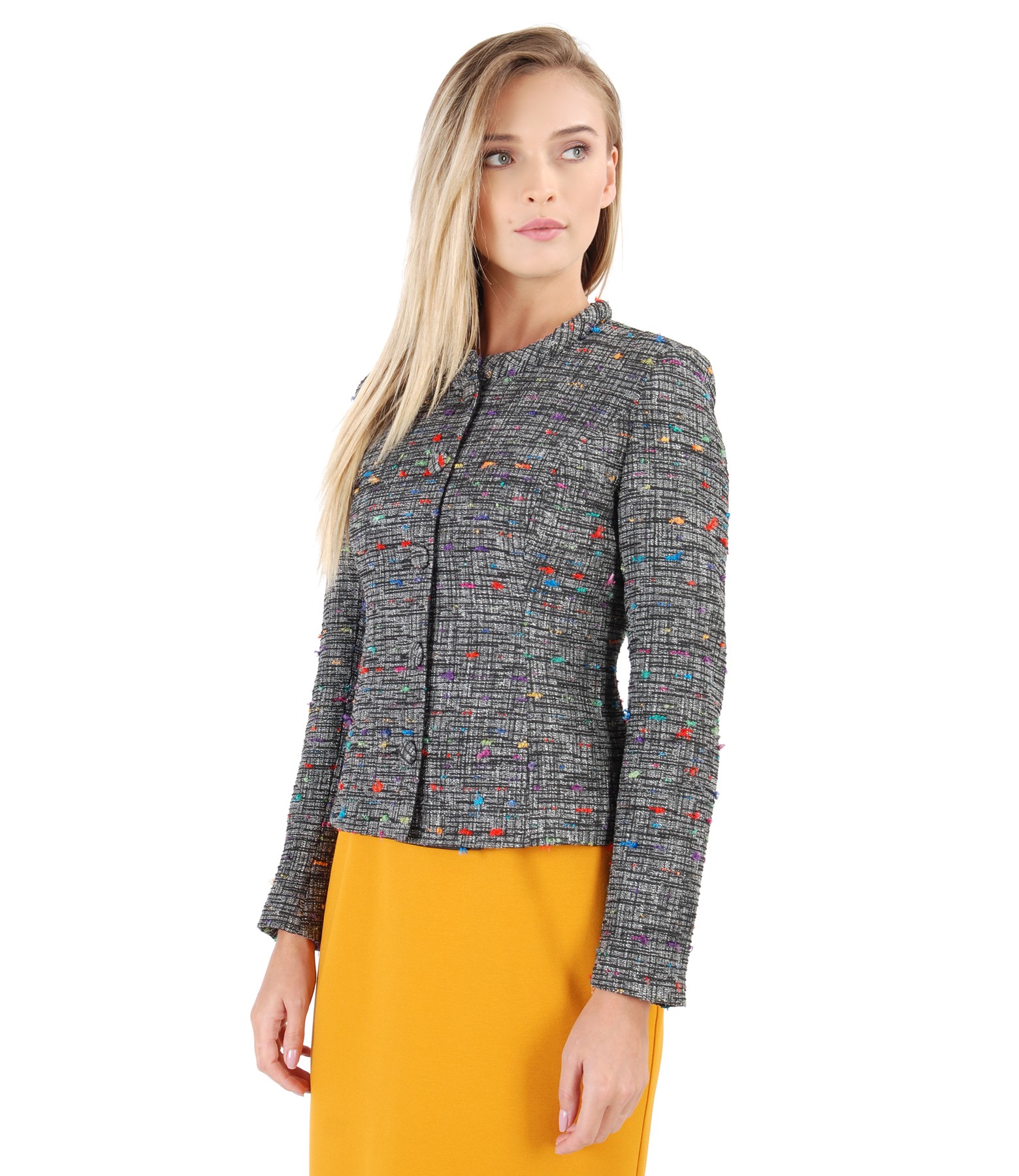 Sacou din stofa cu insertii de fire satinate, captusit, si cu guler tubular la baza gatului. Se inchide cu 5 nasturi pe mijloc fata.