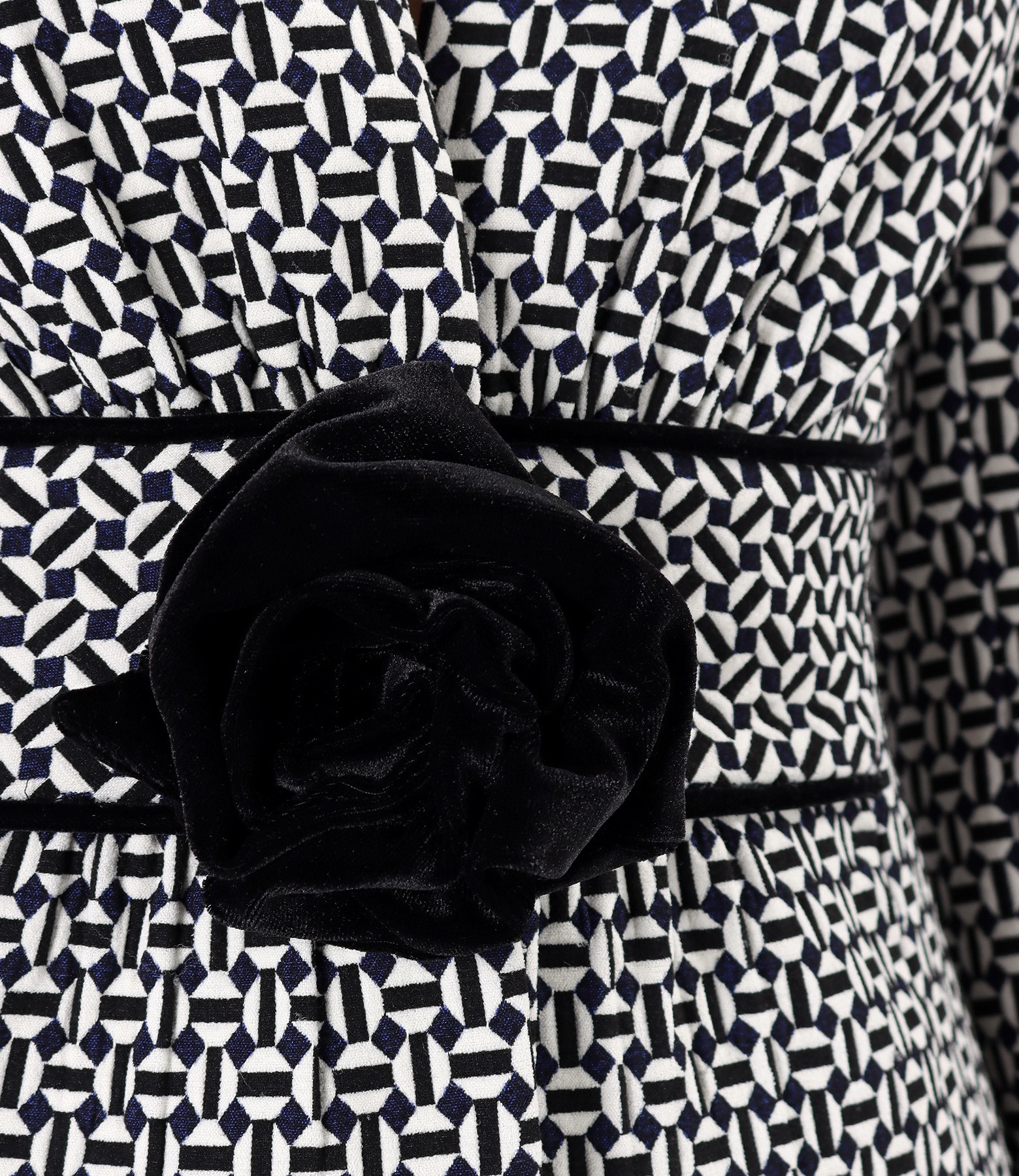 Sacou din stofa elastic cu bumbac si cu floare detasabila din catifea pe fata, captusit, fara guler, incretit in talie si cu garnituri din catifea. Se inchide cu doua perechi de capse pe mijloc fata.