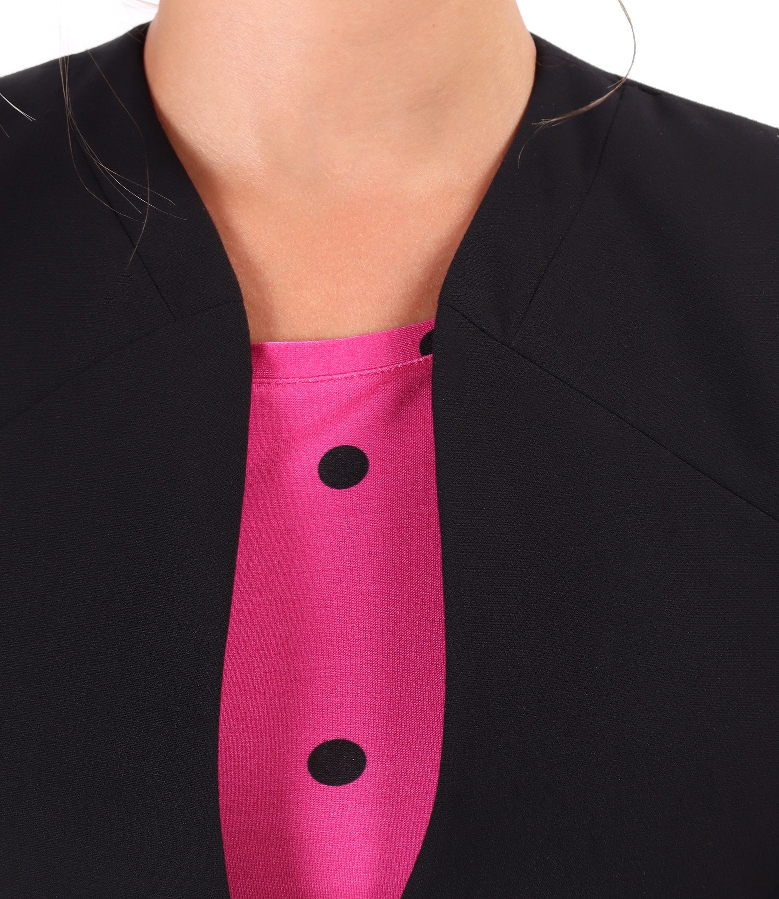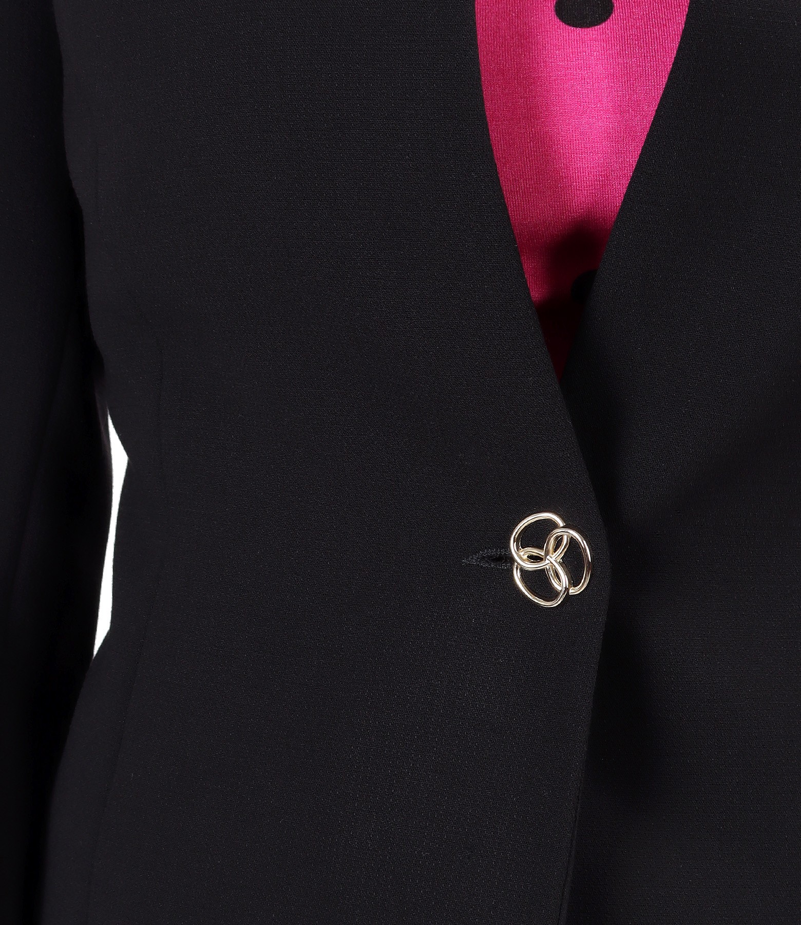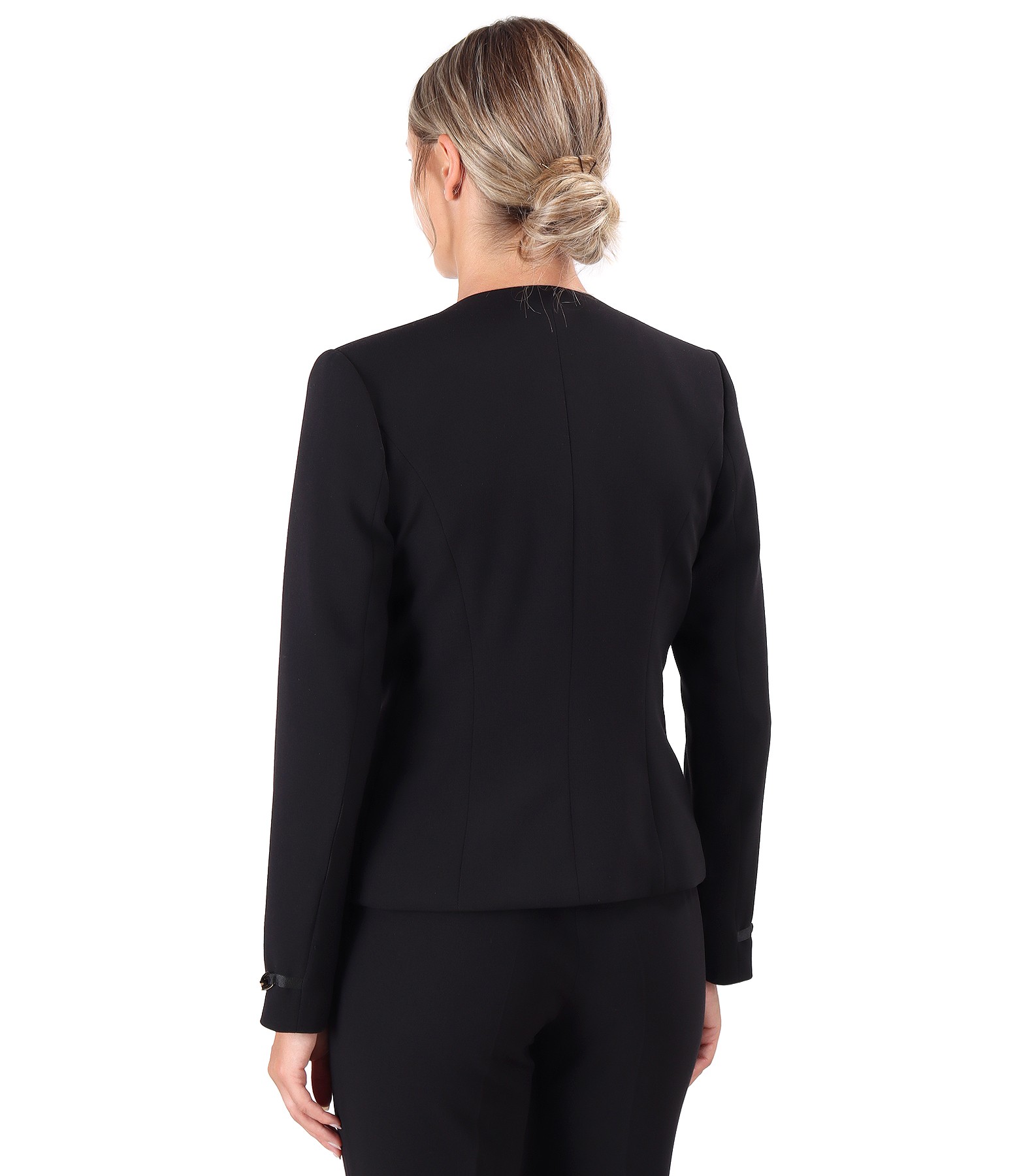 Sacou din stofa elastica cu lant decorativ la terminatia manecilor, captusit, fara guler si cu decolteu adanc. Se inchide cu un nasture pe mijloc fata.