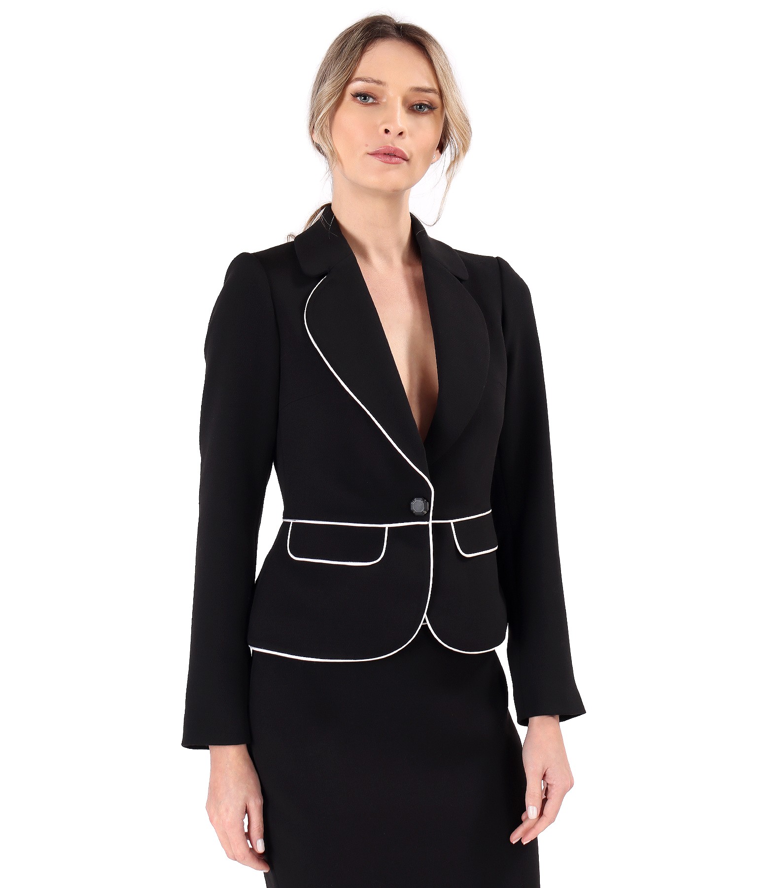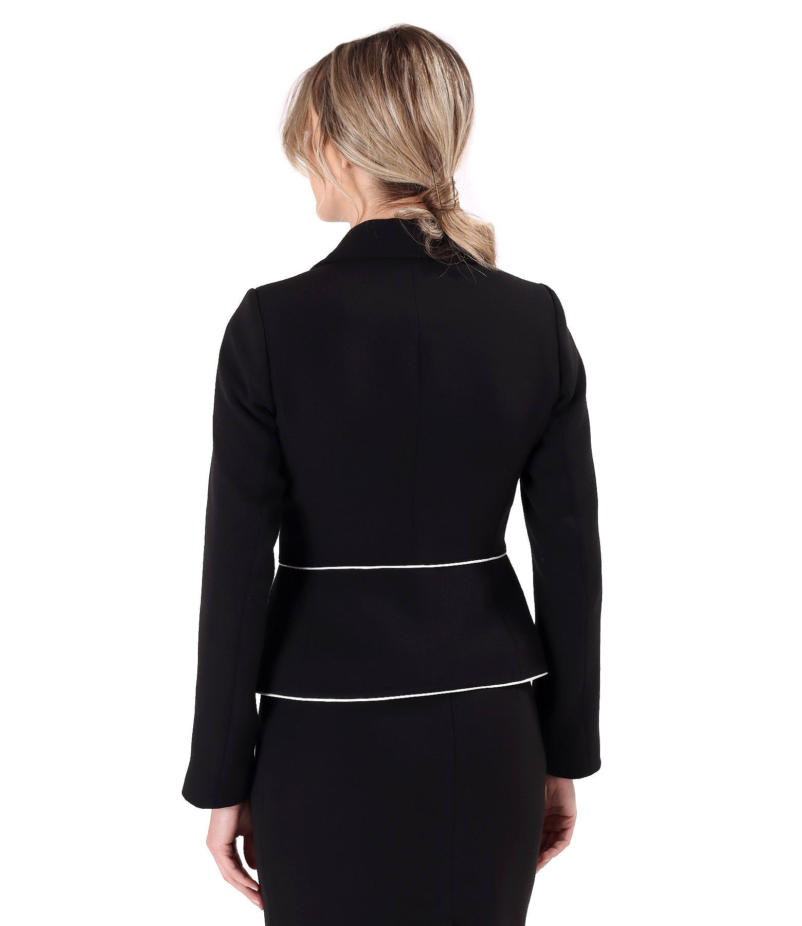 Sacou din stofa elastica cu viscoza, cu guler si revere rotunjite, cu doua clape in talie si garnitura in contrast. Se inchide cu un nasture pe fata.