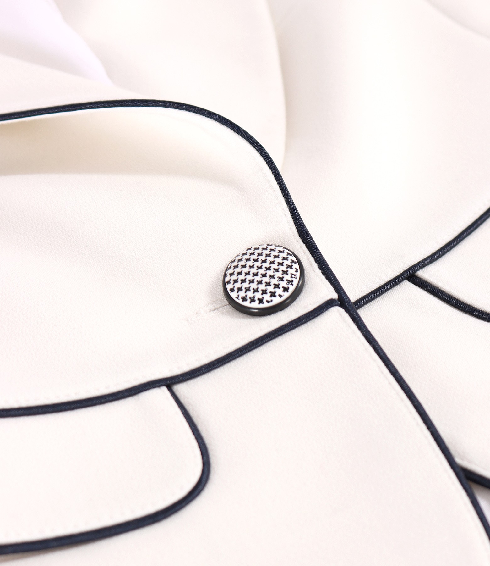 Sacou din stofa elastica cu viscoza, cu guler si revere rotunjite, cu doua clape in talie si garnitura in contrast. Se inchide cu un nasture pe fata.