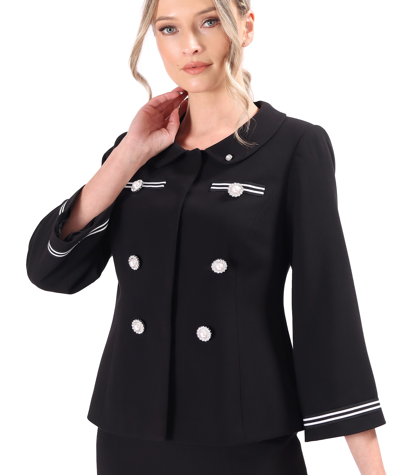 Sacou elegant din stofa elastica cu viscoza, cu nasturi decorativi cu perle, guler rotund, maneci semi-lungi usor evazate cu banda elastica decorativa. Se inchide cu 5 capse pe fata.