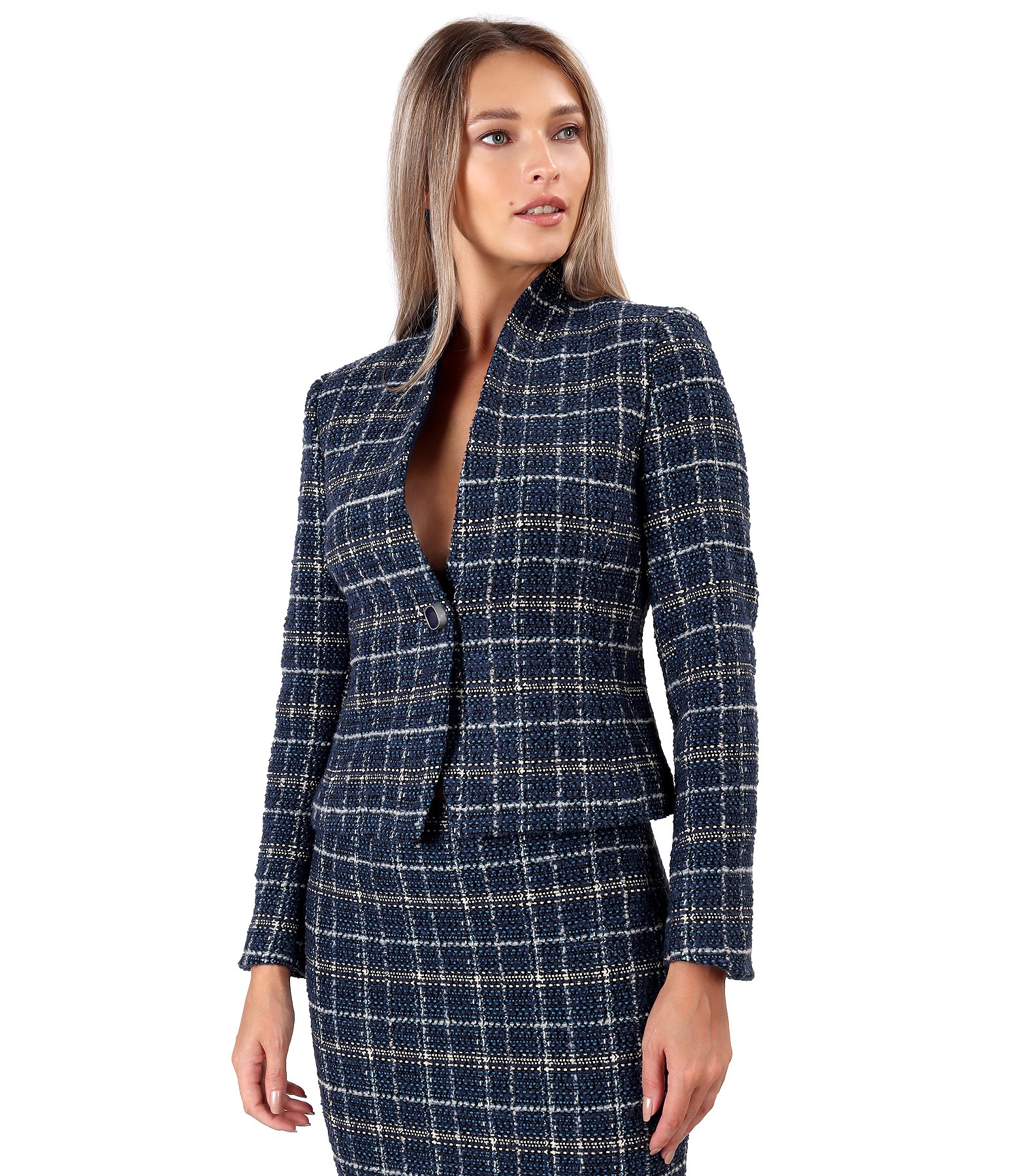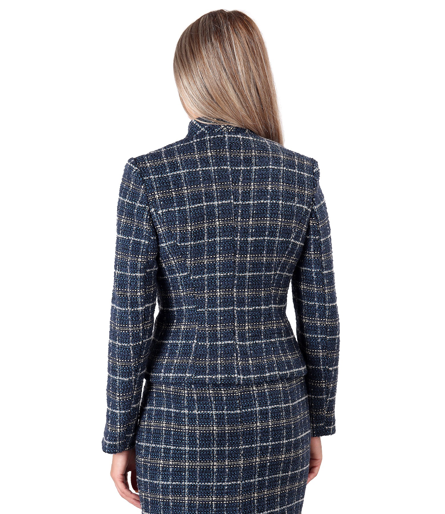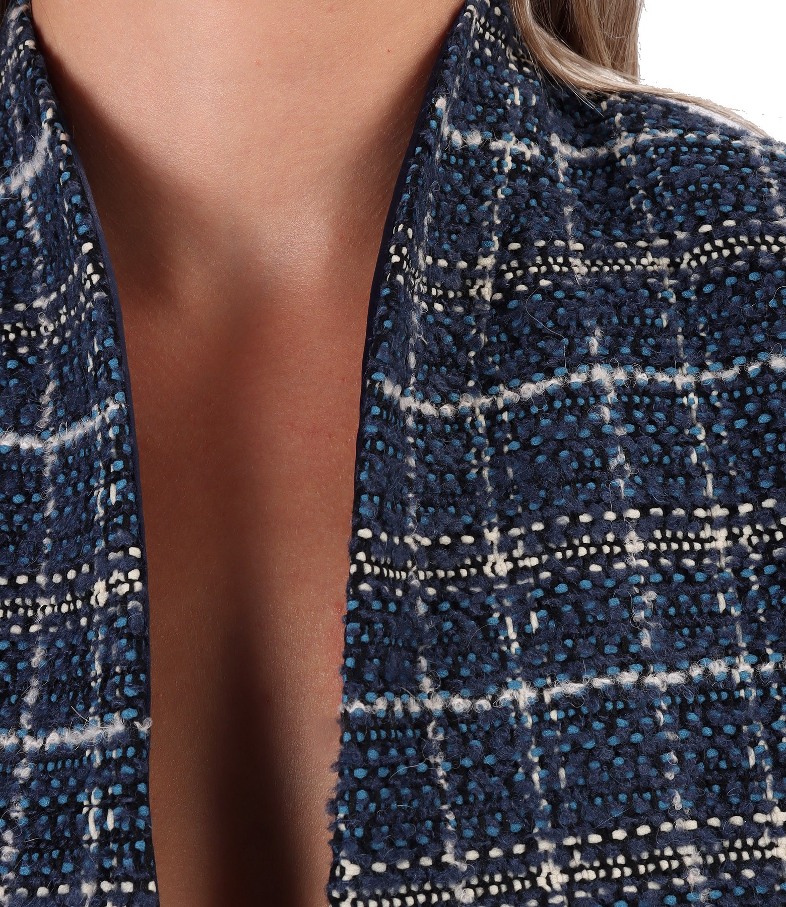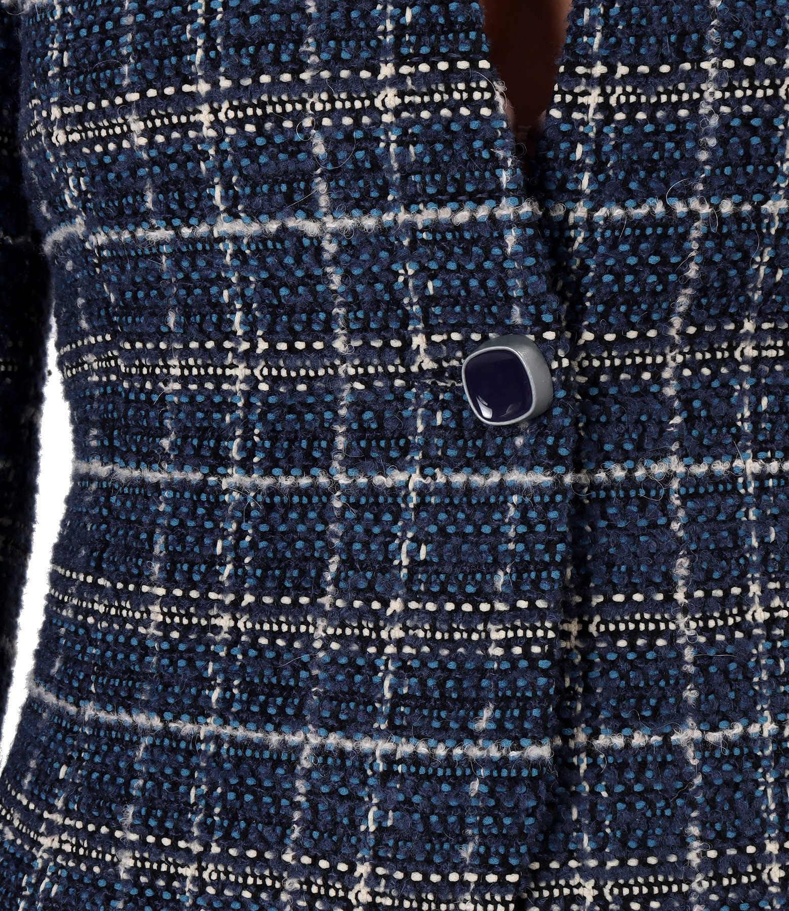 Sacou elegant in carouri, din amestec lana si alpaca, captusit, cu guler gen tunica. Se inchide cu un nasture.