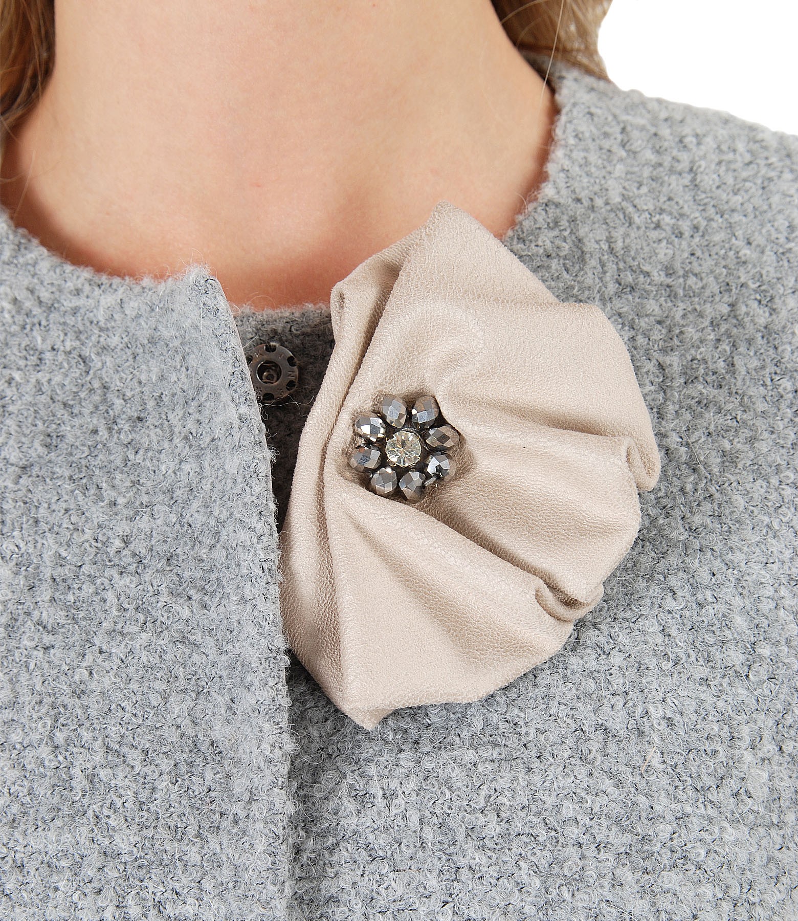 Sacou fara guler din bucle cu lana si alpaca, captusit, cu decolteu pe langa gat, cu brosa accesoriu detasabila, cu aplicatie de cristale pe partea dreapta. Se inchide cu 5 capse mos-baba pe fata.