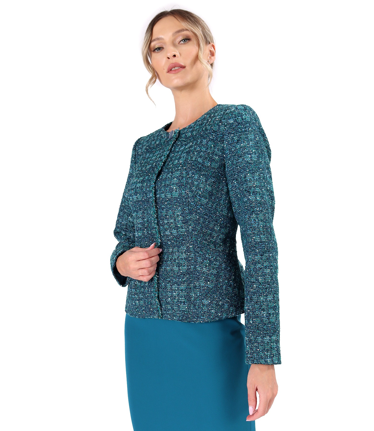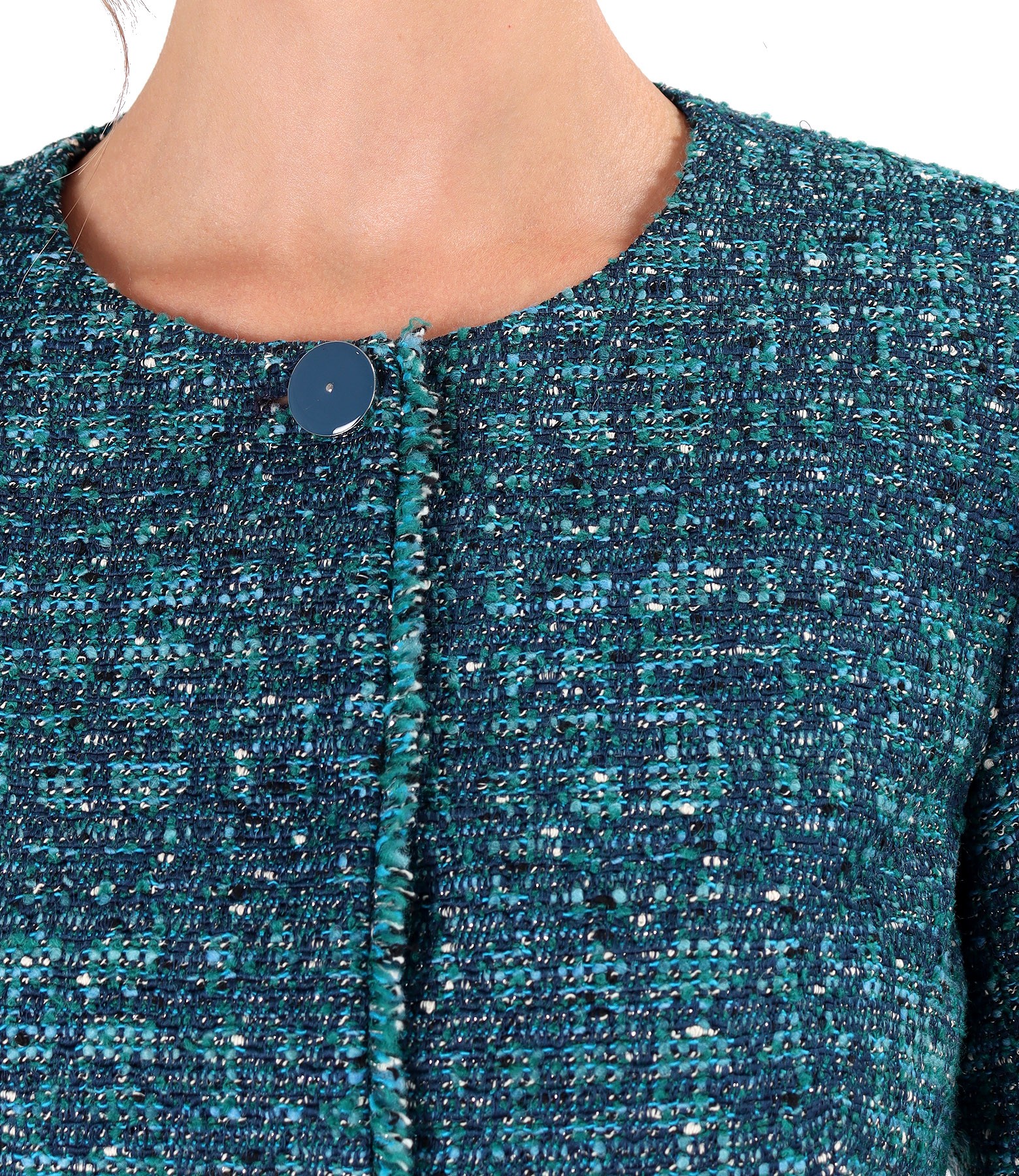 Sacou elegant din bucle cu lana si fir de lurex, fara guler, captusit, cu decolteu pe langa gat cu un nasture decorativ, si cu franjuri pe mijloc fata. Se inchide cu 5 capse mos-baba pe fata.
