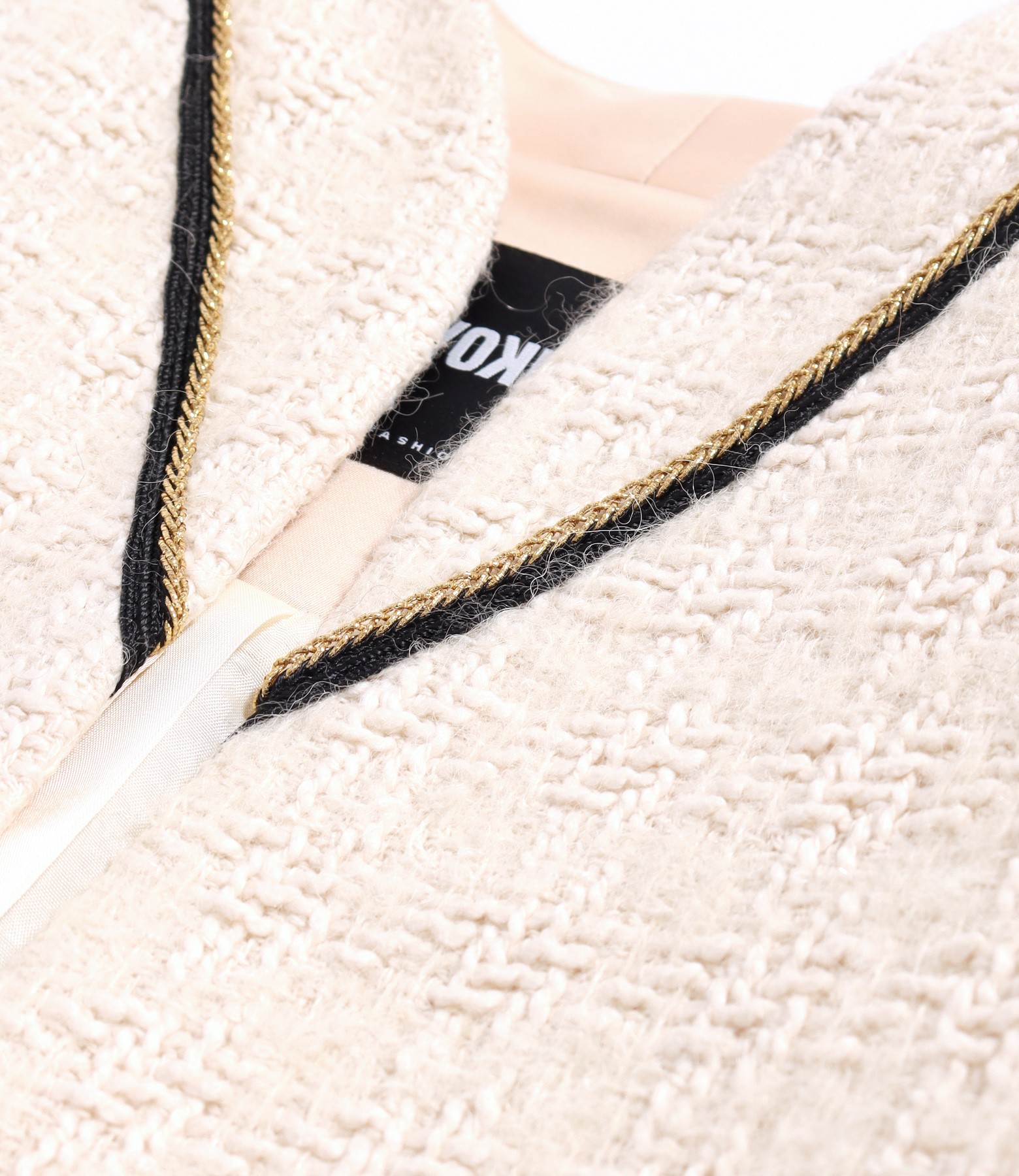 Sacou elegant din bucle cu lana virgina si alpaca, captusit, cu guler gen tunica si garnituri la decolteu si la maneci. Se inchide cu un nasture pe fata.
